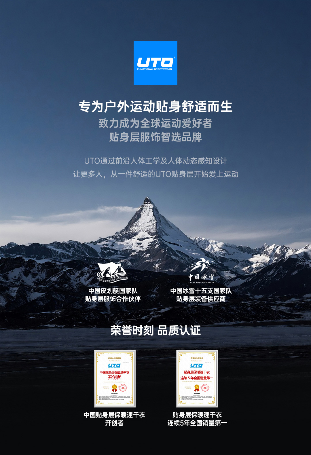 UTO悠途潜心于贴身运动装备的研发、设计和生产。从纤维到组织,从设计到工艺,在无缝贴身运动装备领域,树立国内标杆。 UTO着力于品牌互联网化,不断采集大量运动数据,为跑步、健身、滑雪等不同类型的运动爱