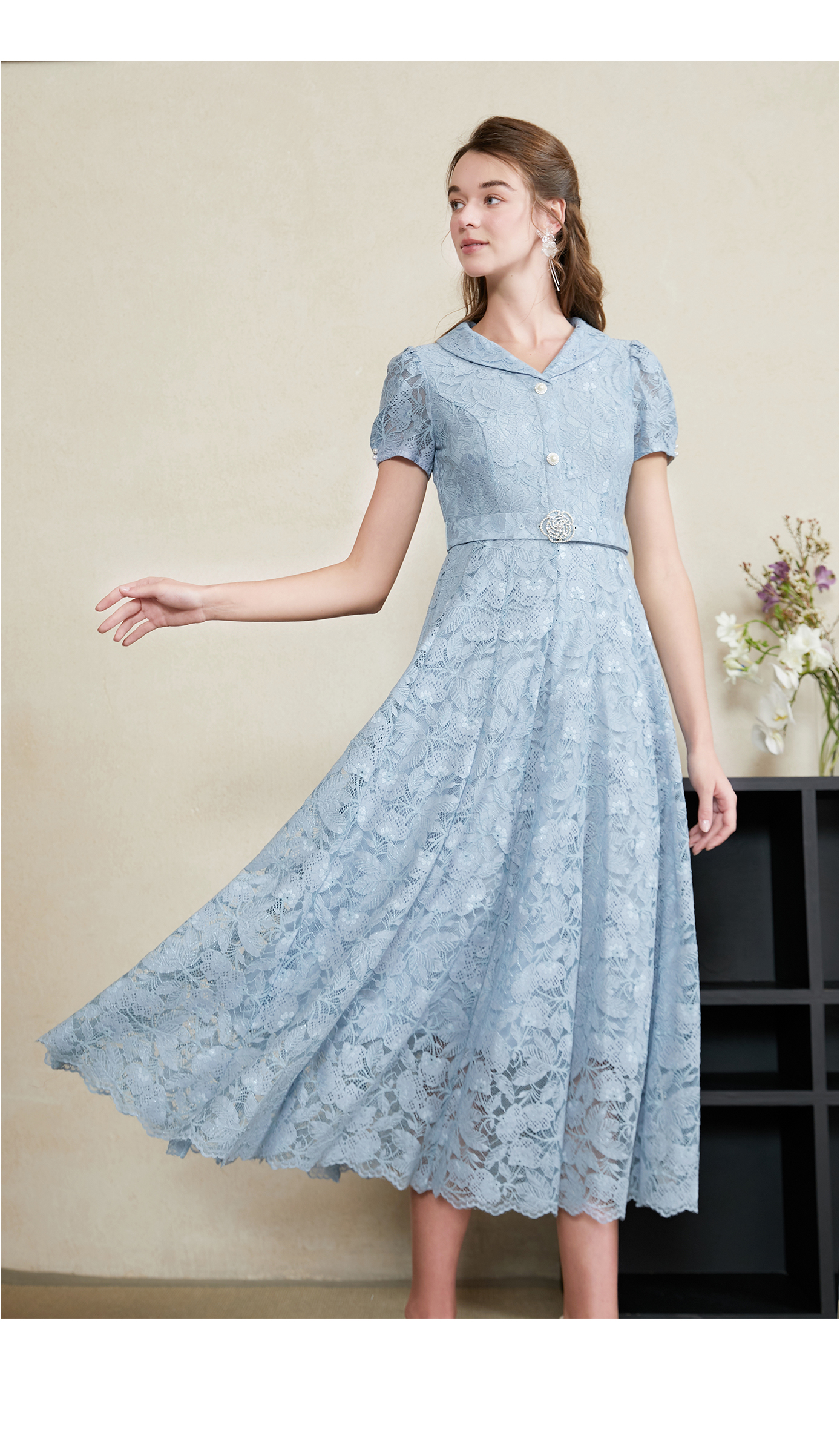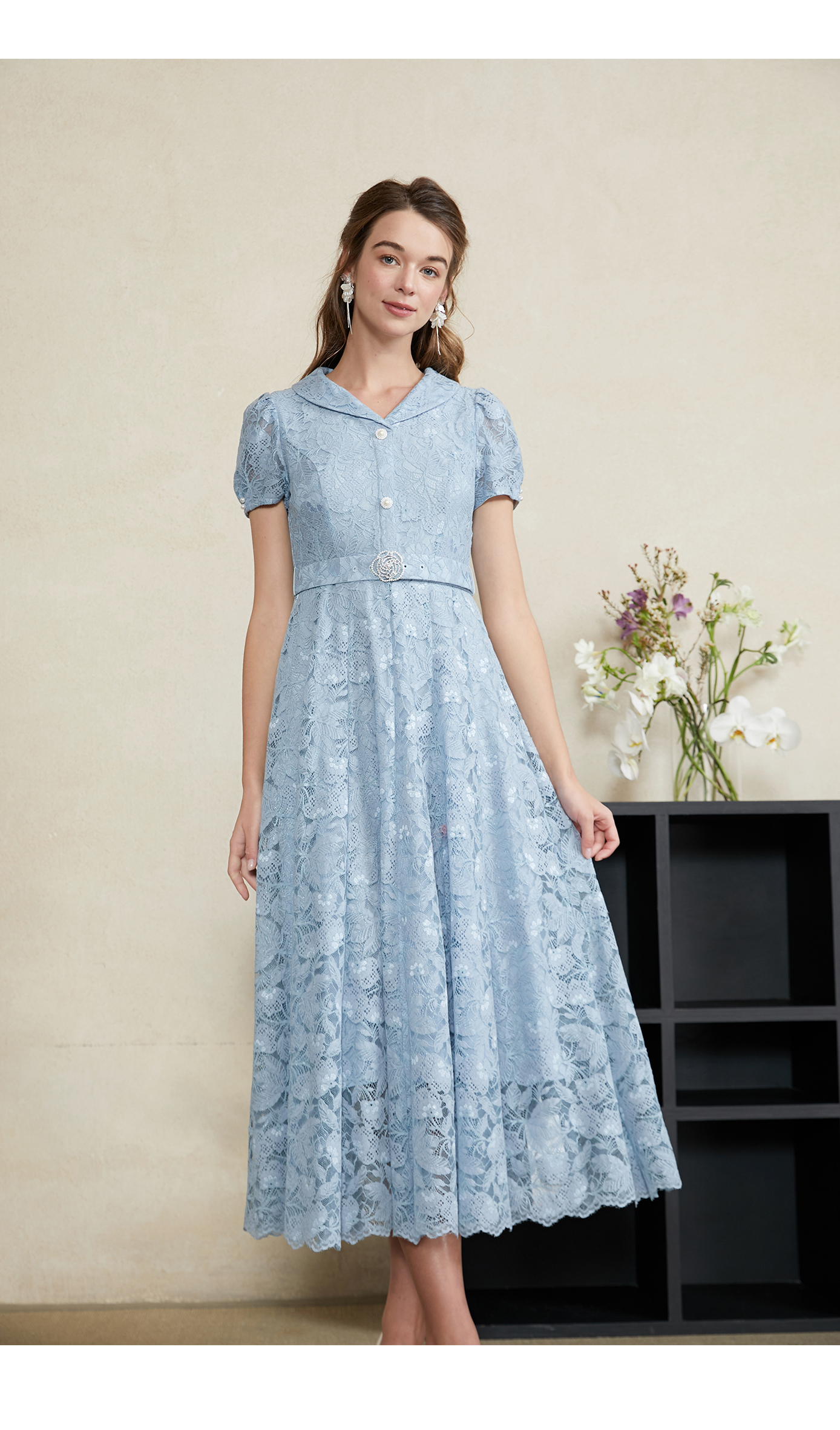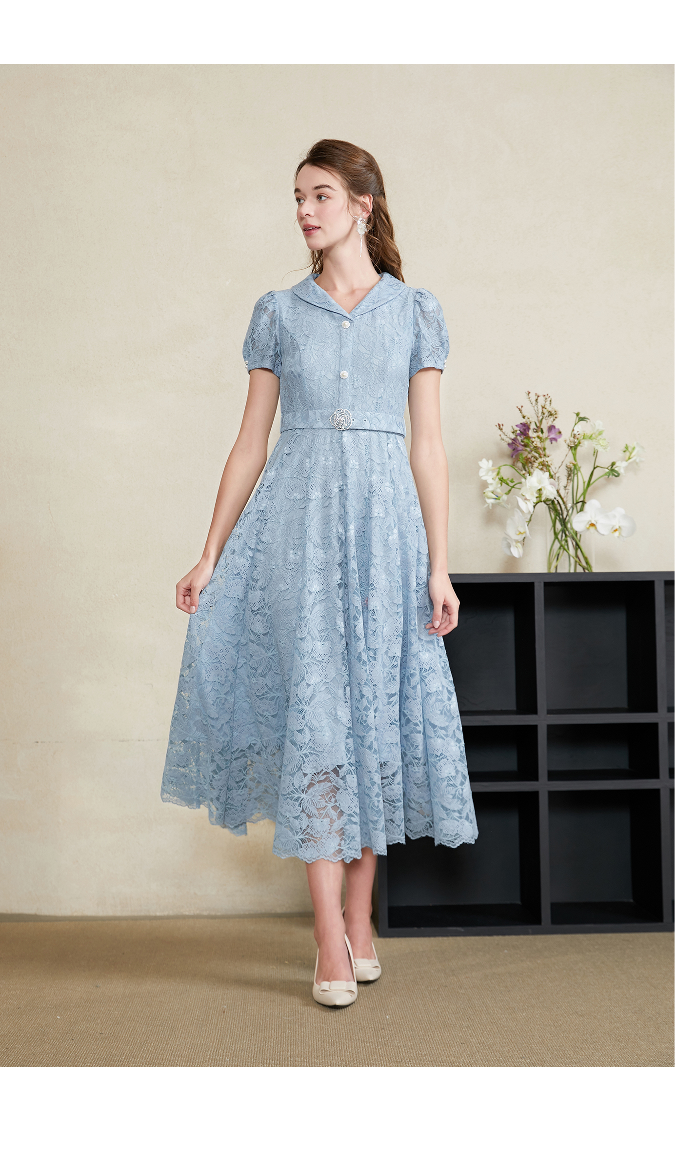 司歌蕾丝收腰连衣裙翻领腰带长裙A911135X