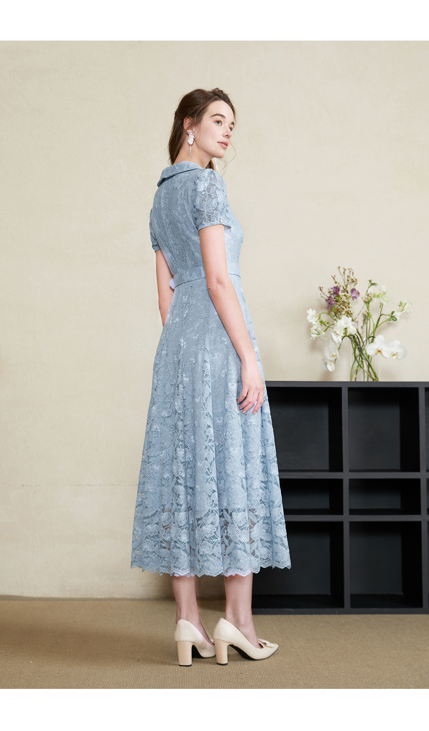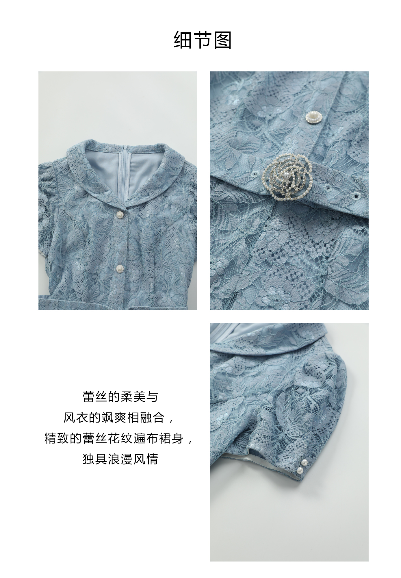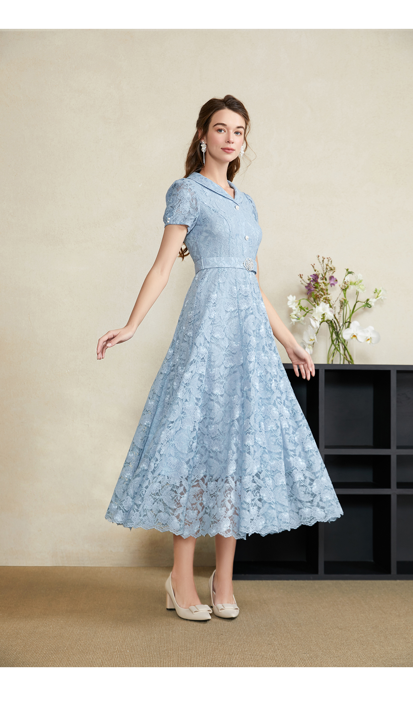 司歌蕾丝收腰连衣裙翻领腰带长裙A911135X