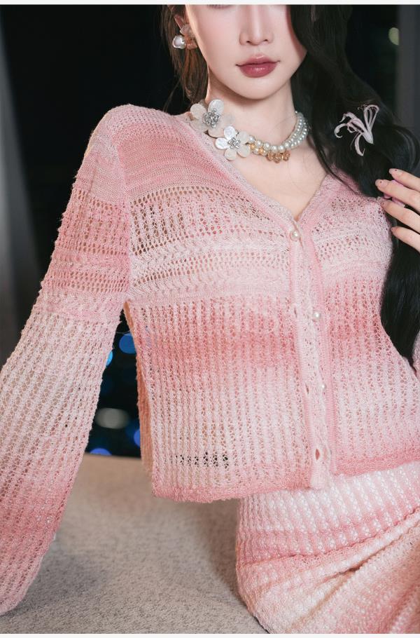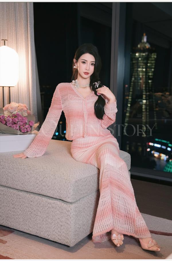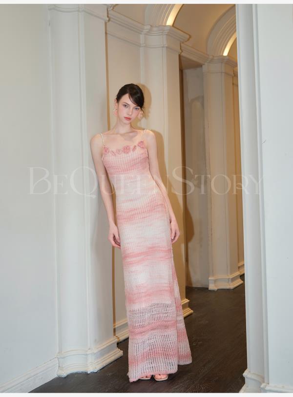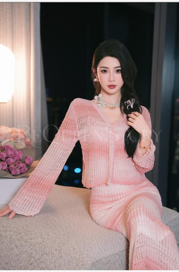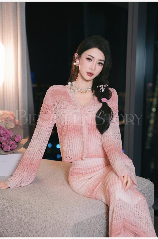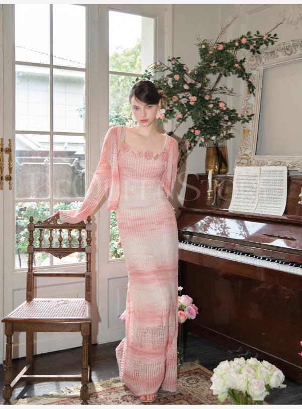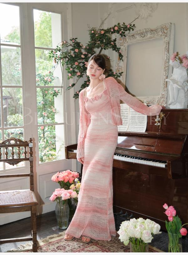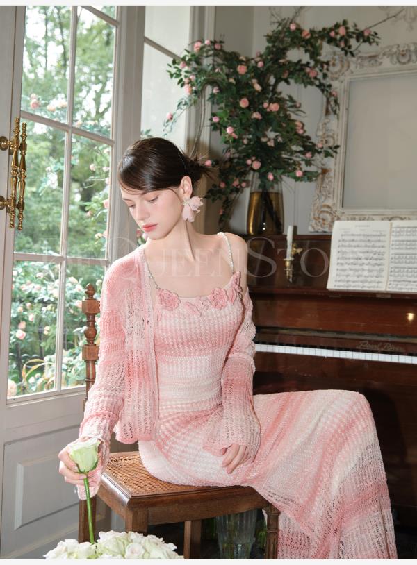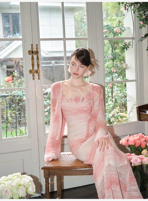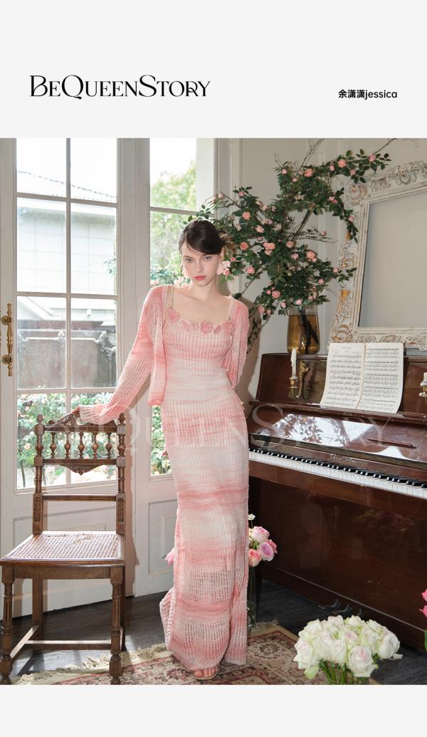 余潇潇【玫瑰晚霞】2025春装新款针织显瘦仙女时尚绵羊毛连衣裙套装