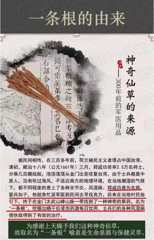 可以说“一条根”浑身都是宝,能医治百病。后来、士兵门为了感谢上天赐予我们这种神奇仙草为“一条根”又产于金门,故取名为“金门一条根”。