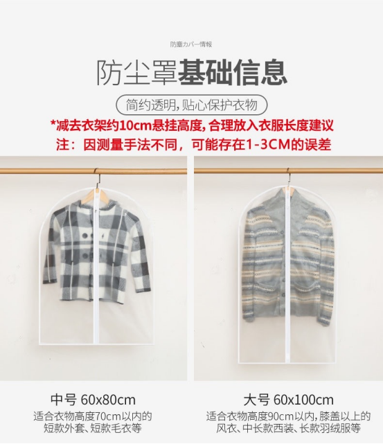 多款规格 根据衣服长短选择不同尺寸的防尘罩 大人小孩衣物均可用 多种场所都能用