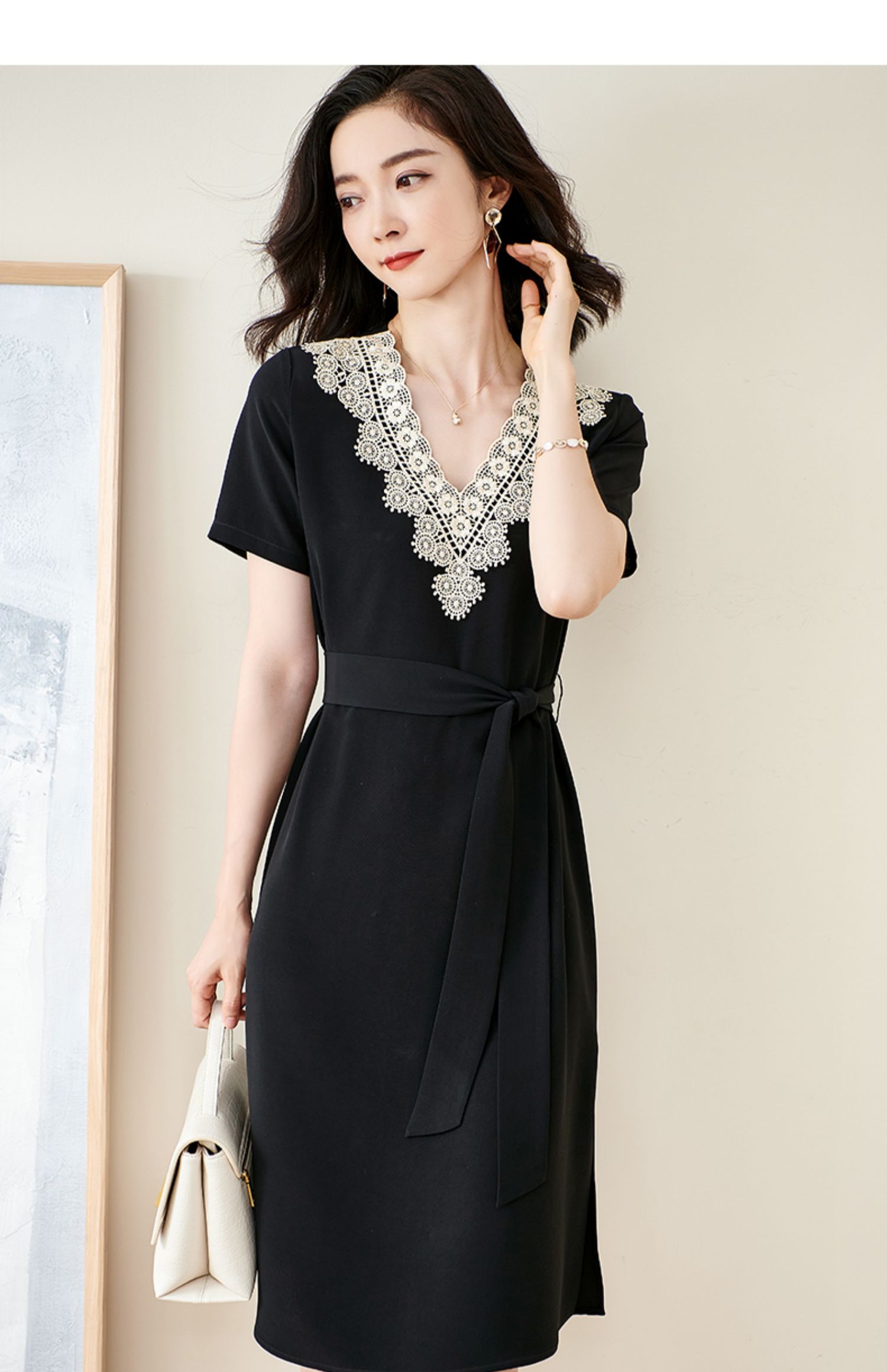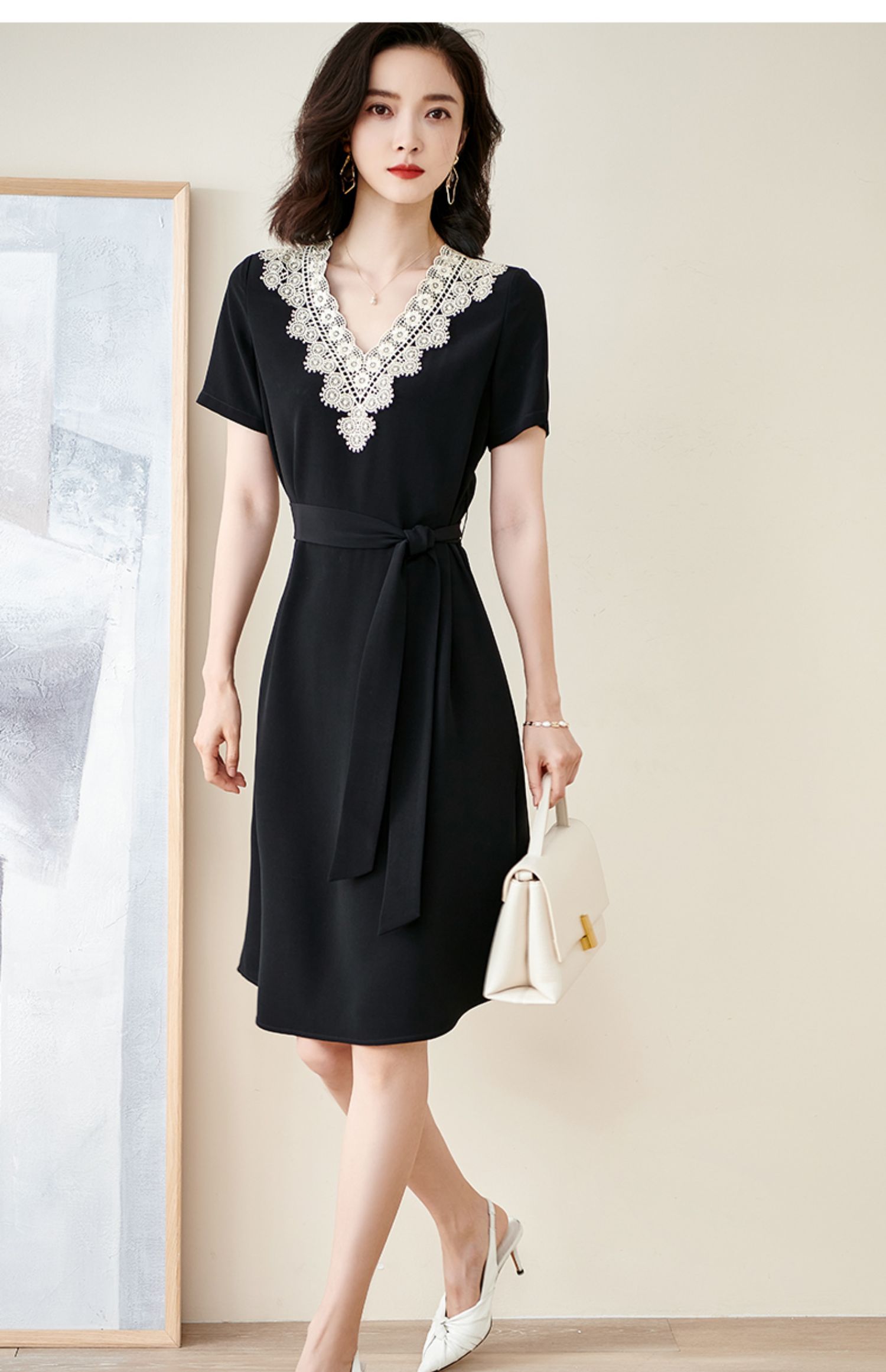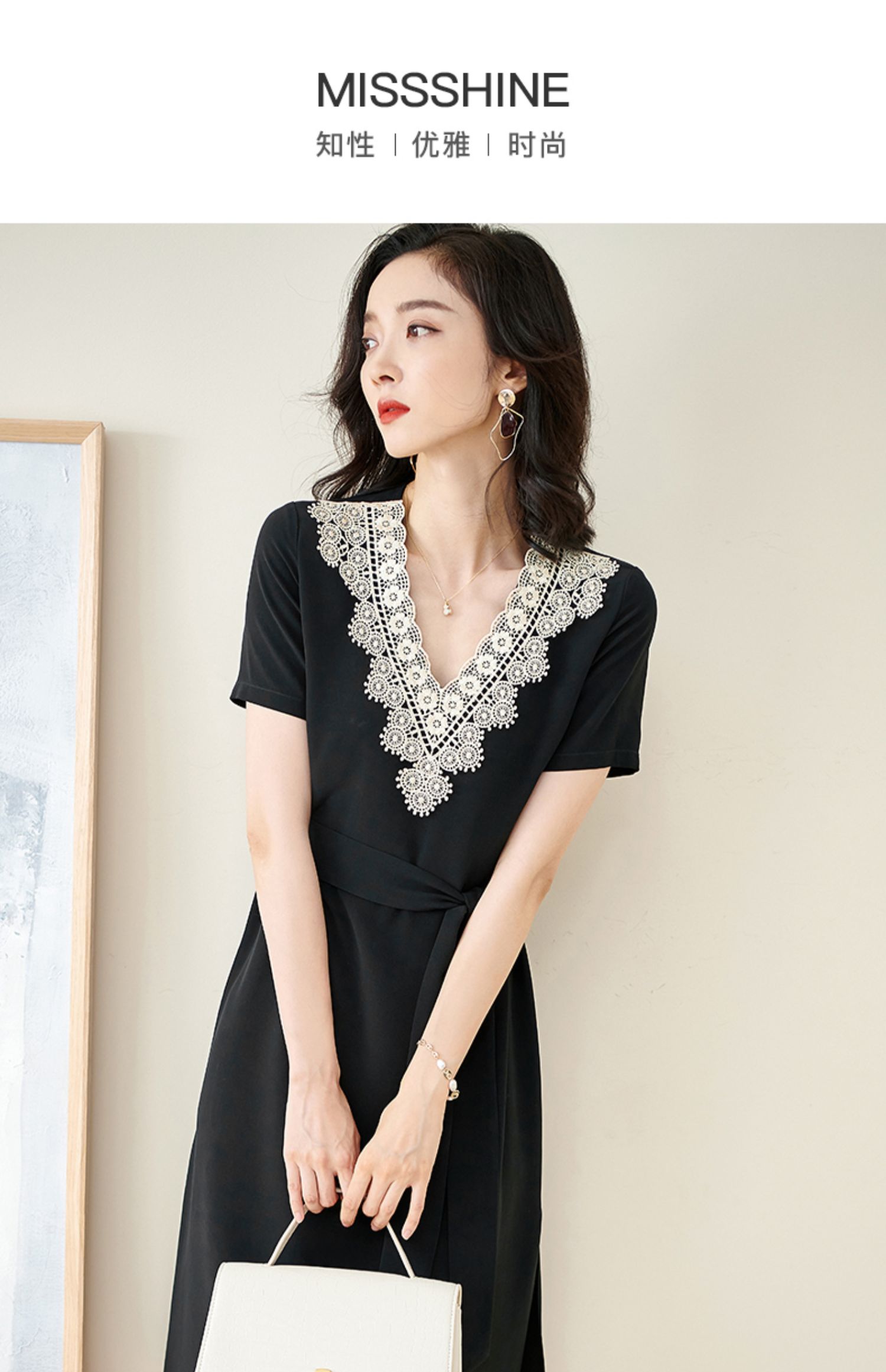 剩S 米思阳2025夏季新款法式优雅拼接蕾丝V领收腰系带醋酸连衣裙1204