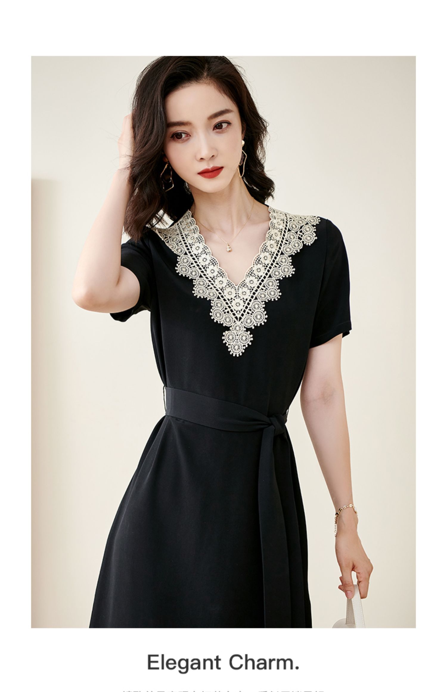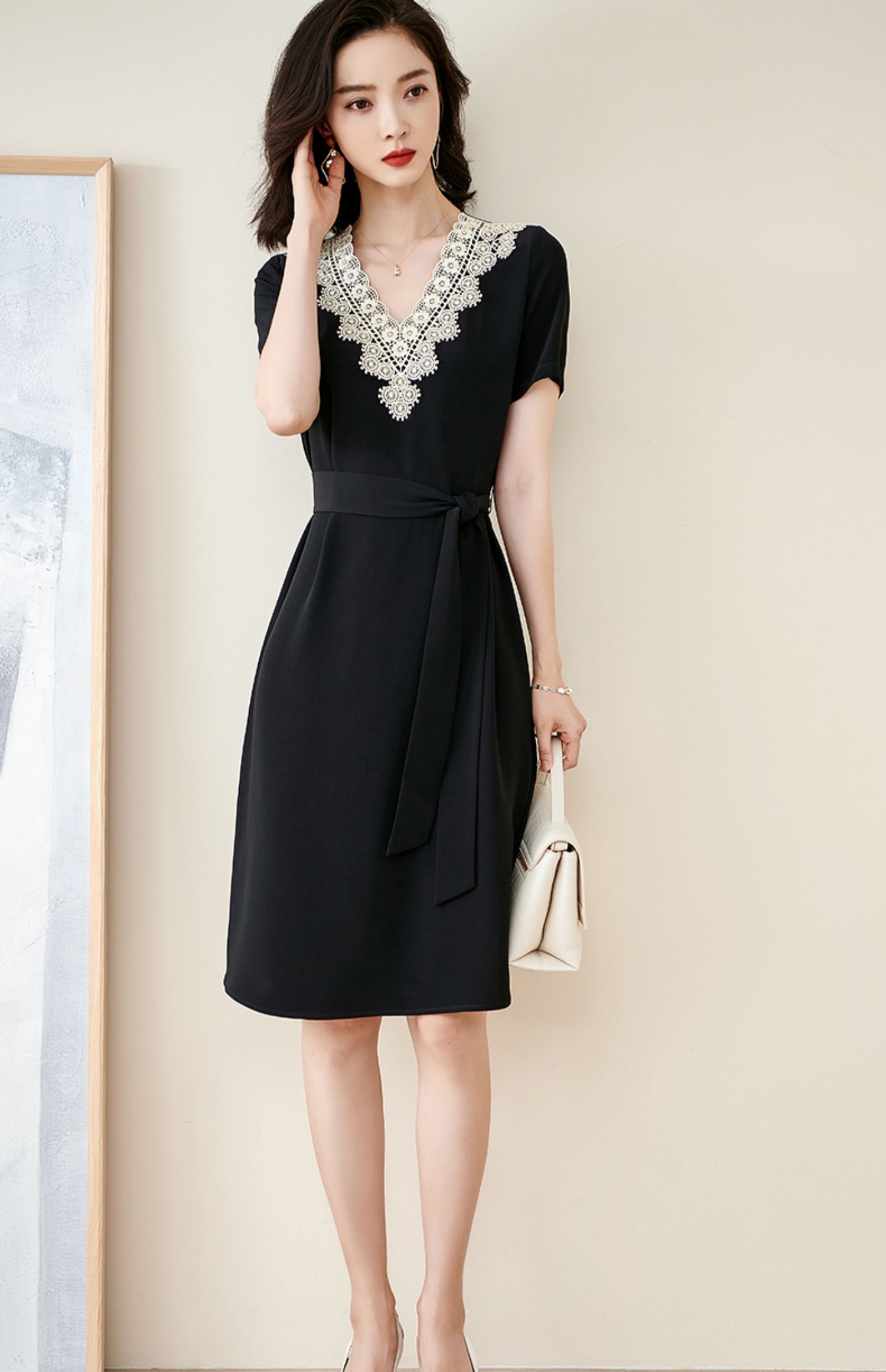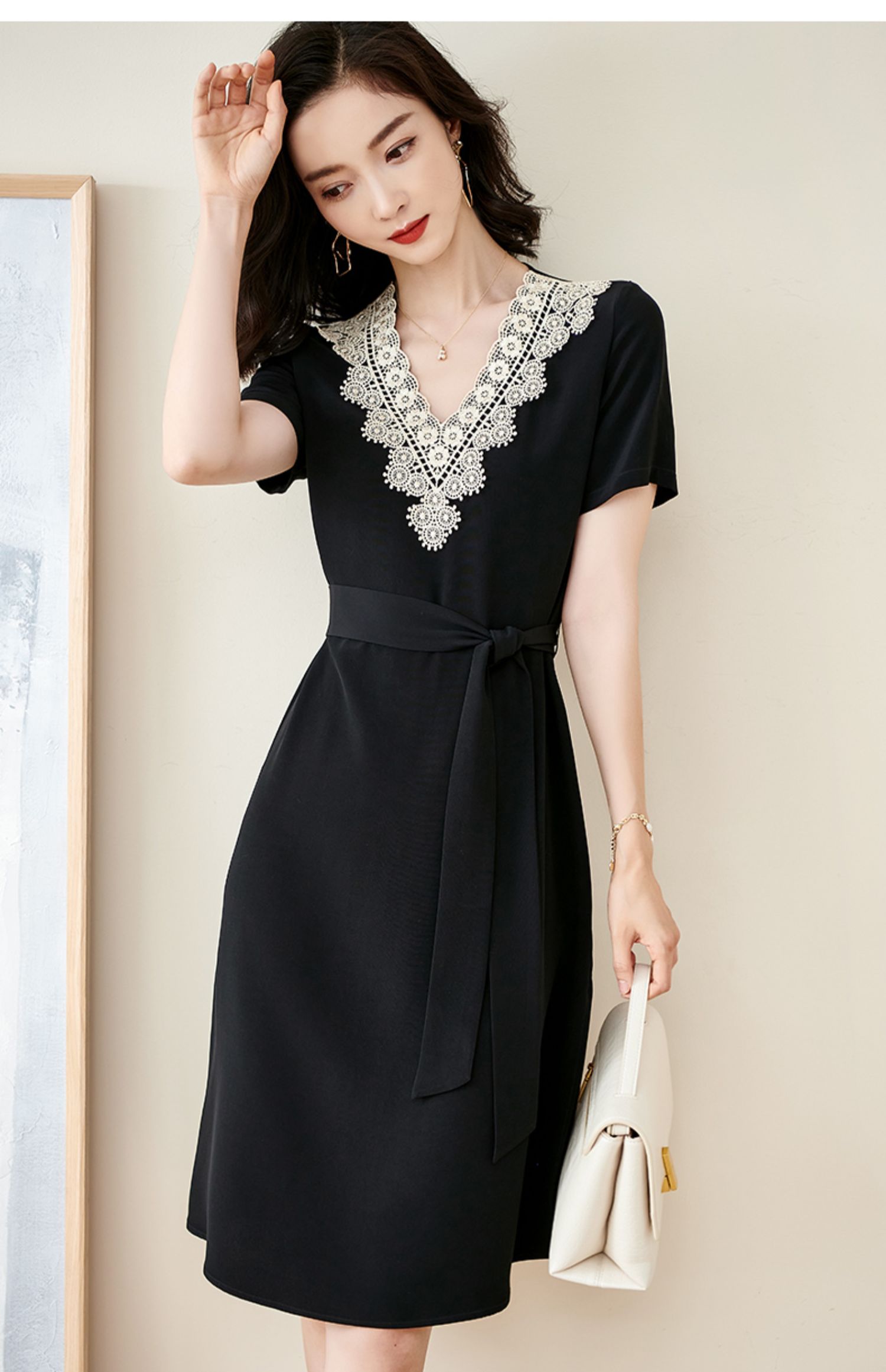 剩S 米思阳2025夏季新款法式优雅拼接蕾丝V领收腰系带醋酸连衣裙1204