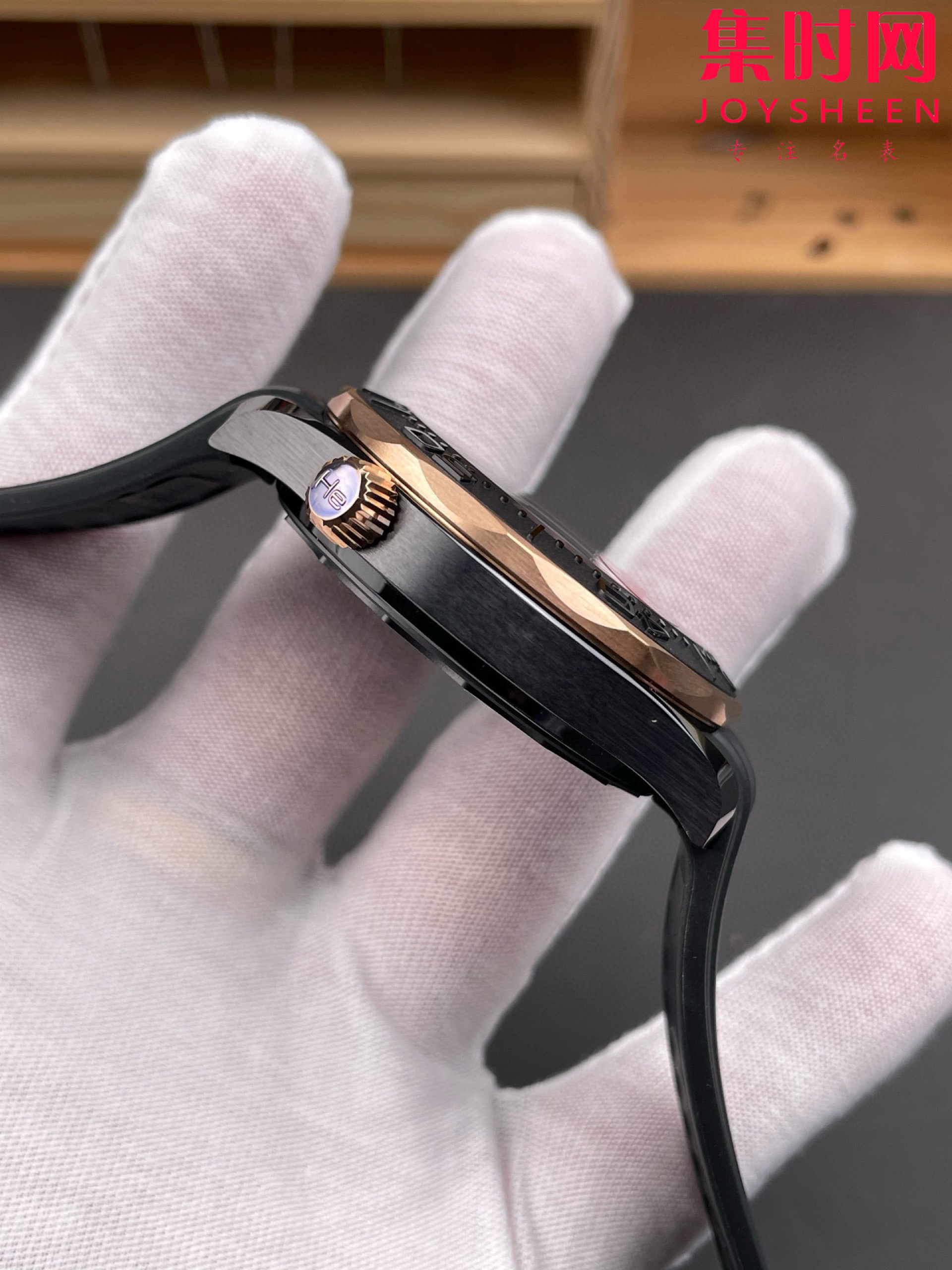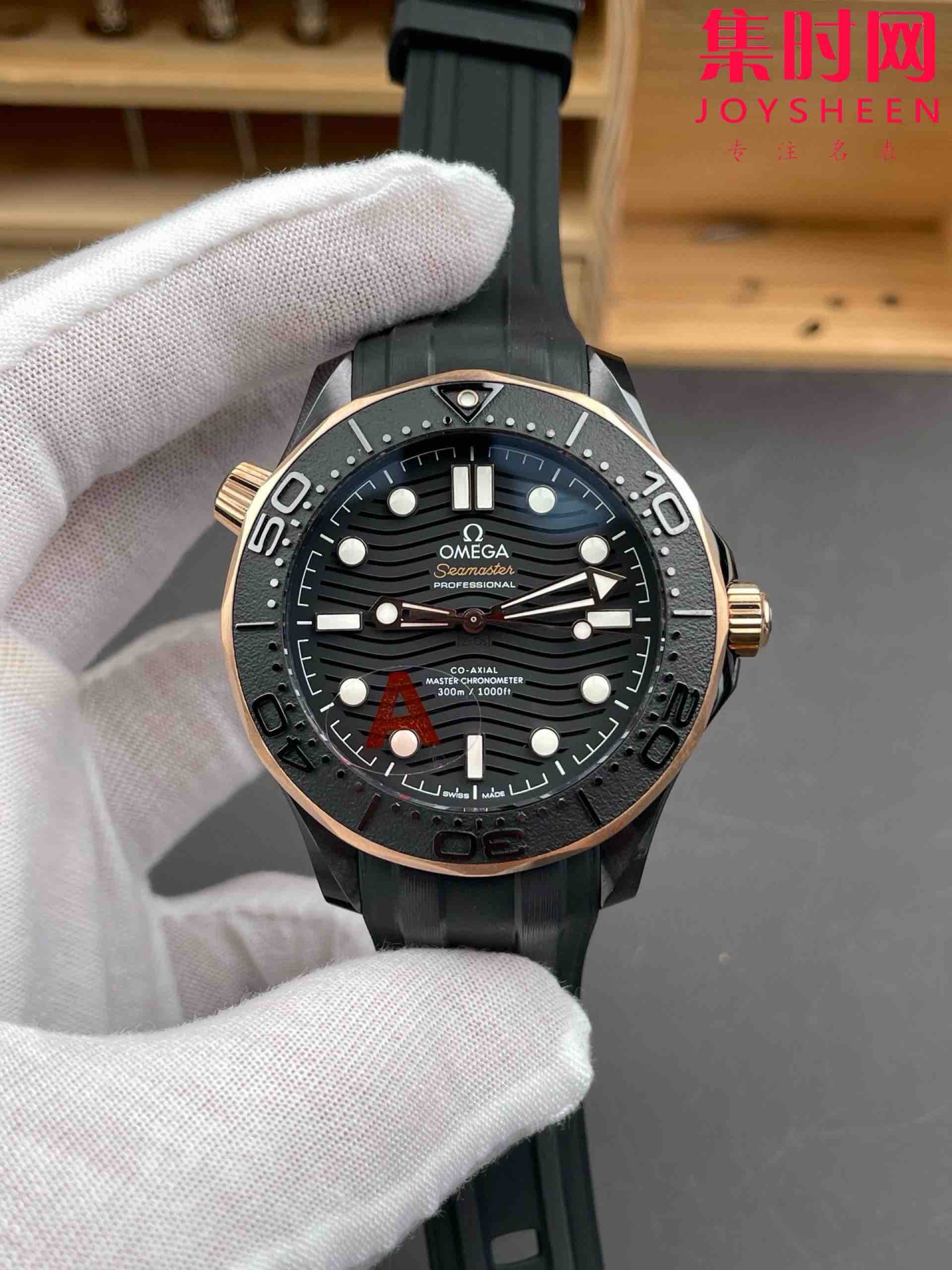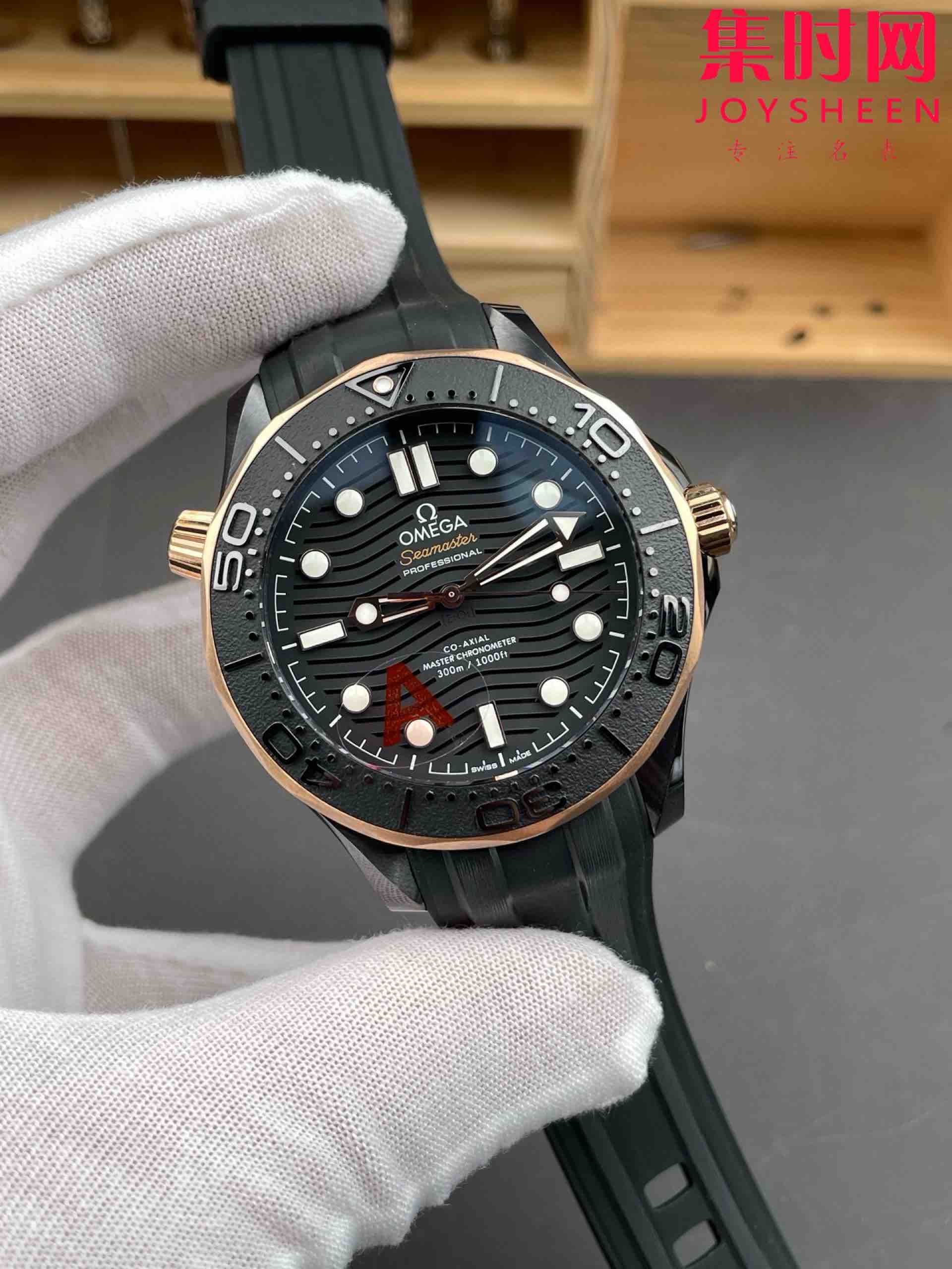 墨黑海马 桀骜登场 欧米茄新品VS海马300米系列 间玫金陶瓷海马 男士腕表 8806一体机 表径43.5mm 表壳、表圈、波纹图案表盘均采用黑色氧化锆1Zr021陶瓷制成。镂空指针及12点位的圆点,均覆有Super-LumiNova夜光涂层。蓝宝石水晶镜面 天然橡胶表带 机芯的运转美态清晰可见。透过采用波纹边缘设计的蓝宝石玻璃表背,可以欣赏到VS定制Cal.8806一体全自动机械机芯。 亮点:直接在陶瓷表壳生牙,把管直接拧上陶瓷壳,这样不会掉把管,防水效果更出色。底盖也是直接直接拧在陶瓷壳上,整壳陶瓷打造,不用再加金属中胆!