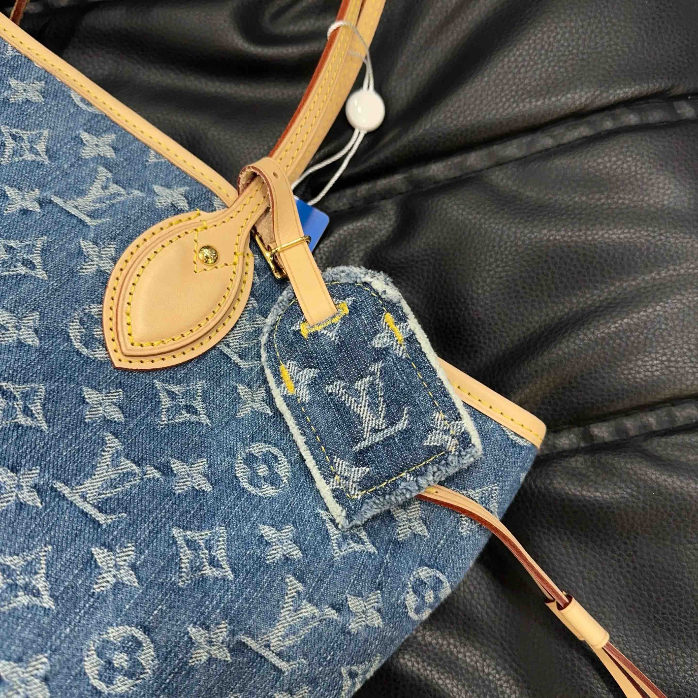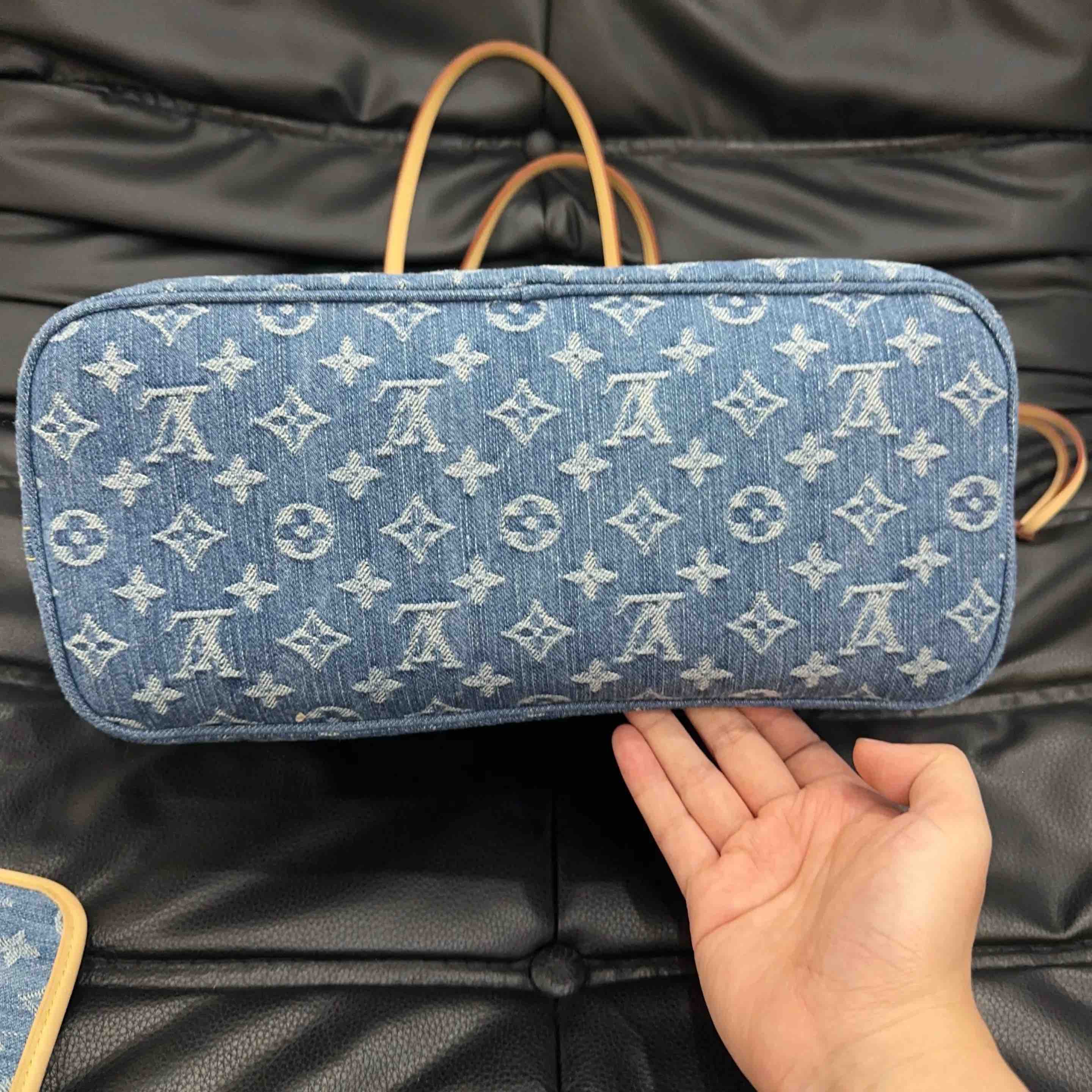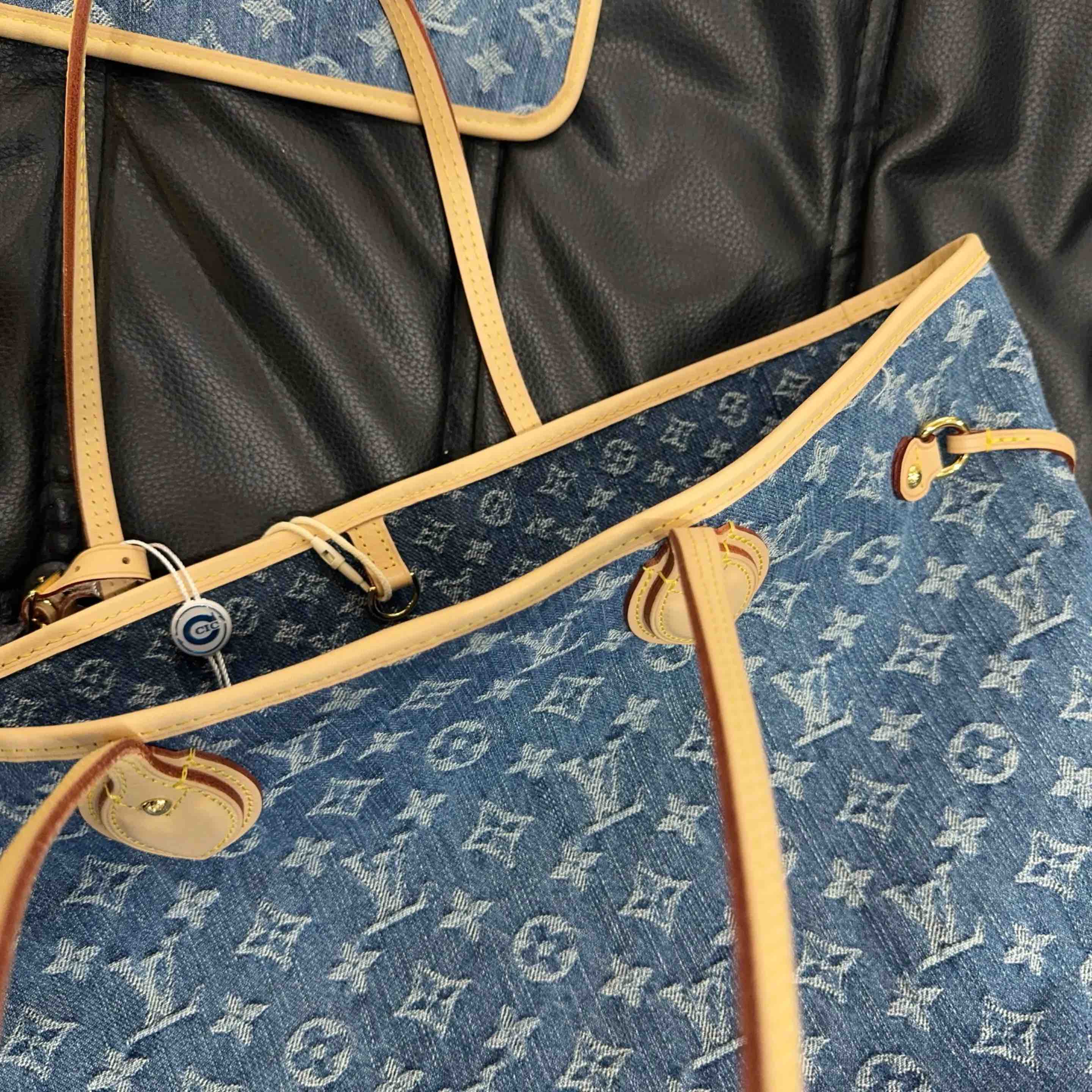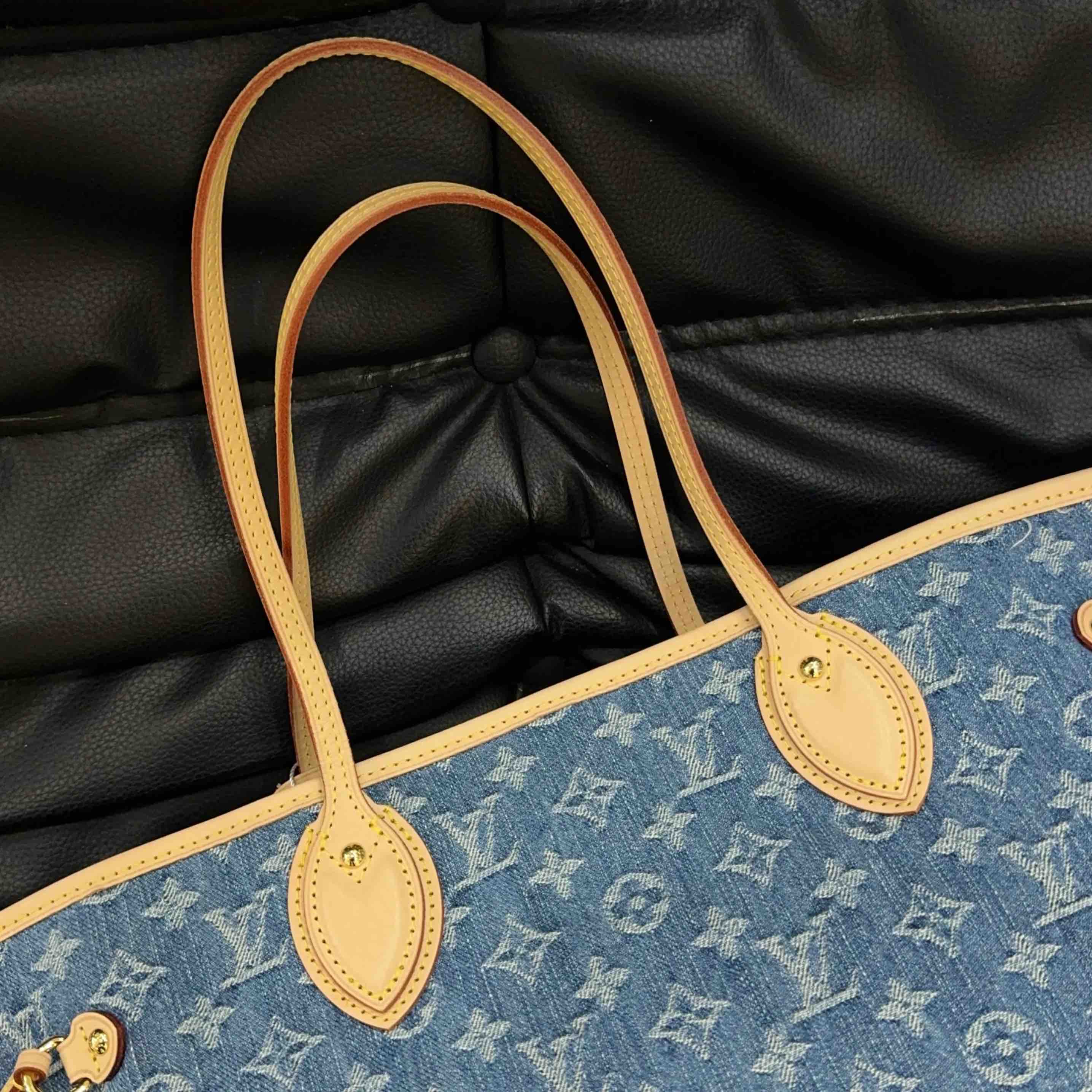 【商品详情】正品二手 LV Neverfull 中号 蓝色 老花 丹宁拼植鞣革 购物袋💙 99新 33×28 芯片款 配件:子袋 防尘袋。25年6月新款 通勤出街全能托特