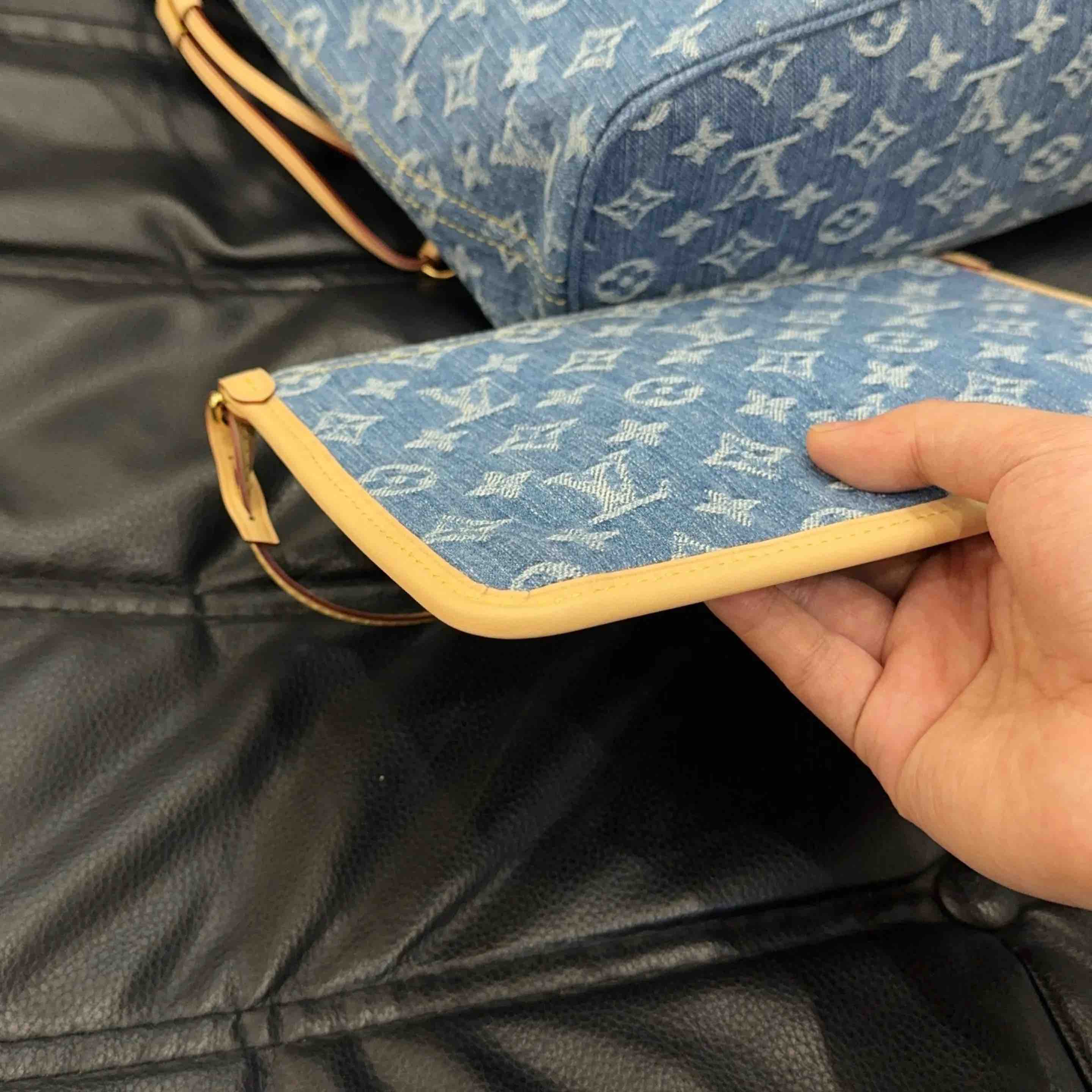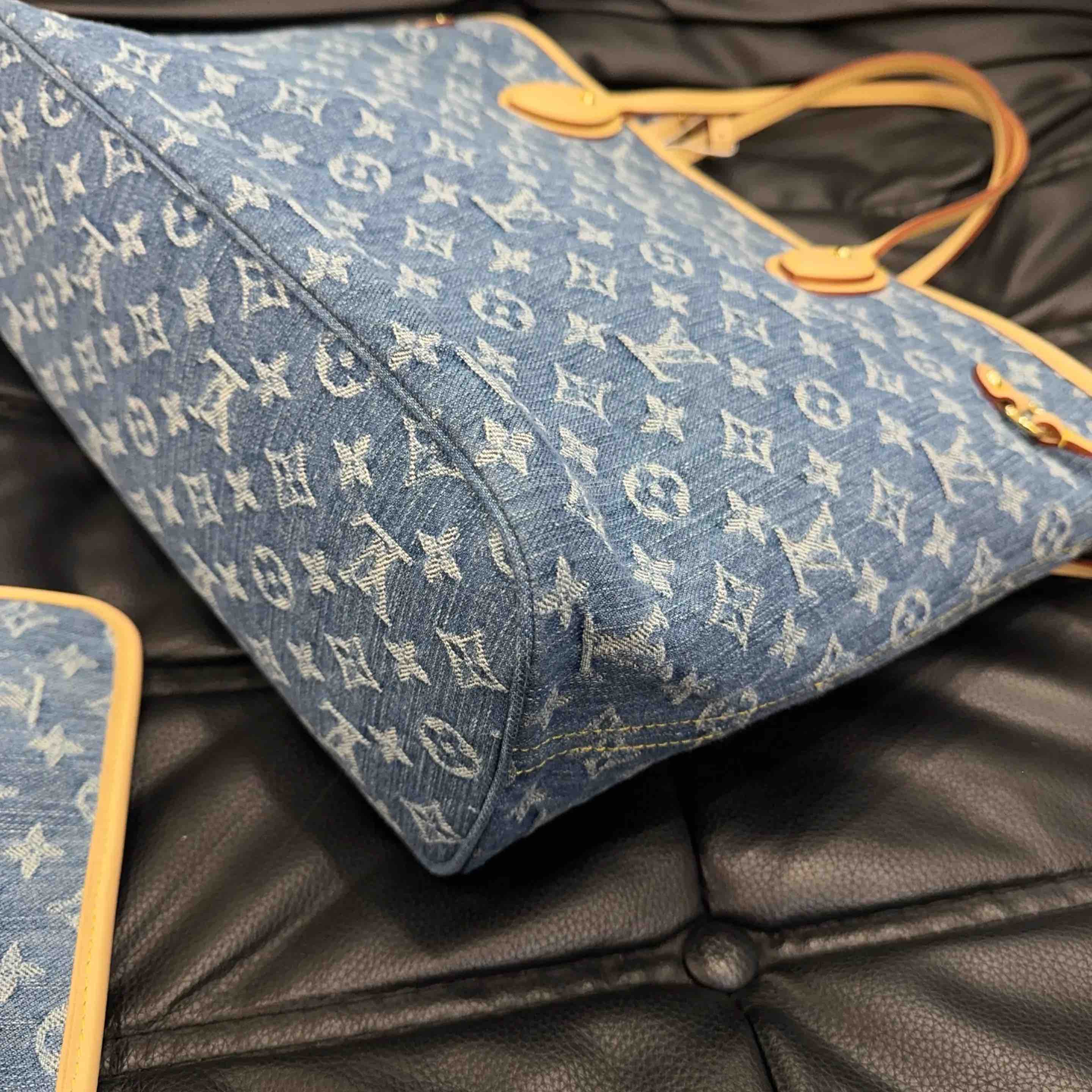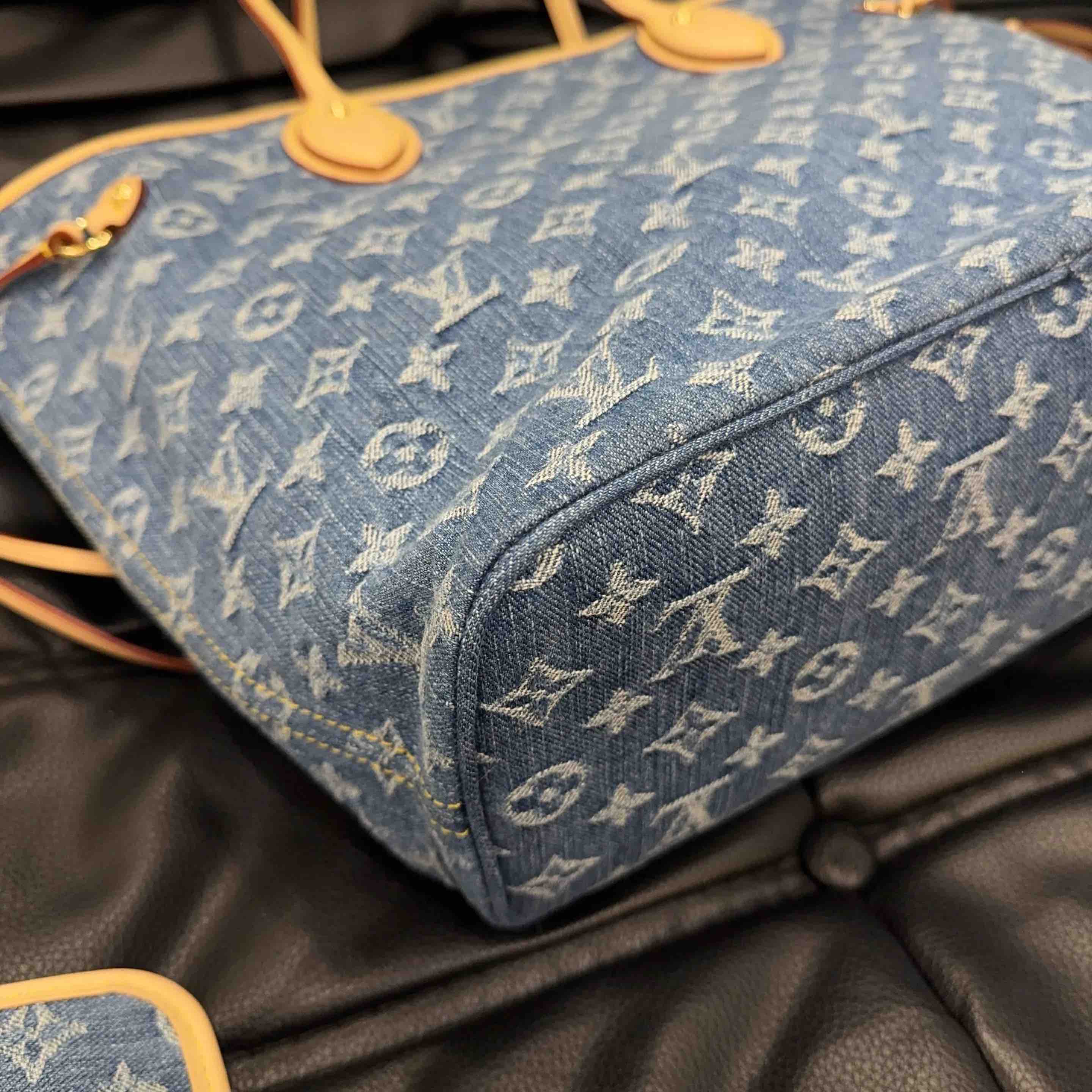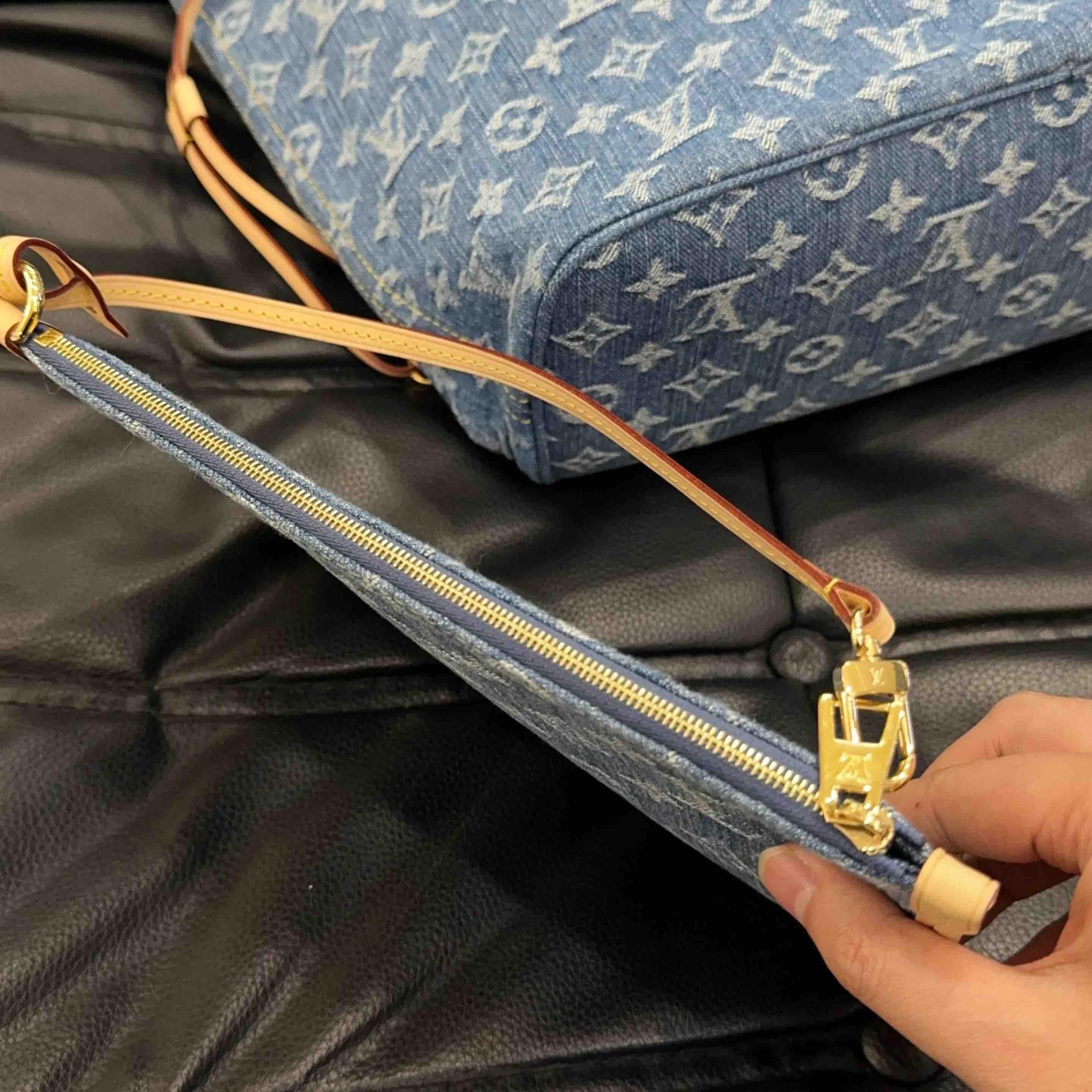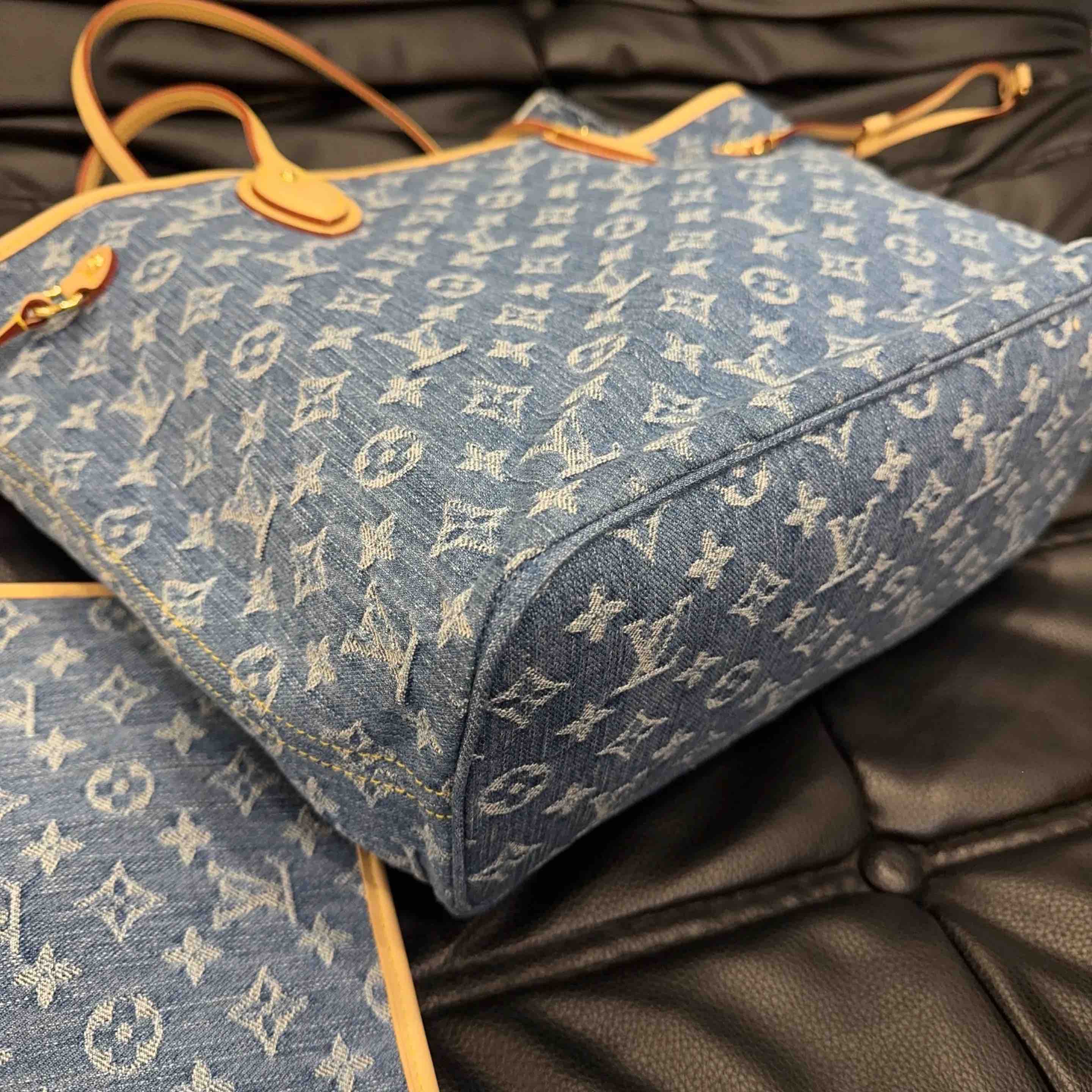【商品详情】正品二手 LV Neverfull 中号 蓝色 老花 丹宁拼植鞣革 购物袋💙 99新 33×28 芯片款 配件:子袋 防尘袋。25年6月新款 通勤出街全能托特
