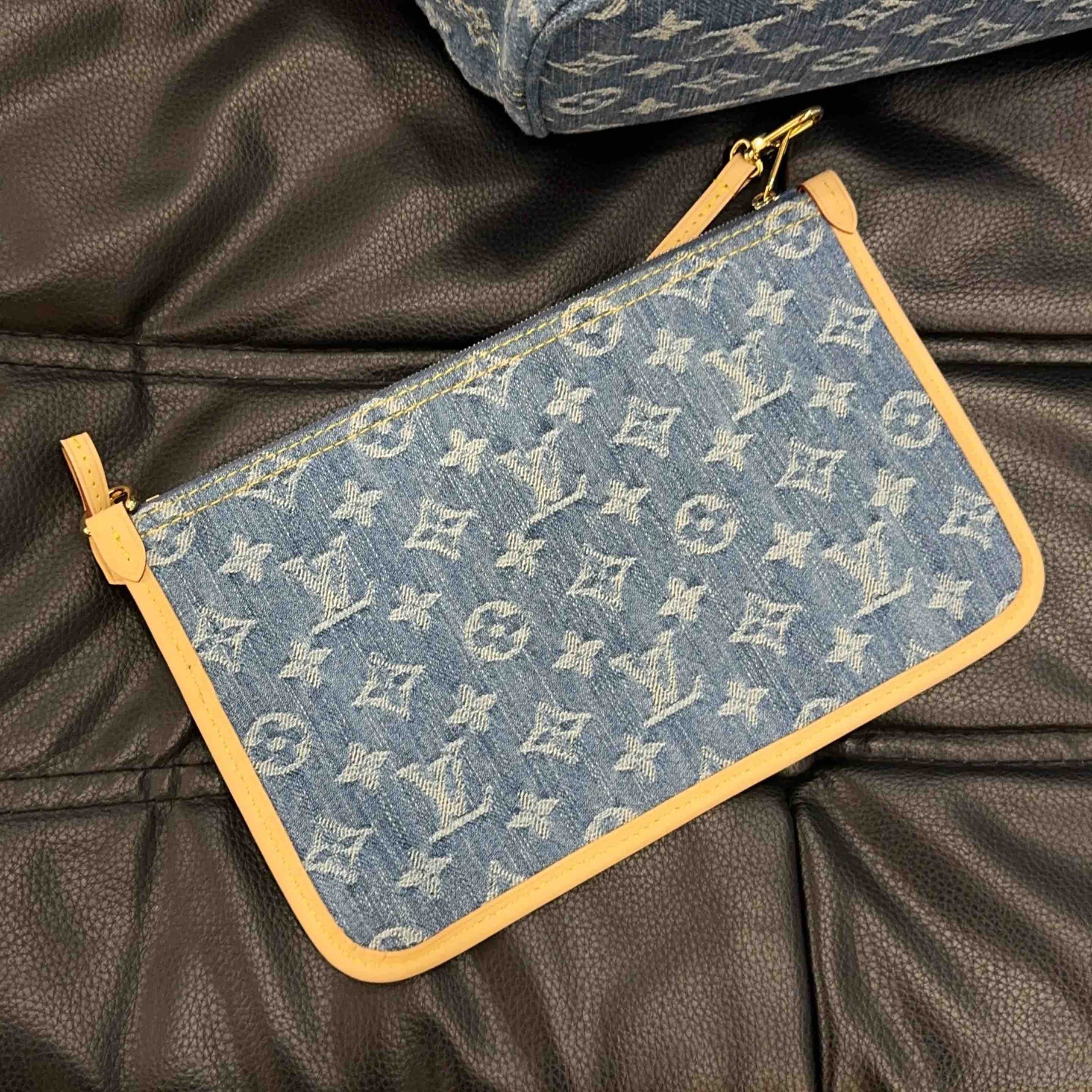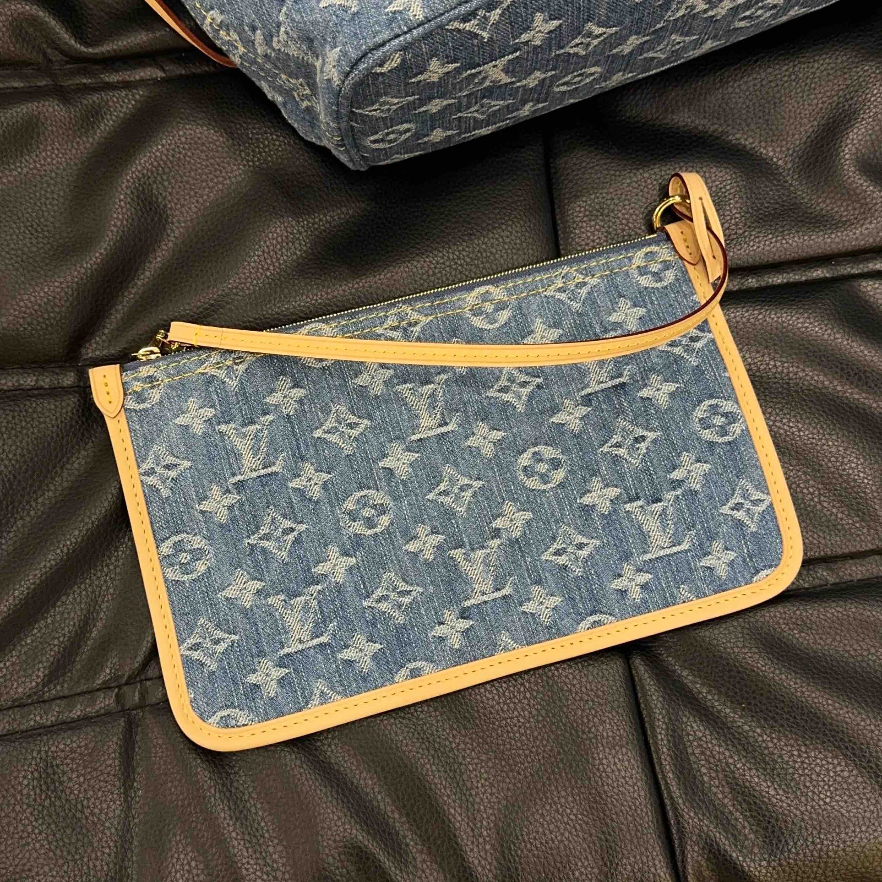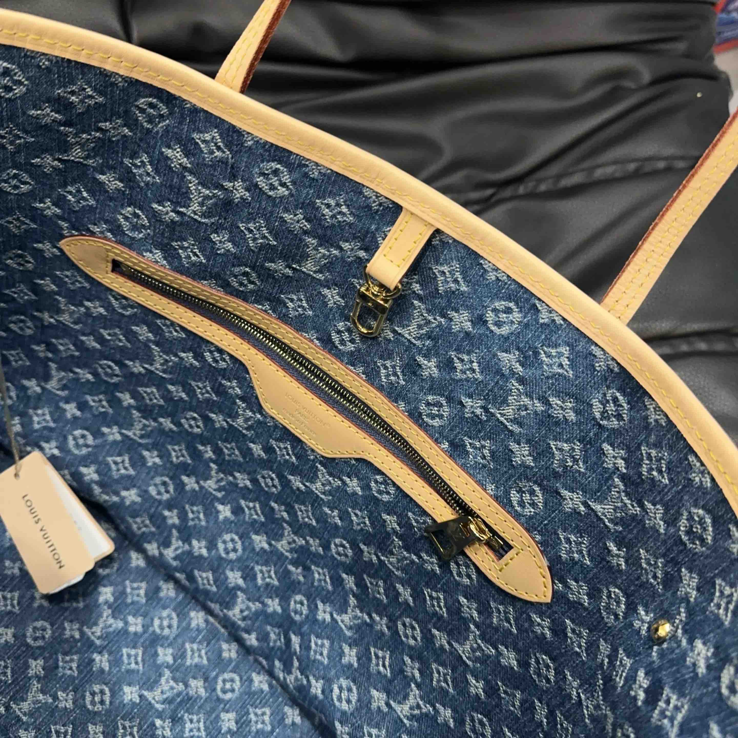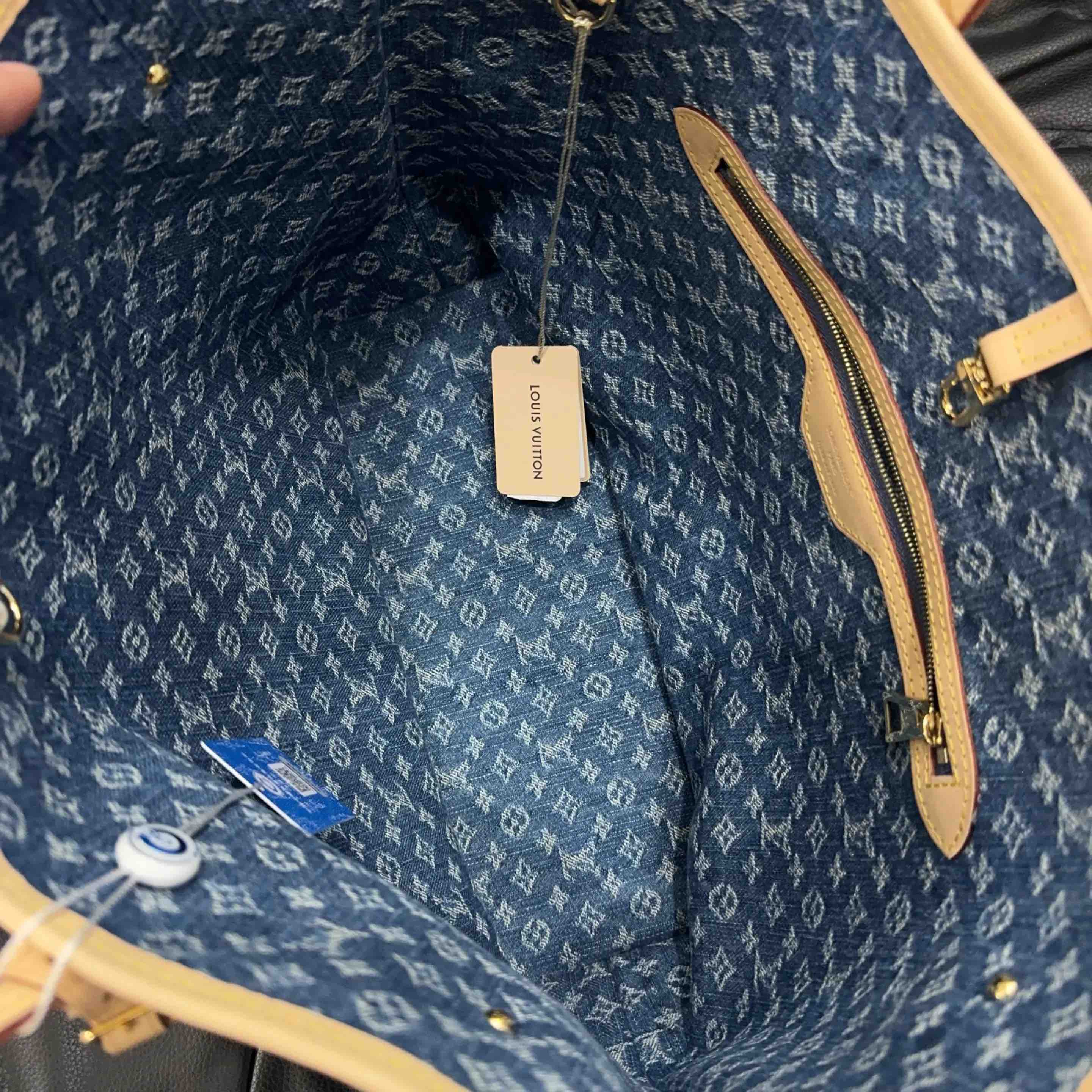 【商品详情】正品二手 LV Neverfull 中号 蓝色 老花 丹宁拼植鞣革 购物袋💙 99新 33×28 芯片款 配件:子袋 防尘袋。25年6月新款 通勤出街全能托特