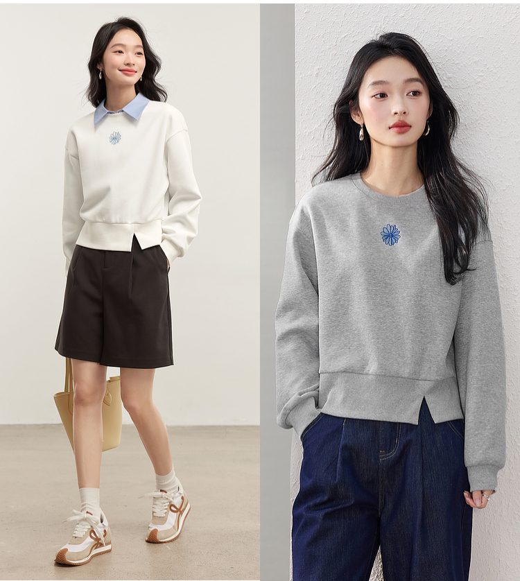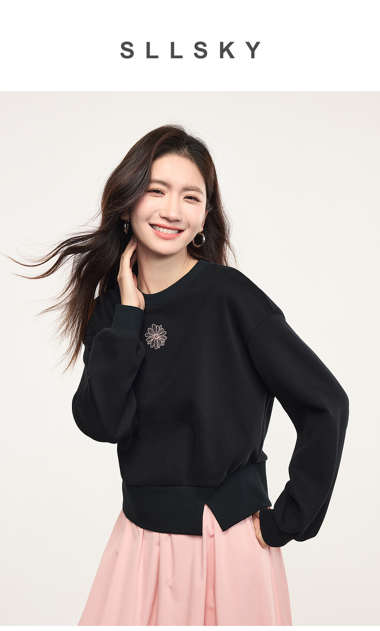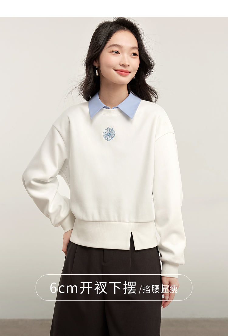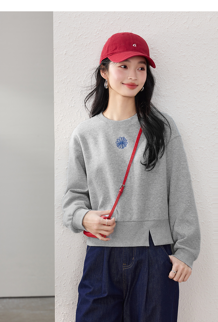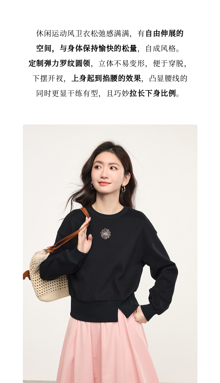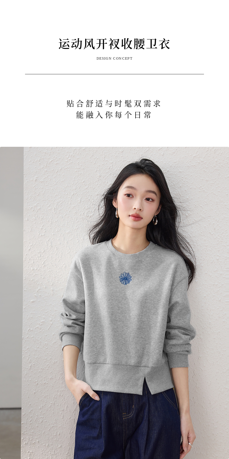 【年终特卖】熙世界运动风开衩收腰卫衣女休闲圆领小个子套头上衣2025春秋新款