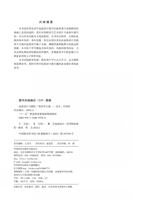 《包装设计与制作》是作者在多年包装设计教学经验积累与实践研究的基础上总结而成的,是针对高职高专艺术设计类师生编写的一本以项目实训为主要形式的专业教材。全书共分四章,分别从包装的基本知识、基本技能、分项目训练以及专题综合实践等四个方面对包装设计做了全面、细致的流程与实践过程讲解。每个章节都包含有相关知识、实践训练和学习评价等几个内容,力求达到从理论到实践再到评价的良性循环,注重培养和提高学生的职业能力与职业素养。该书实践指导性强,既有利于学生自主学习,也方便了教师备课和成绩评价,是非常实用的一本教材。