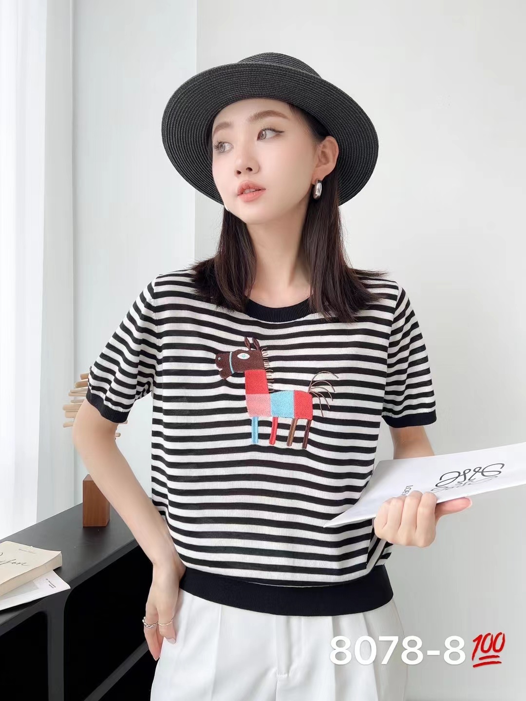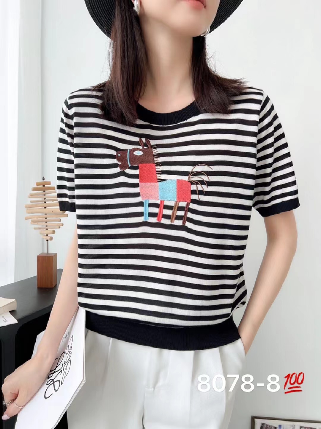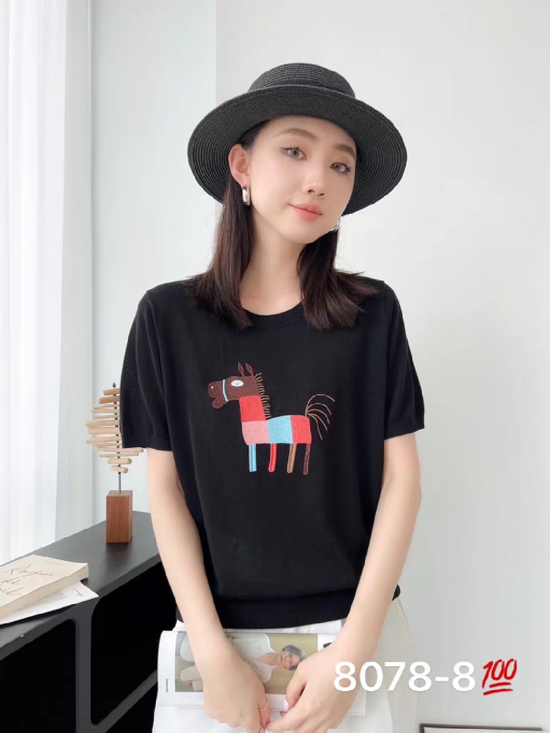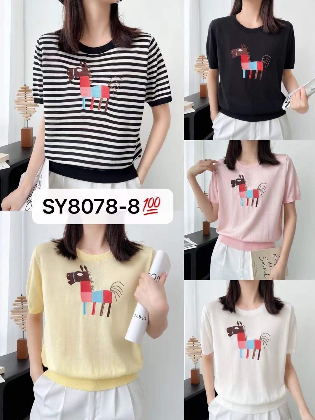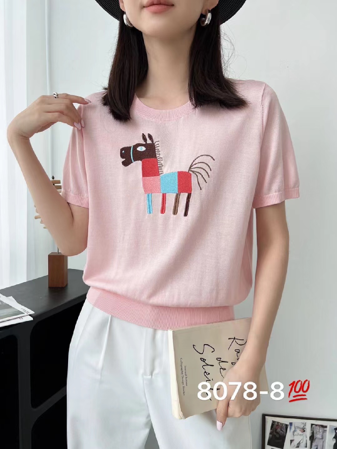 8078# 粉 均码 夏季新款百搭童趣木马短袖女薄款 广东炎炎夏日必备的天丝针织面料衫