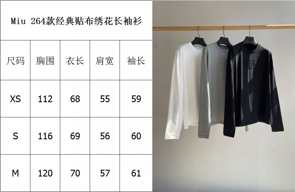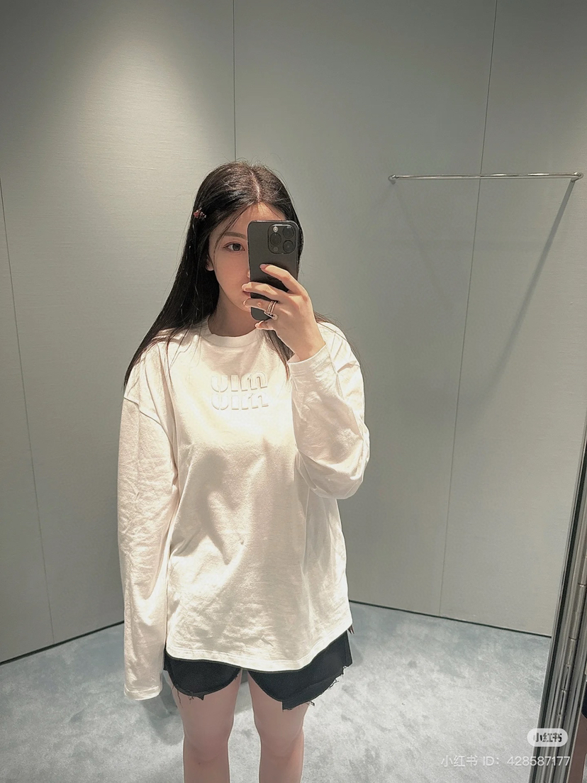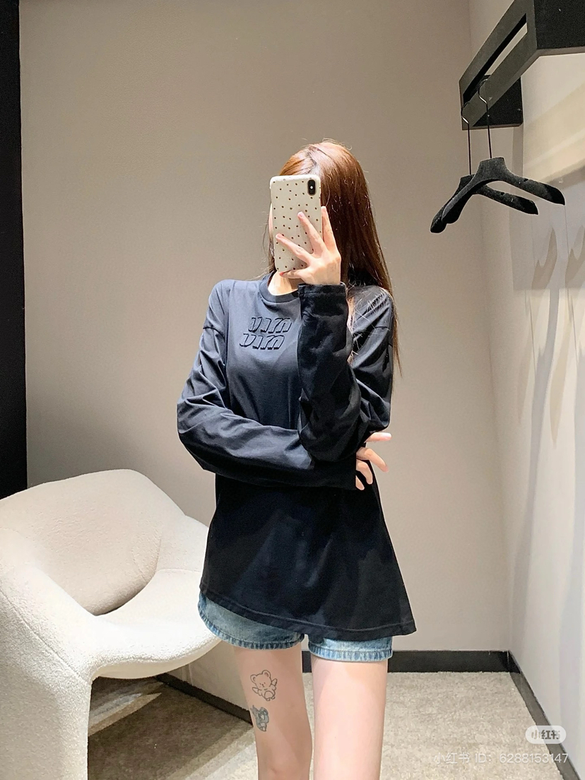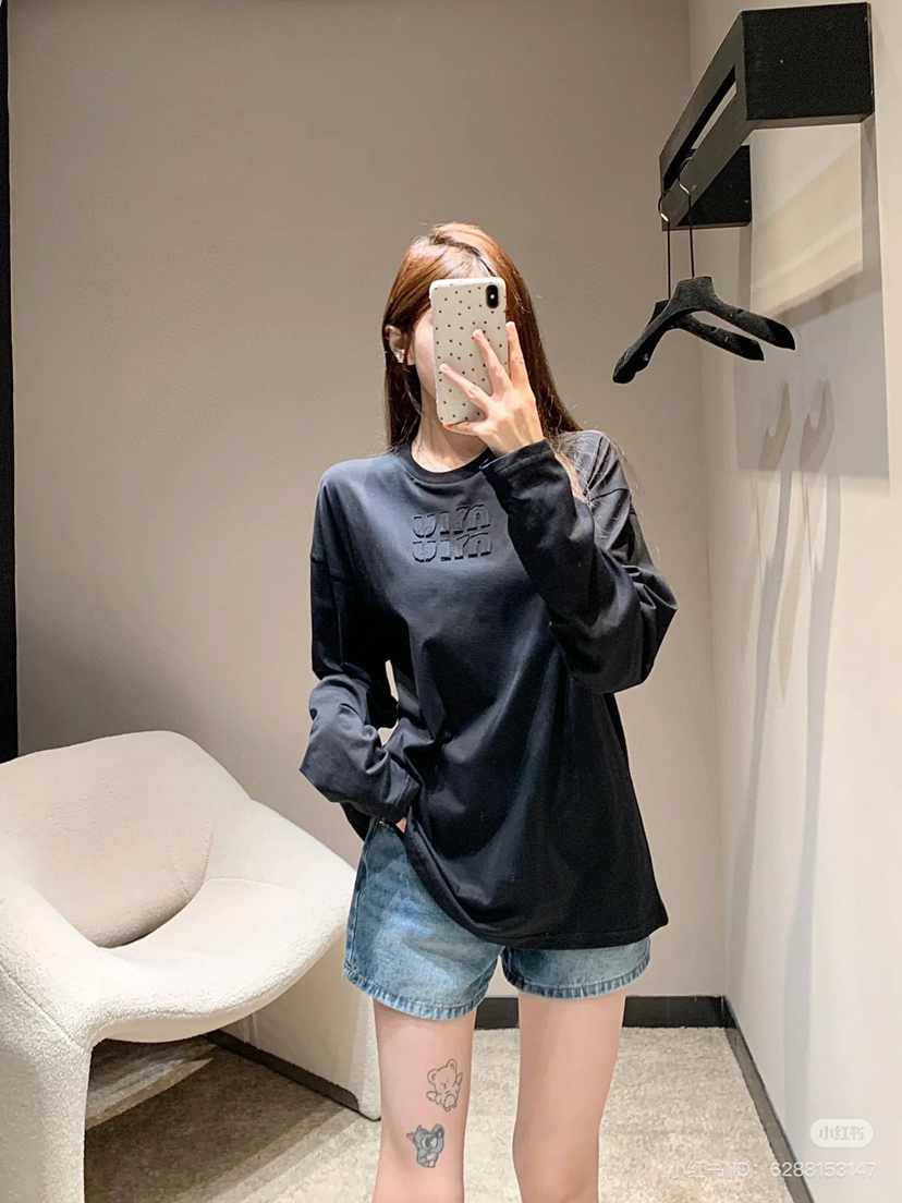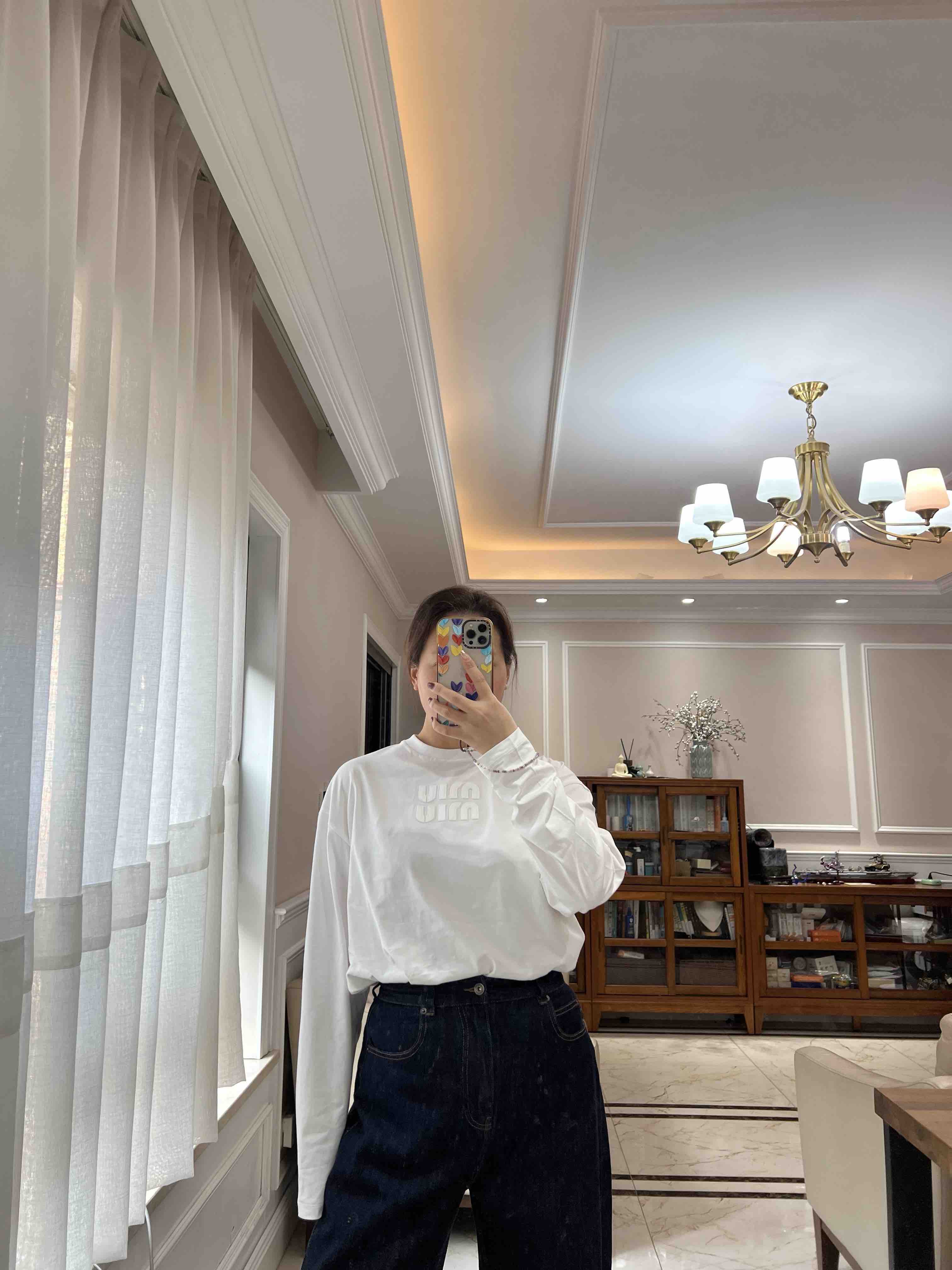 227-5 渠道货 Miu基础圆领 264款 字母贴布绣 精梳棉 宽松圆领长袖T恤