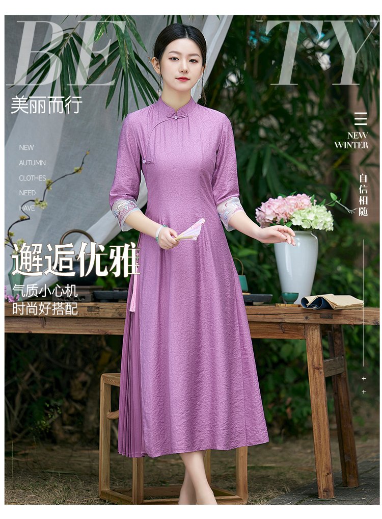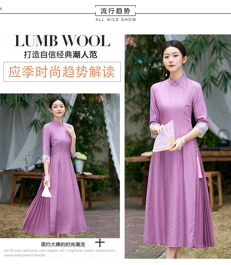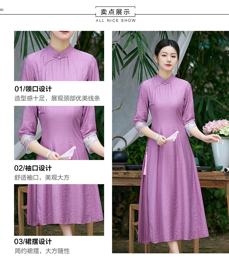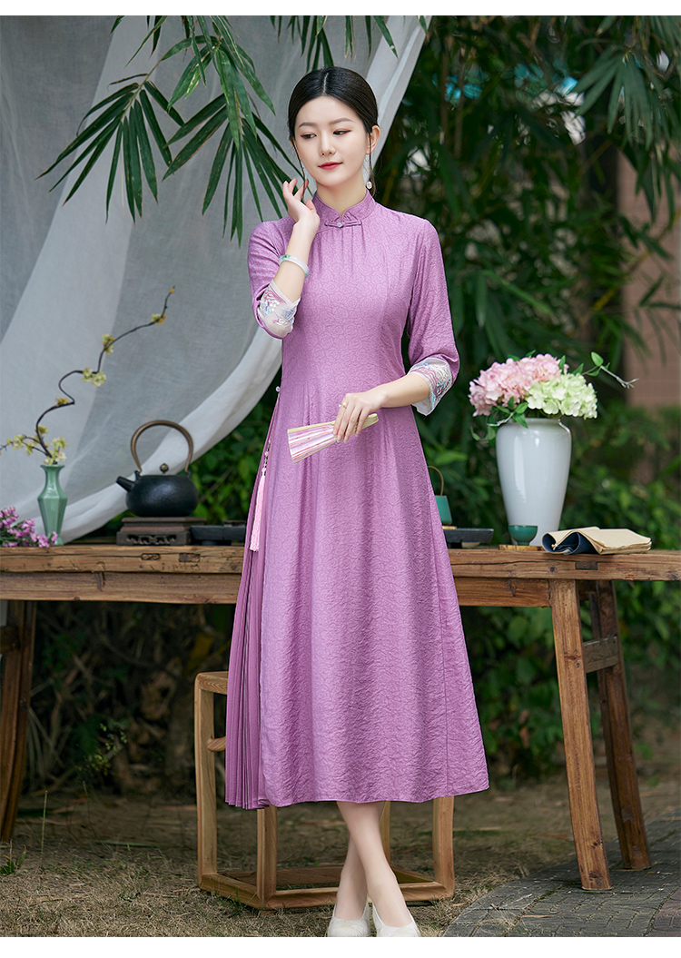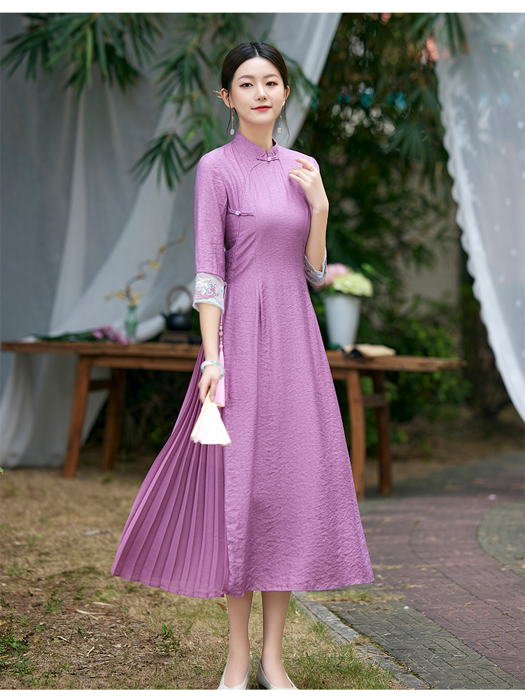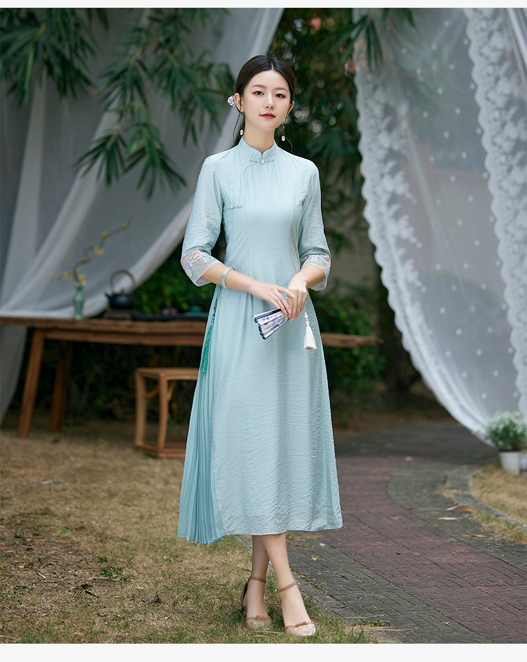 2022春夏新品国风时尚新款女士中式压褶奥黛旗袍枫庭刺绣连衣裙 LX21082
