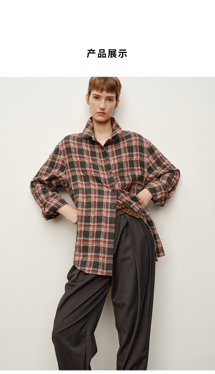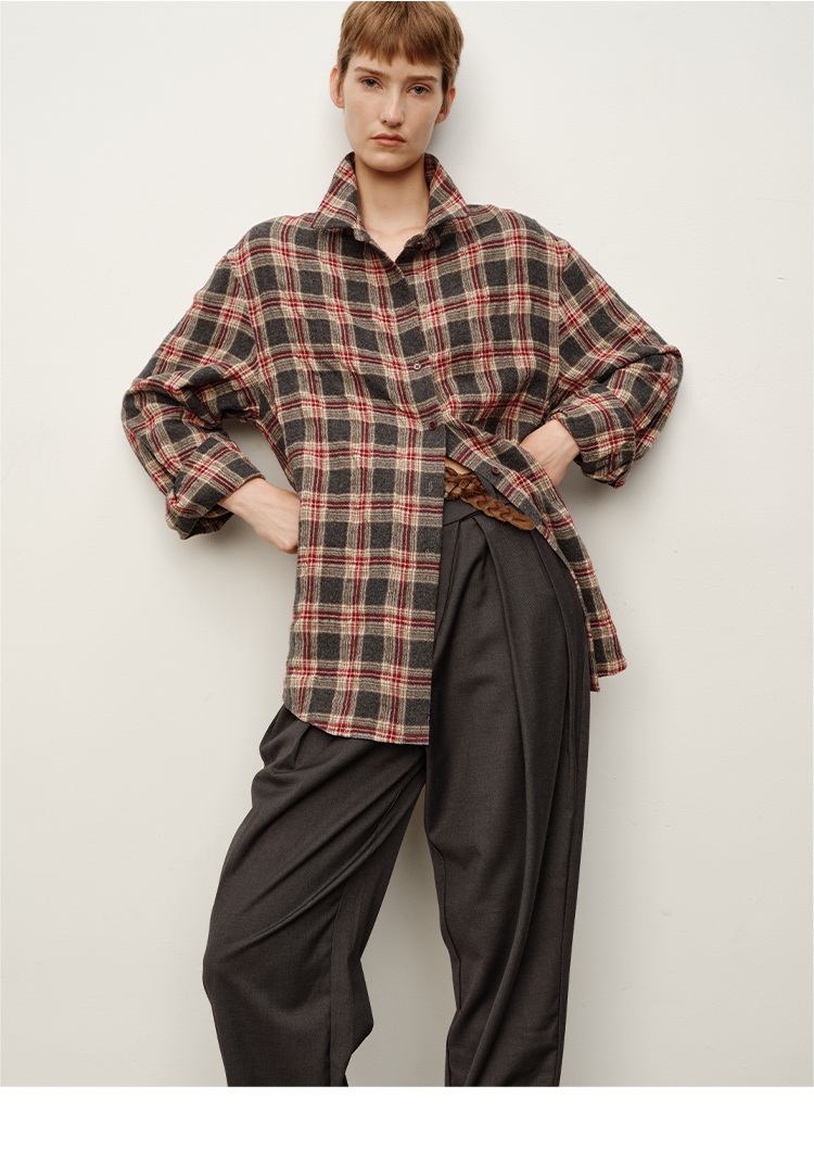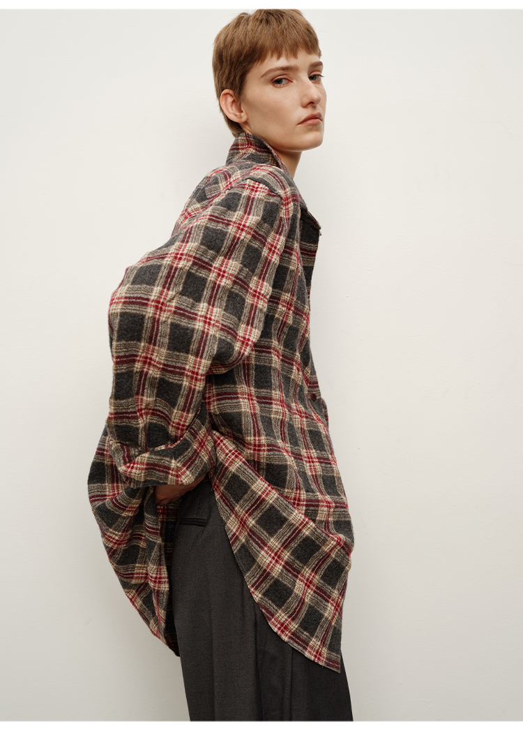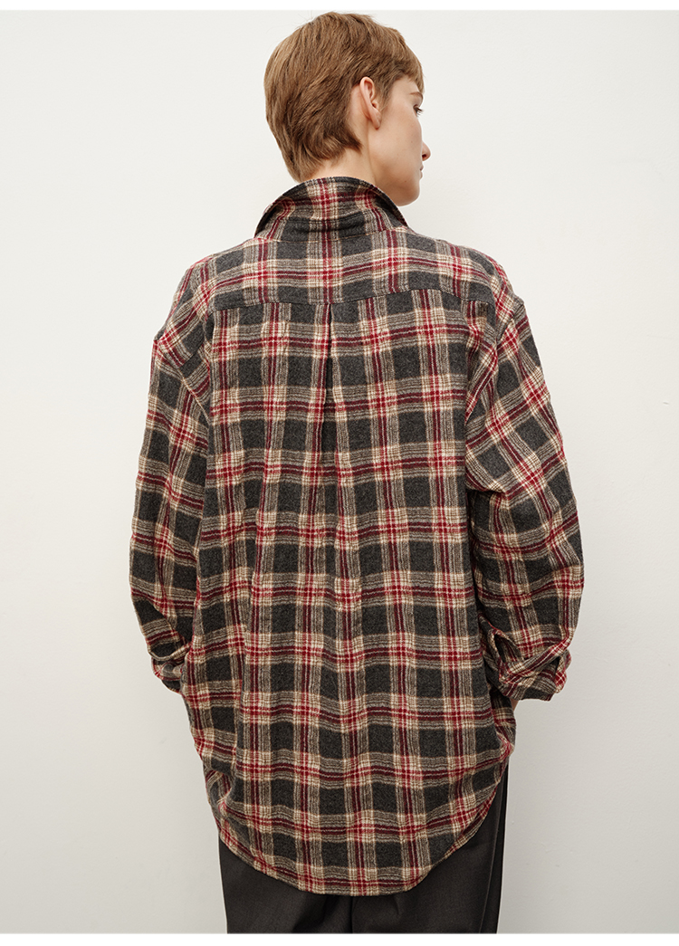 HIDEMI 进口羊毛色织格纹空气感纱线做旧水洗经典宽松知识分子衬衫