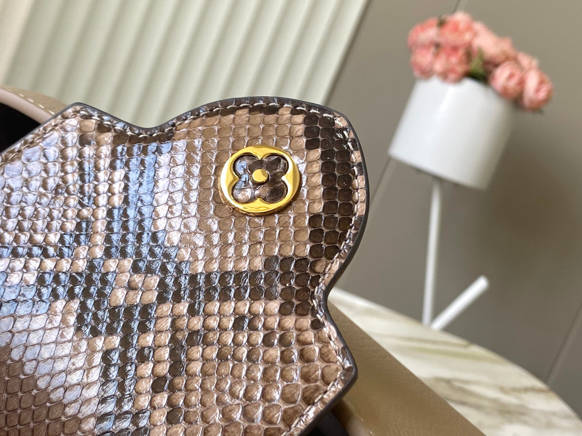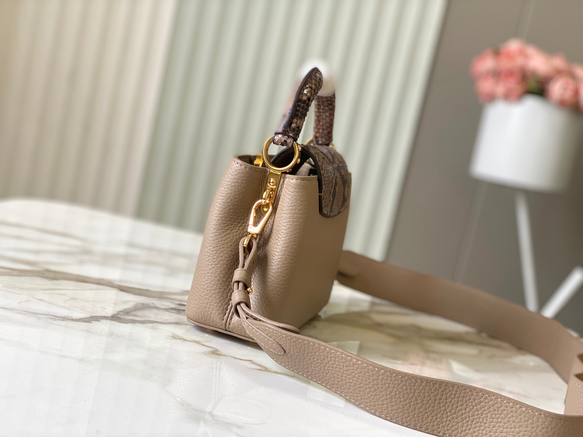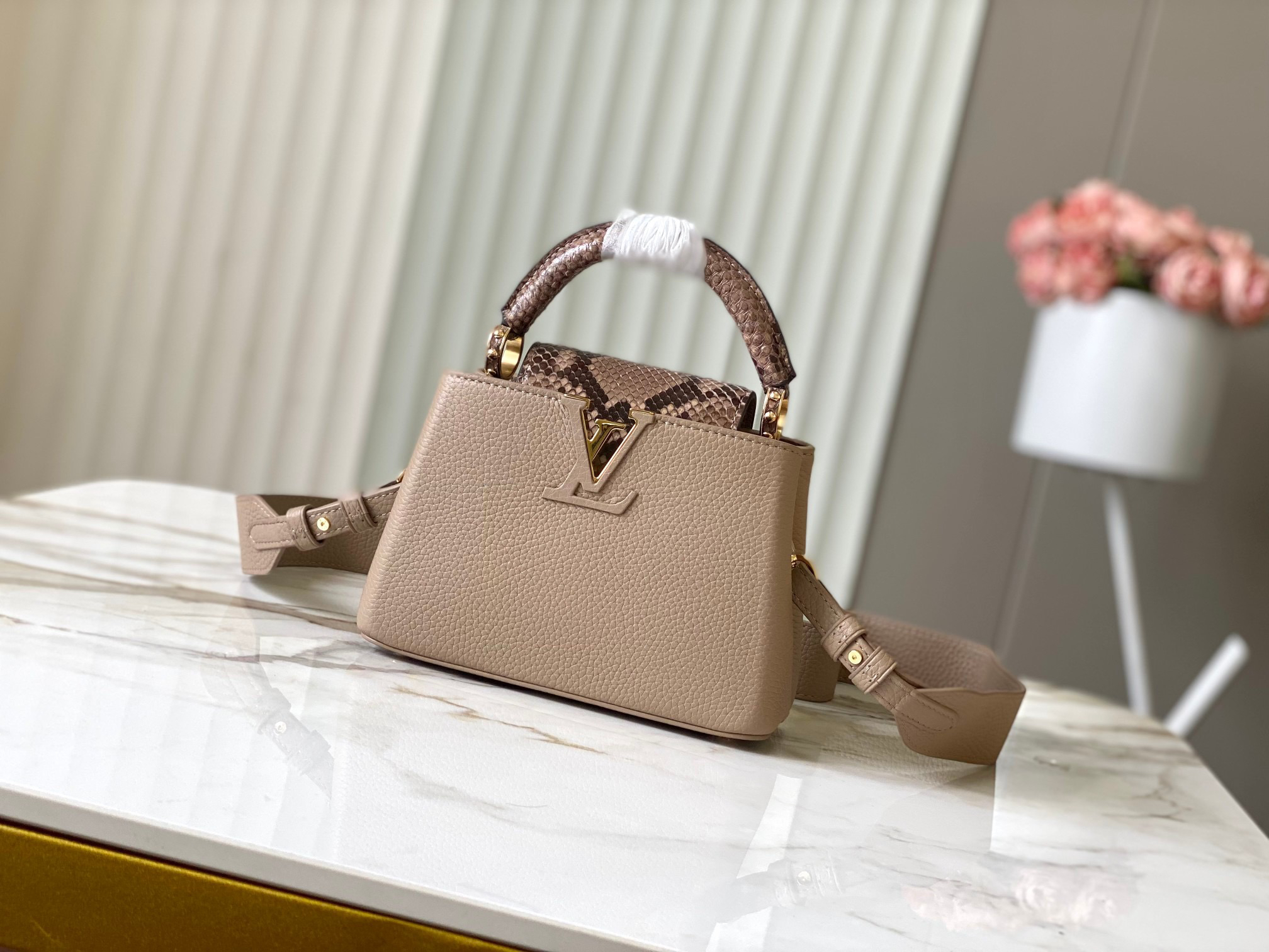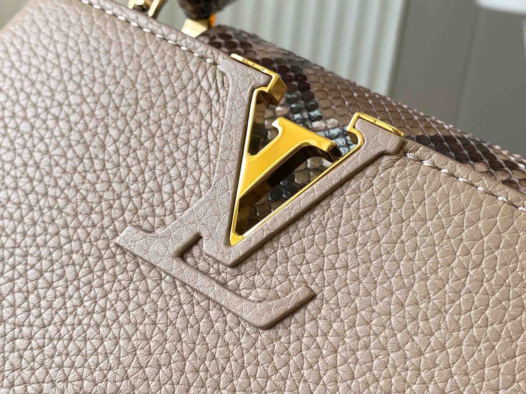 秋冬特惠💰1600 渠道级LV te级LV 全套包装 N80041/M48865褐灰 本款 Capucines 迷你号手袋以全粒面 Taurillon 皮革塑造精巧构型 搭配顶部手柄、两式翻盖及莹泽蟒蛇皮勾勒的 标识 成就昼夜皆宜的华美之选 可拆卸宽肩带令肩背或斜挎展露前卫气息 Size: 21 * 14* 8 cm