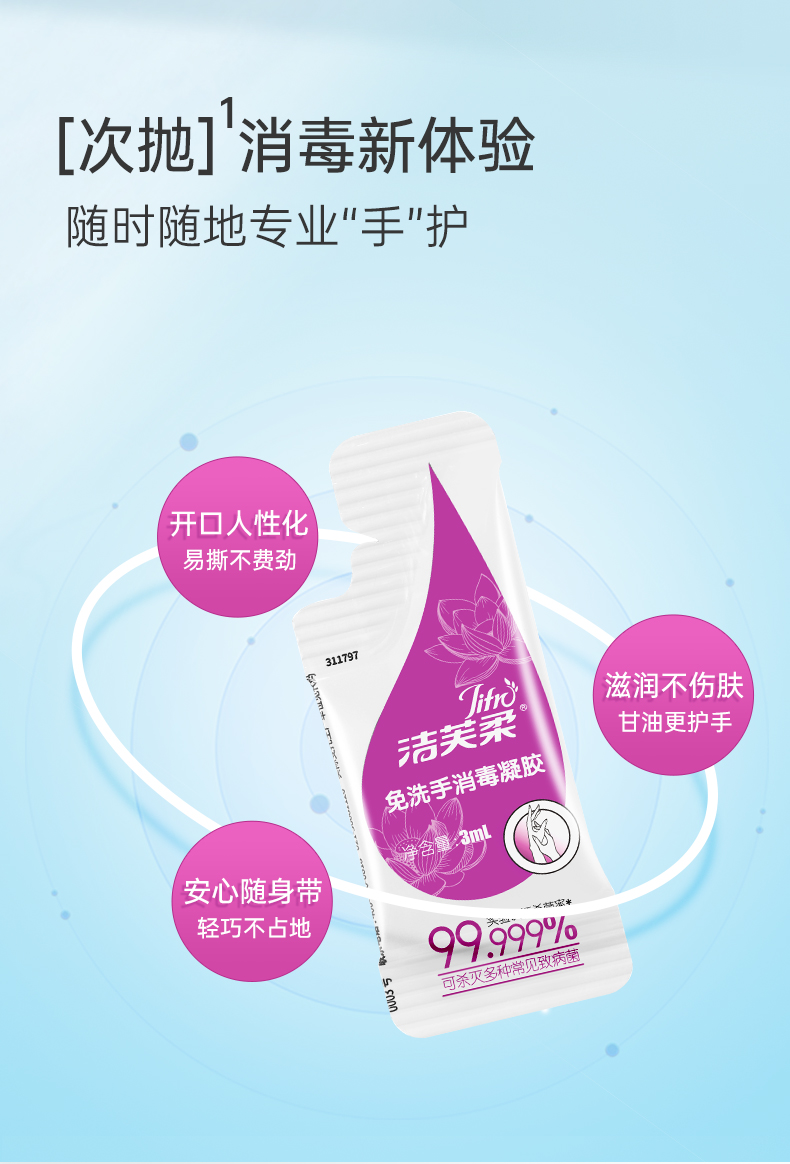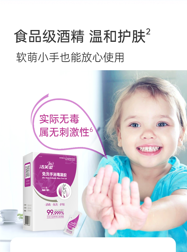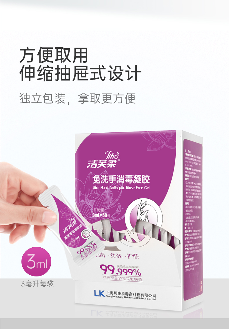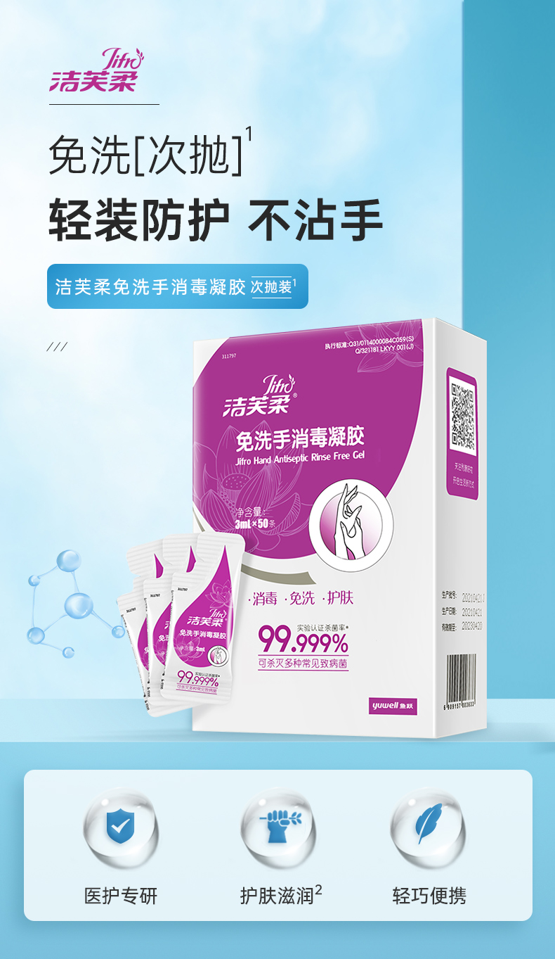 洁芙柔免洗洗手液消毒凝胶杀菌消毒液免水洗3ml*50包*2盒