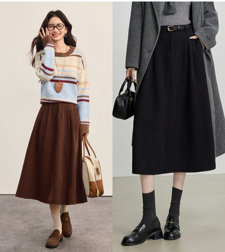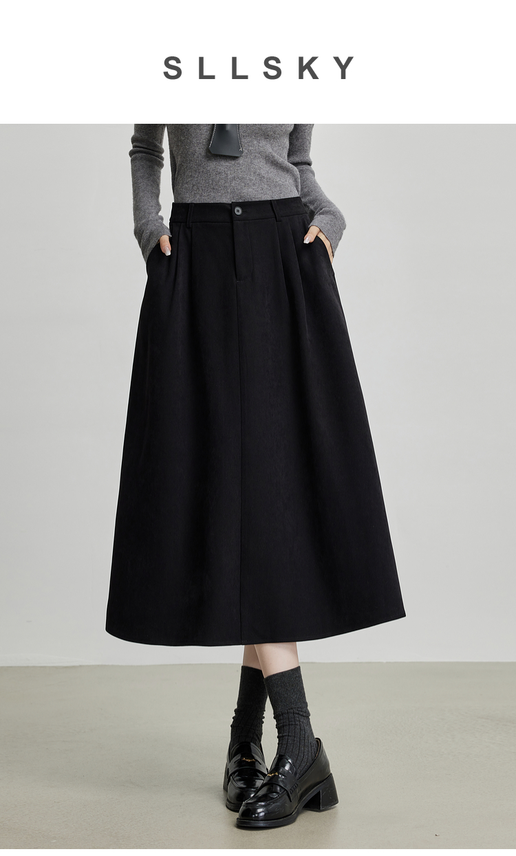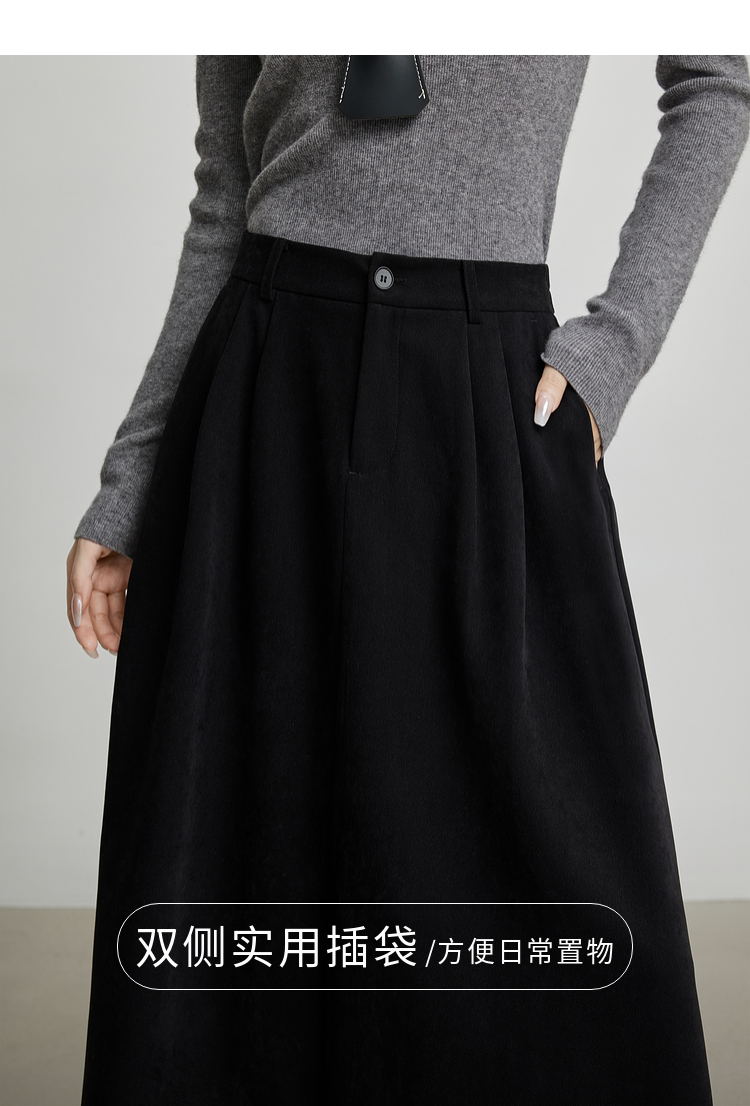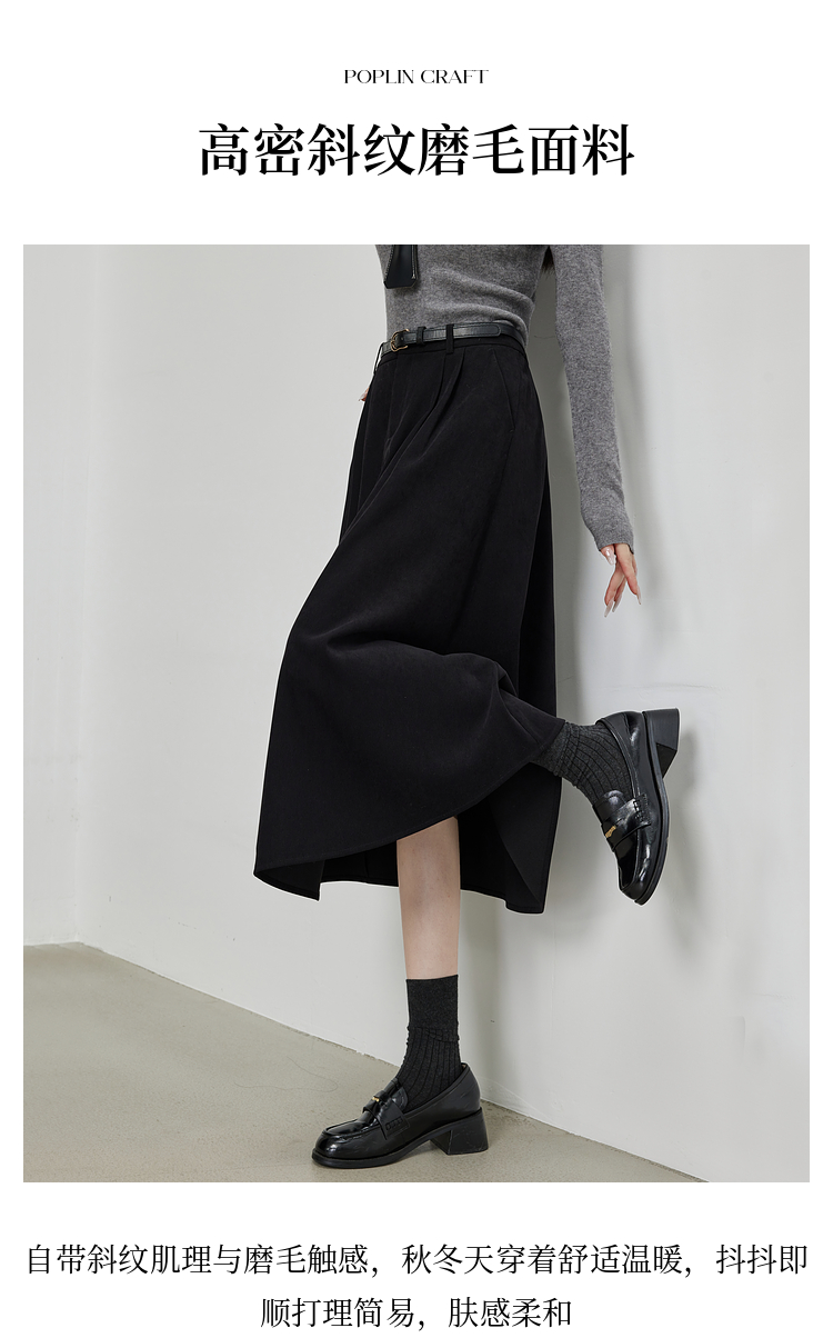 【09/03新品】熙世界高密斜纹磨毛半身裙女2025秋季遮跨显瘦中长款压褶A字伞裙