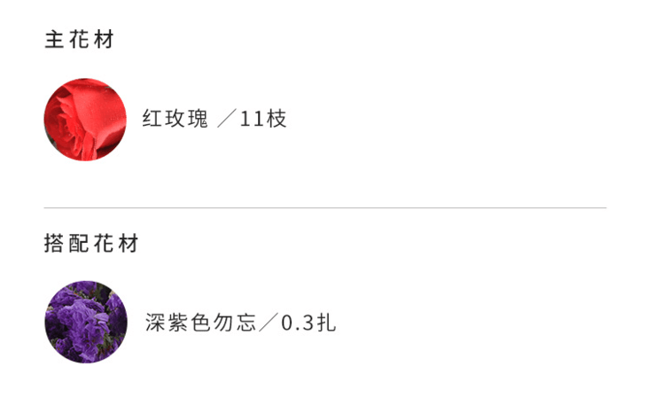 高档礼盒装鲜花:红玫瑰11枝,深紫色勿忘我0.3扎