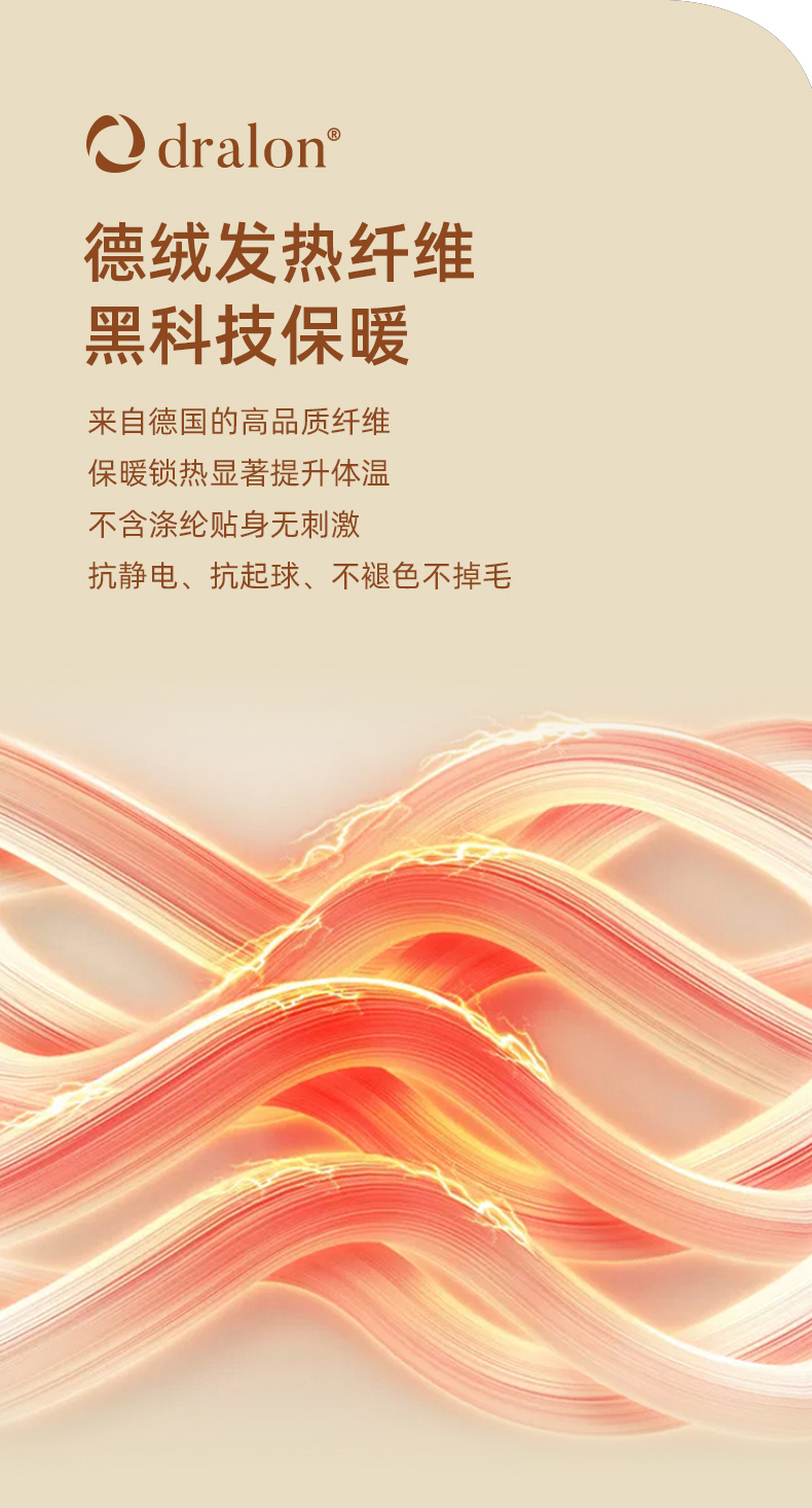 【介绍】羊毛蚕丝面料是融合羊毛、蚕丝、德绒纤维诞生的一种面料具有这三种面料的优点及特性。德绒羊毛蚕丝养护保暖内衣,德绒纤维羊毛与蚕丝混纺,吸收人体的湿气转化成热量,维持体表暖循环,双面磨毛工艺,与肌肤形成空气层,抵御寒冷,有色防线织造,色泽柔和丰满,层次感强,色牢度更好。无骨缝合,减少线迹,贴身穿不留痕迹。不含涤纶贴身不刺激,抗静电、抗起球、不褪色、不掉毛。高弹力,舒适透气。