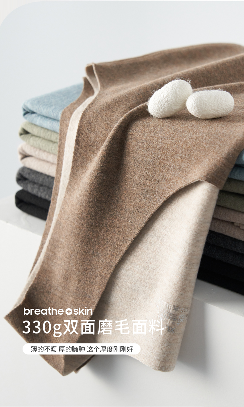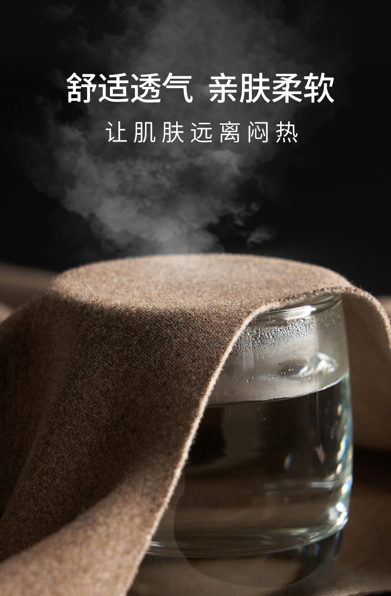 精致的桑蚕丝与弹性羊毛碰撞交织,塑造出独特的混纺面料,柔韧丝滑,透气恒温,让肌肤呼吸,如获取温柔拥抱。