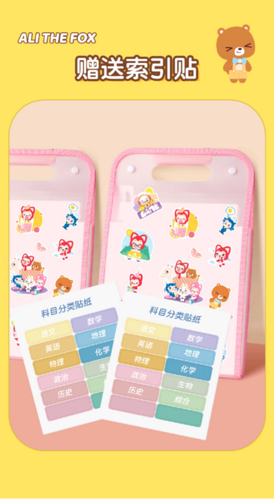 这款风琴包,颠覆你的想象 13层超大容量,能装下约180张试卷 赠送分类科目标签和阿狸贴纸 再多科目也无需恐惧,大容量从根头解决问题 每个科目都可以分层收纳,也不怕试卷杂乱 经常弄丢试卷,一目了然,更方便