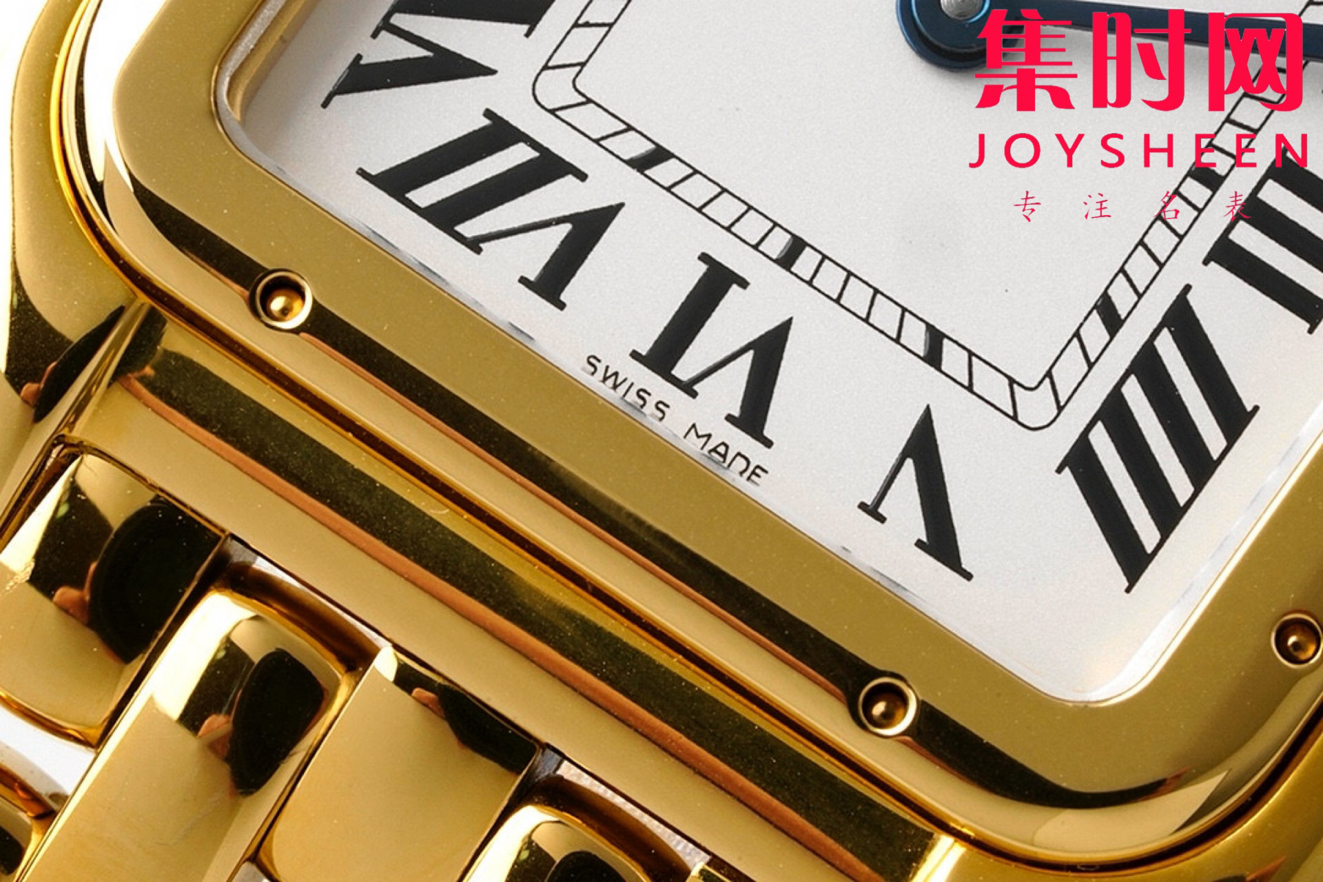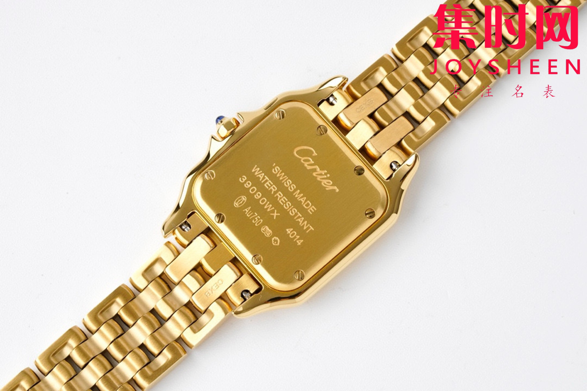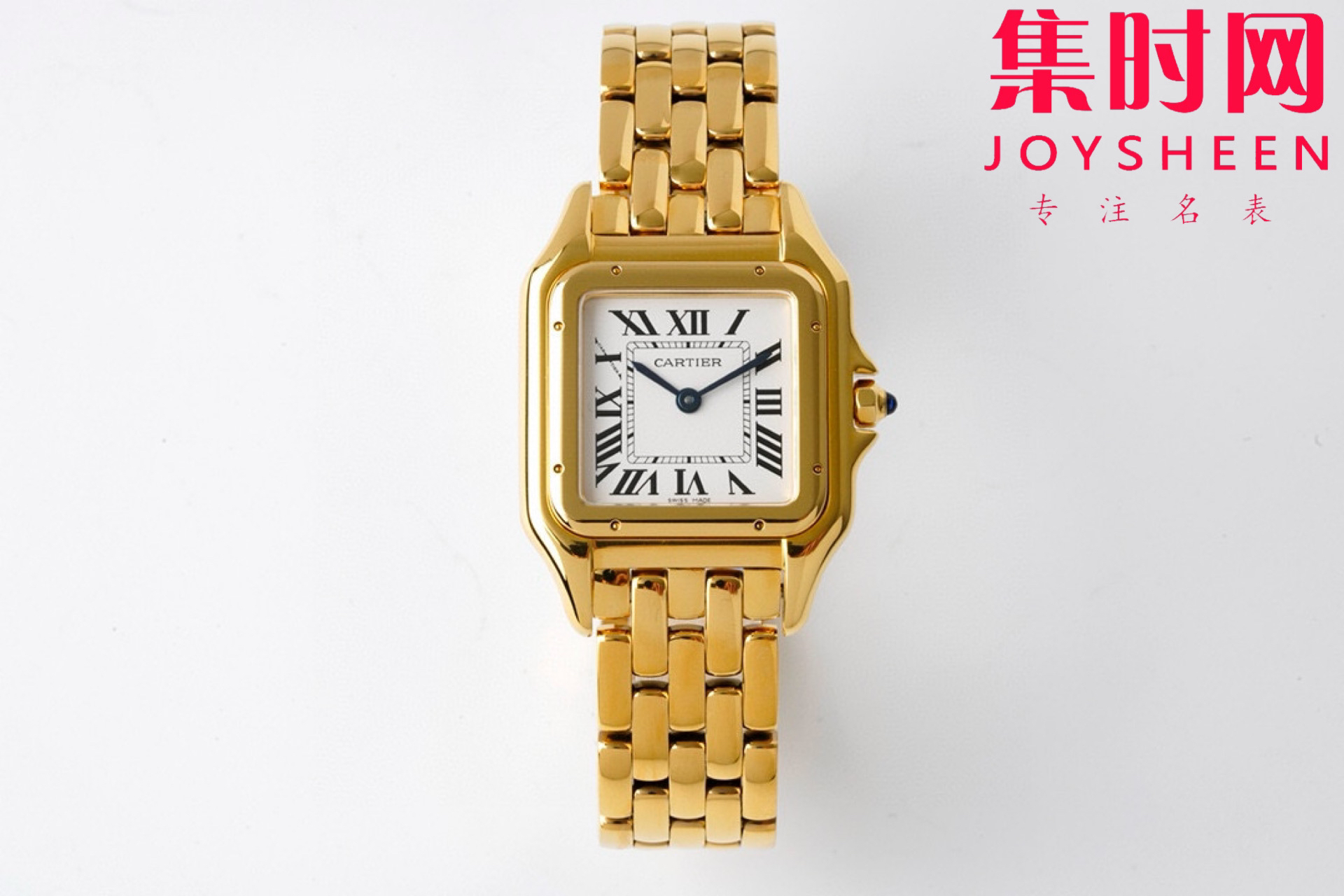 卡地亚Panthère de Cartier猎豹系列腕表 中号27X37mm 女士腕表 使用方形双层表壳看起来更加立体大方,更加突显出腕表的优雅与经典。白色表盘上,卡地亚式时标设计更为腕表注入一份品牌的 魅力。蓝色中央时分针宛若在两只随时间而舞动的精灵,为整款腕表再填华彩。 与传统卡地亚腕表一样,表冠上镶嵌有一颗具有品牌代表性的蓝宝石,向观表者展现高级钟表珠宝品牌卡地亚的独有魅力。表冠采用防滑纹理设计,方便对腕表的调试。两边的表冠护桥也为腕表增添了一份安全防护。 相比背透设计,密底工艺可以保障腕表机芯安全性。灵活自如的链节表链是腕表另一大亮点,处处都散发着曜目而饱满的光芒,从上到下都充满着独特的优雅奢华气质。
