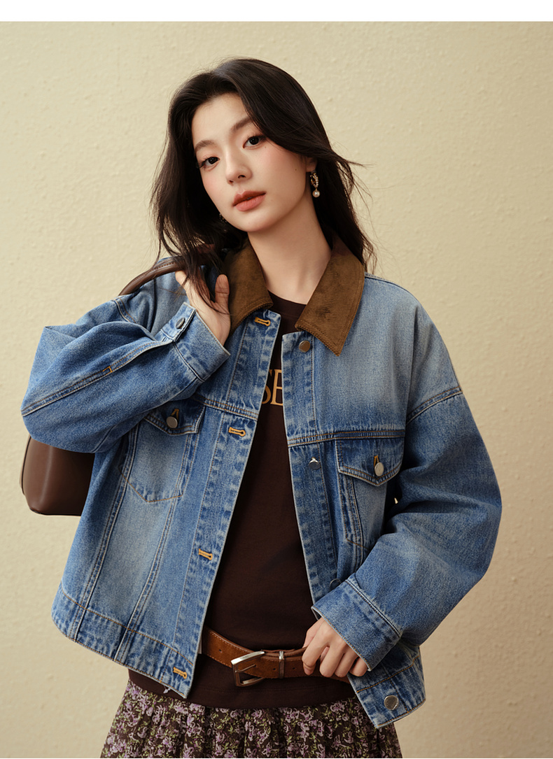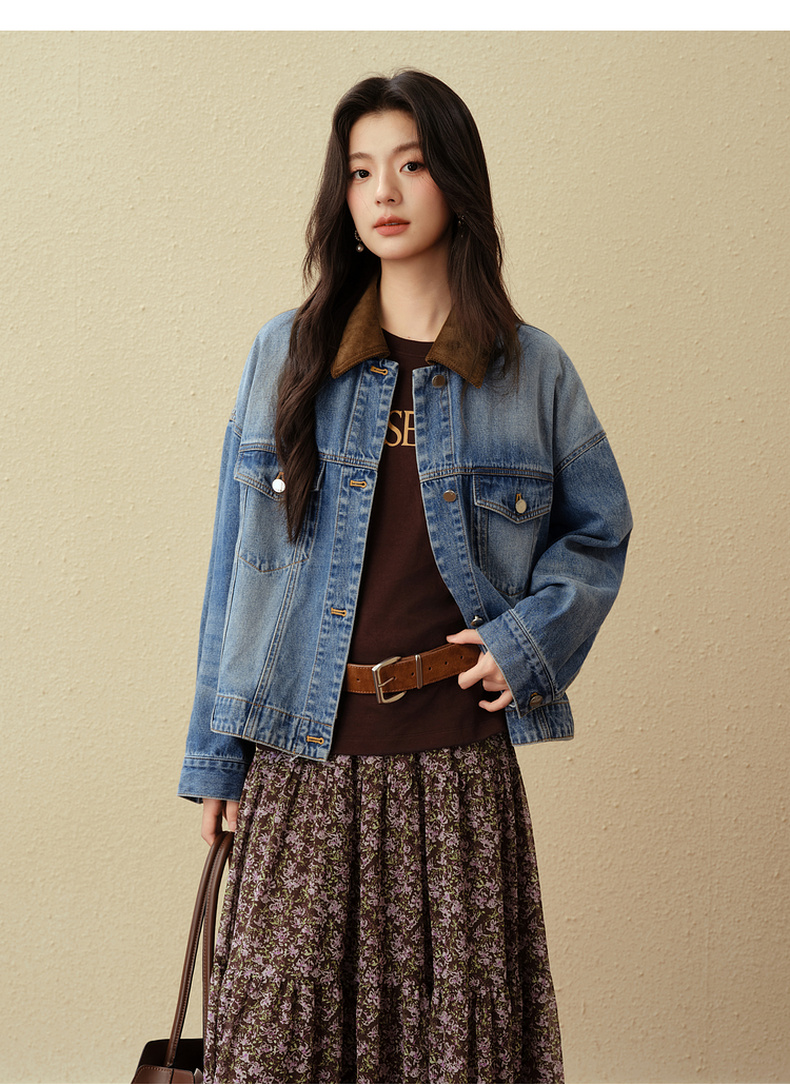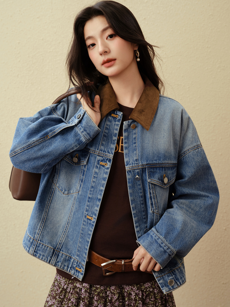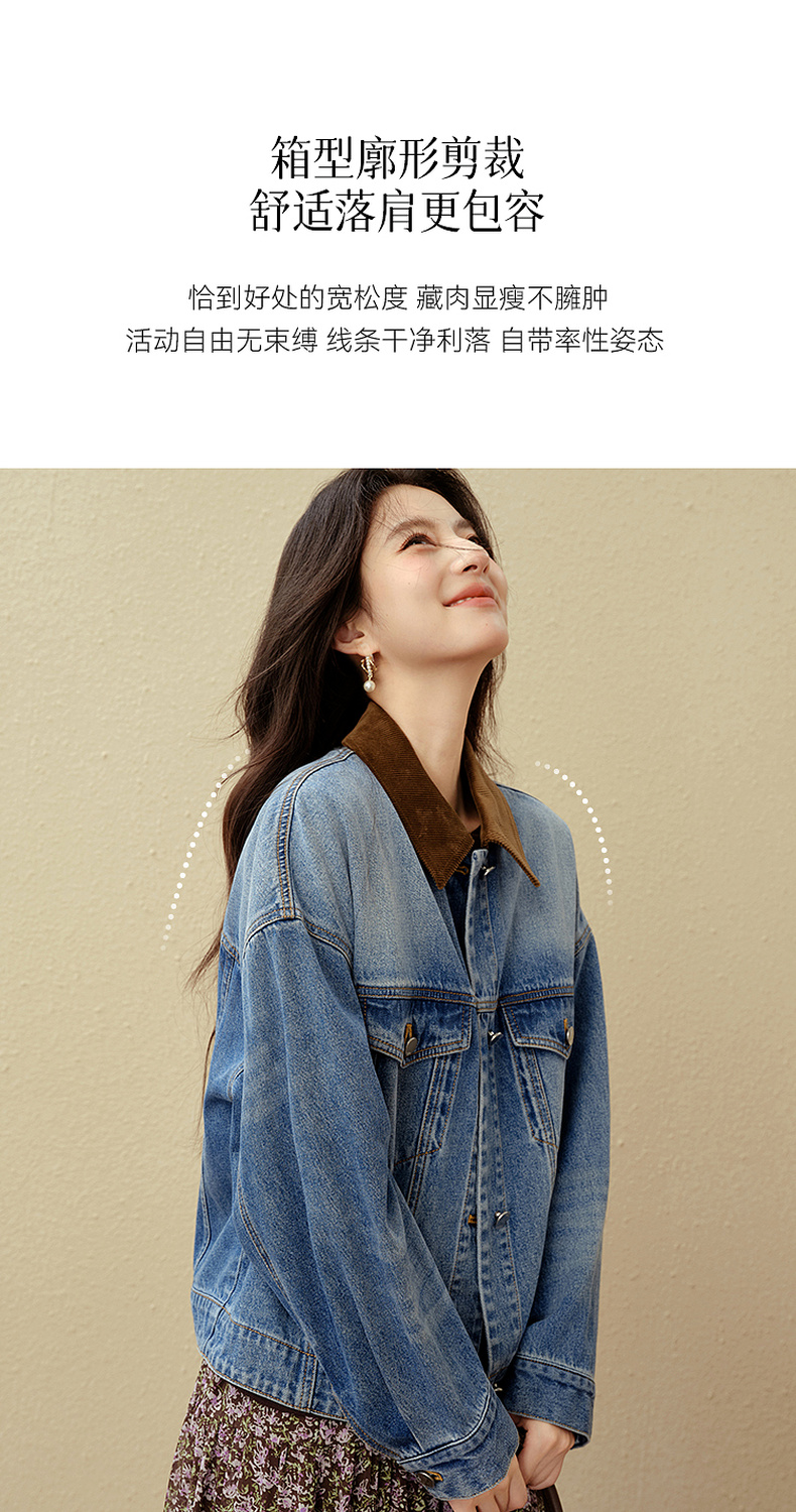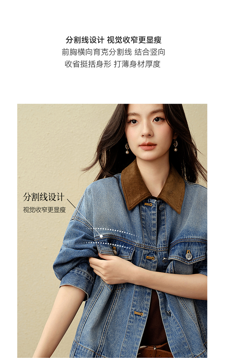 【严选】诗凡黎复古撞色拼接翻领牛仔外套2025秋新款百搭休闲夹克短外套女7G8510501
