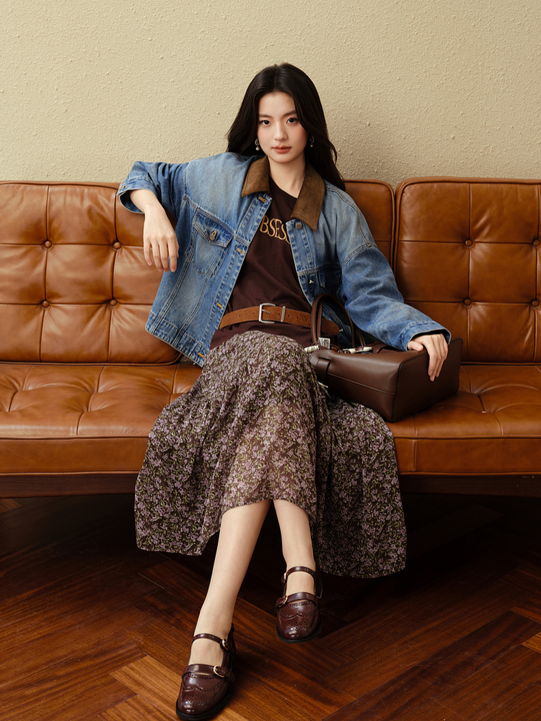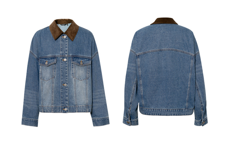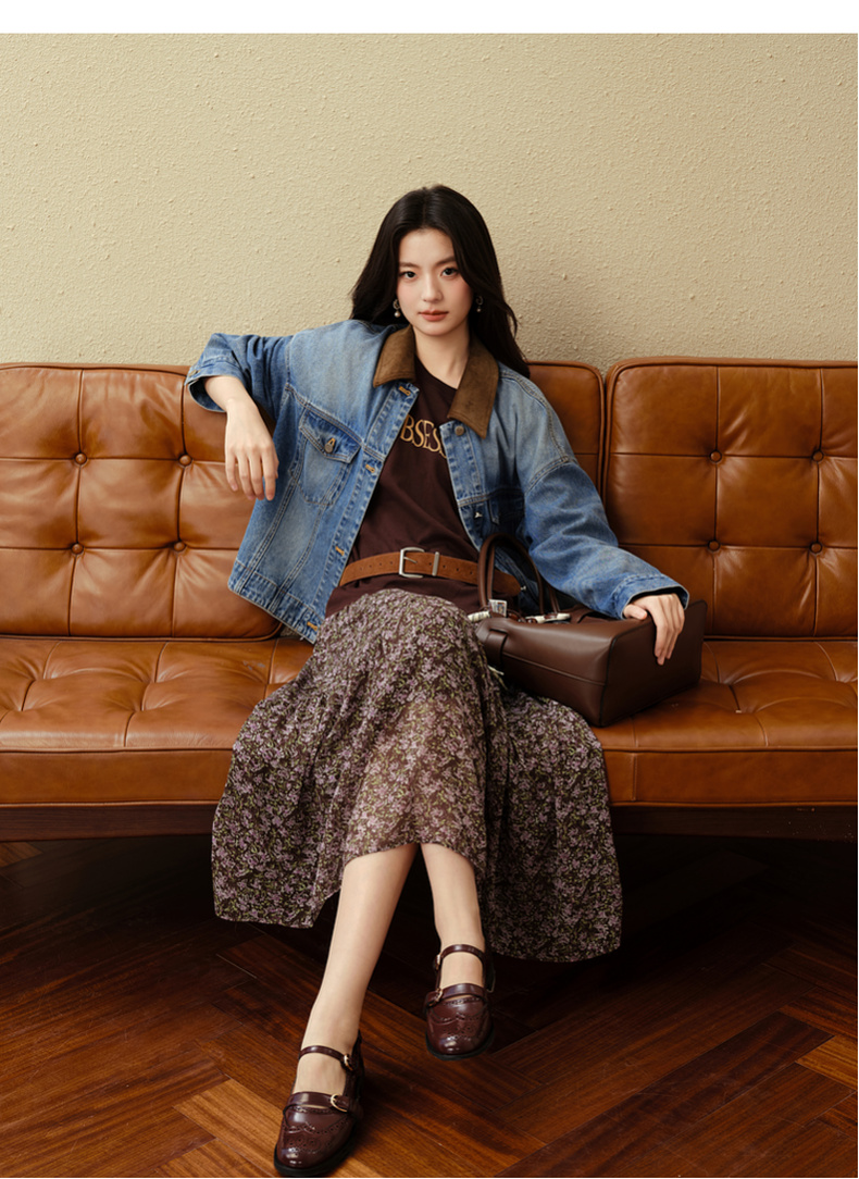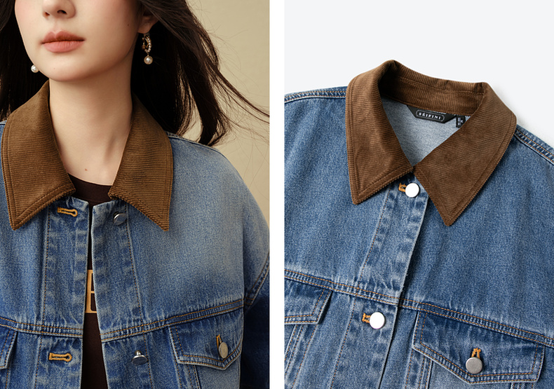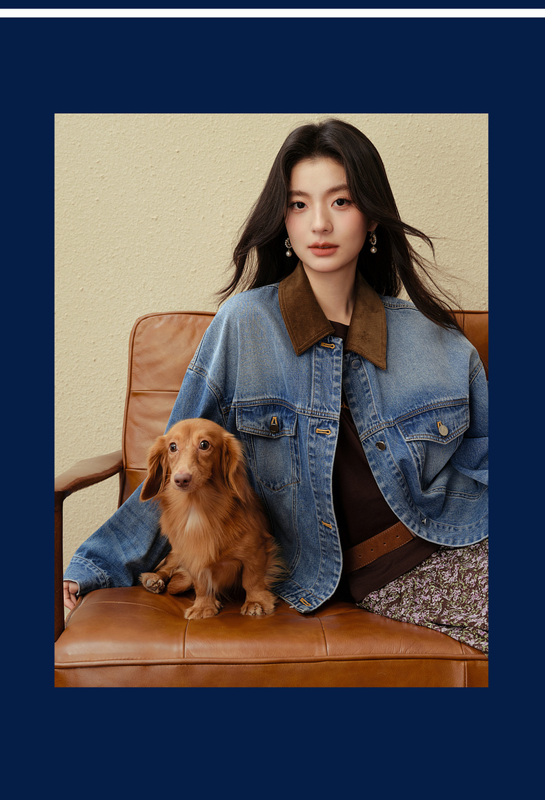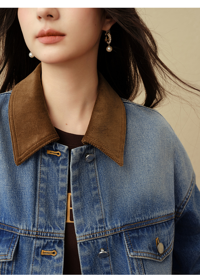 【严选】诗凡黎复古撞色拼接翻领牛仔外套2025秋新款百搭休闲夹克短外套女7G8510501