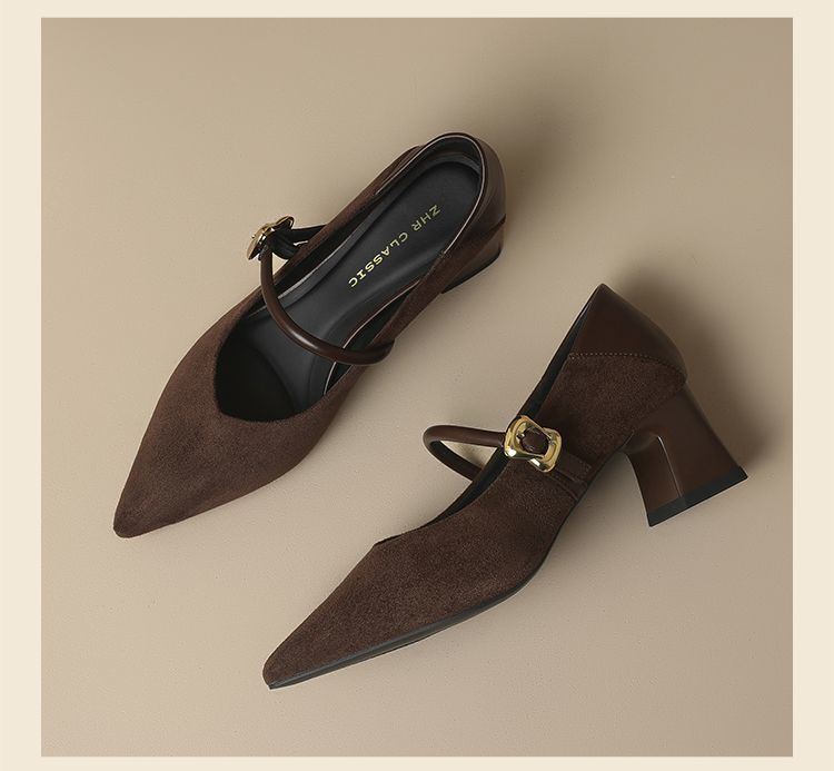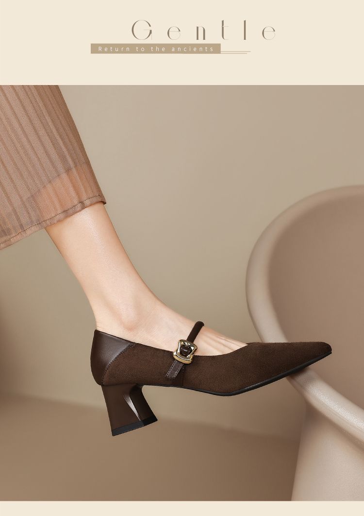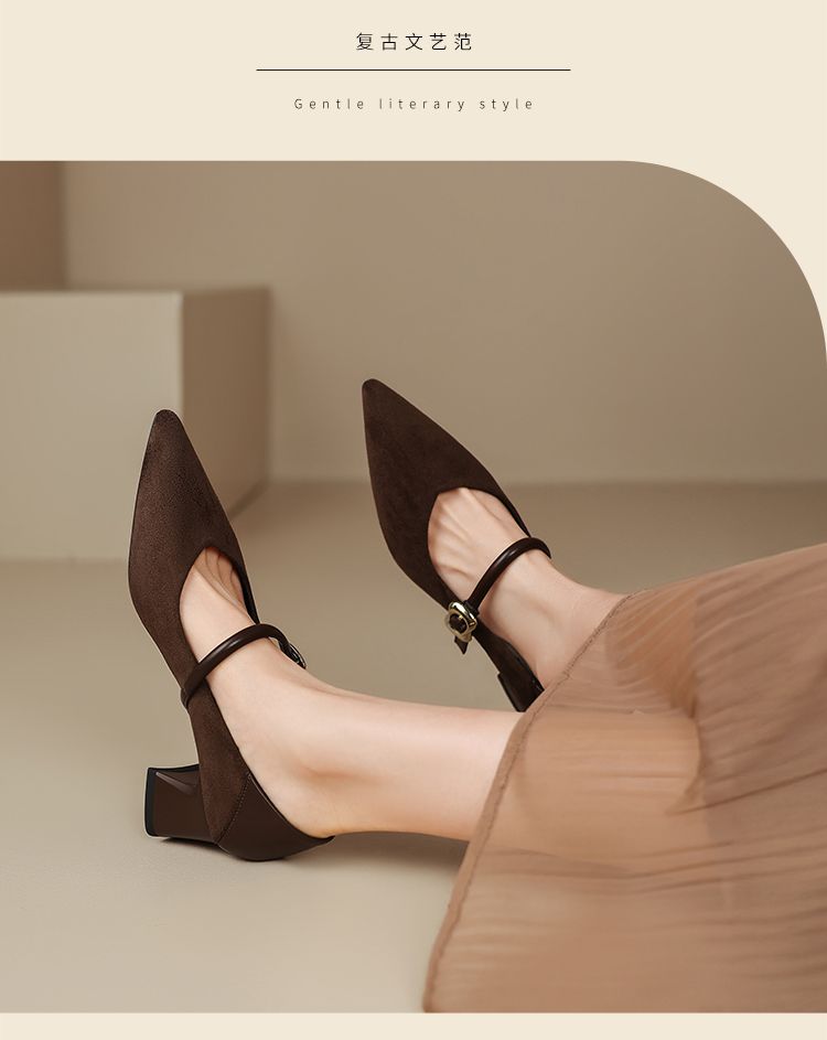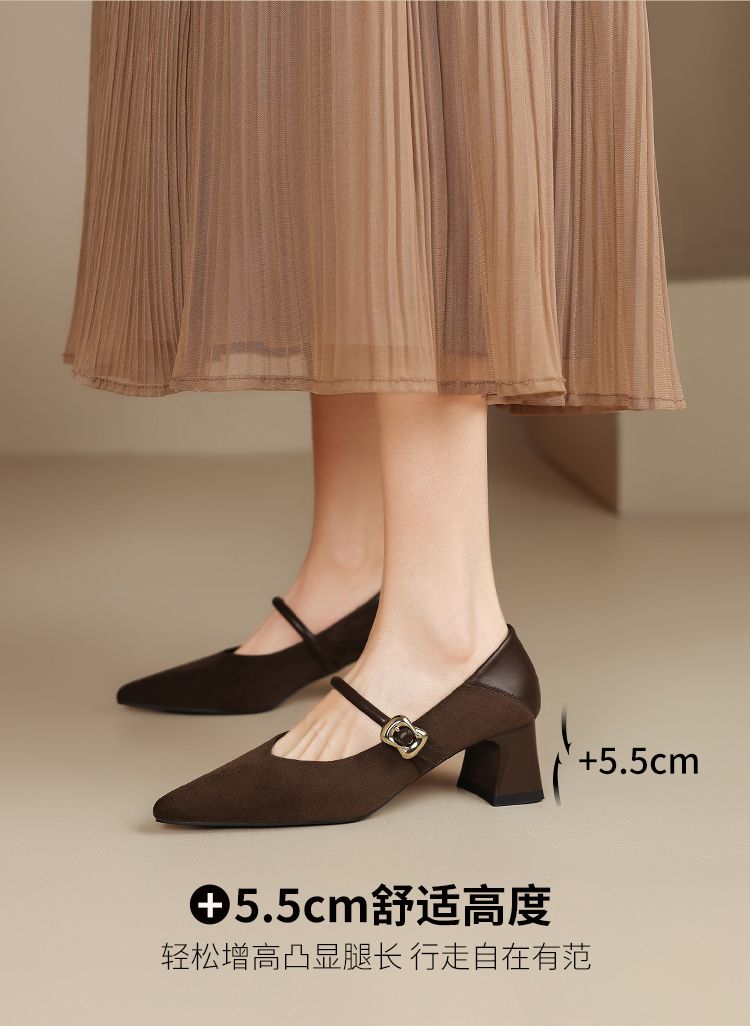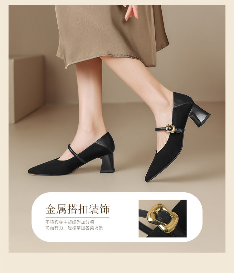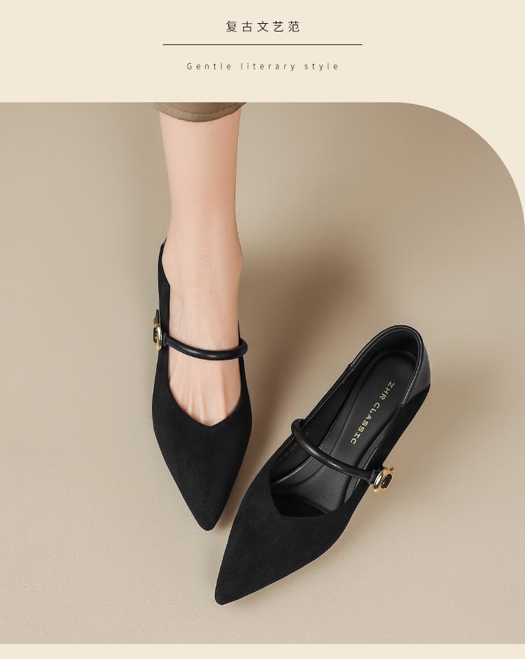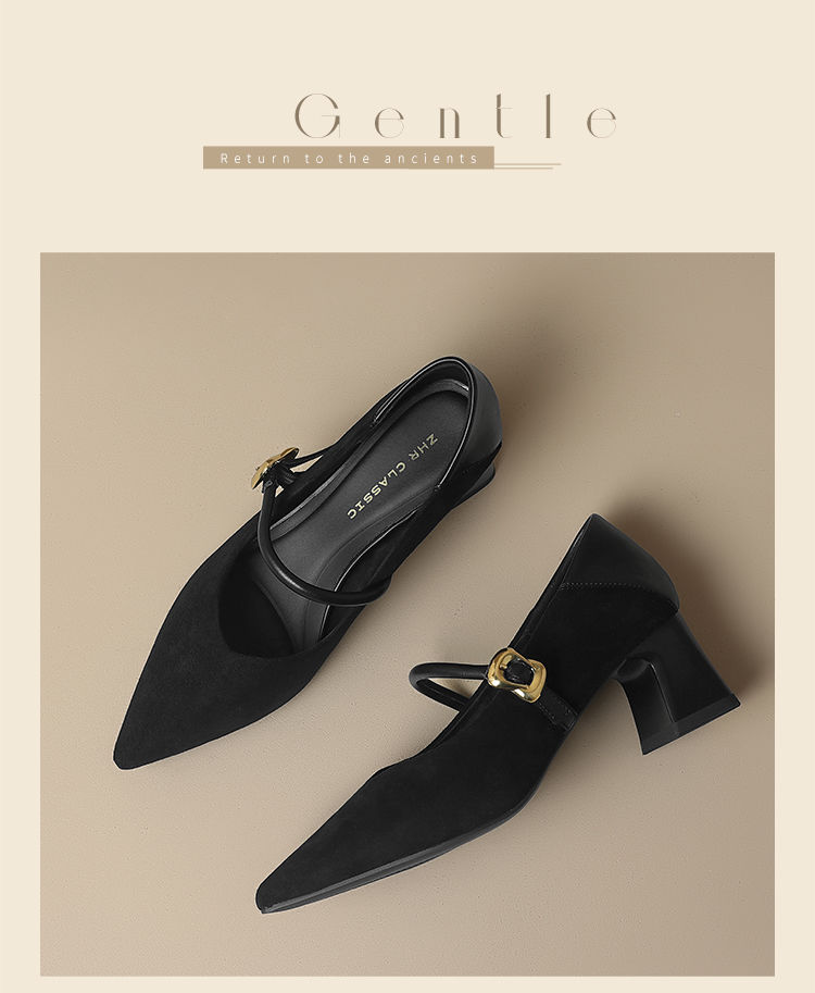 ZHR复古尖头浅口单鞋女2025新款洋气玛丽珍女鞋百搭通勤粗跟鞋子