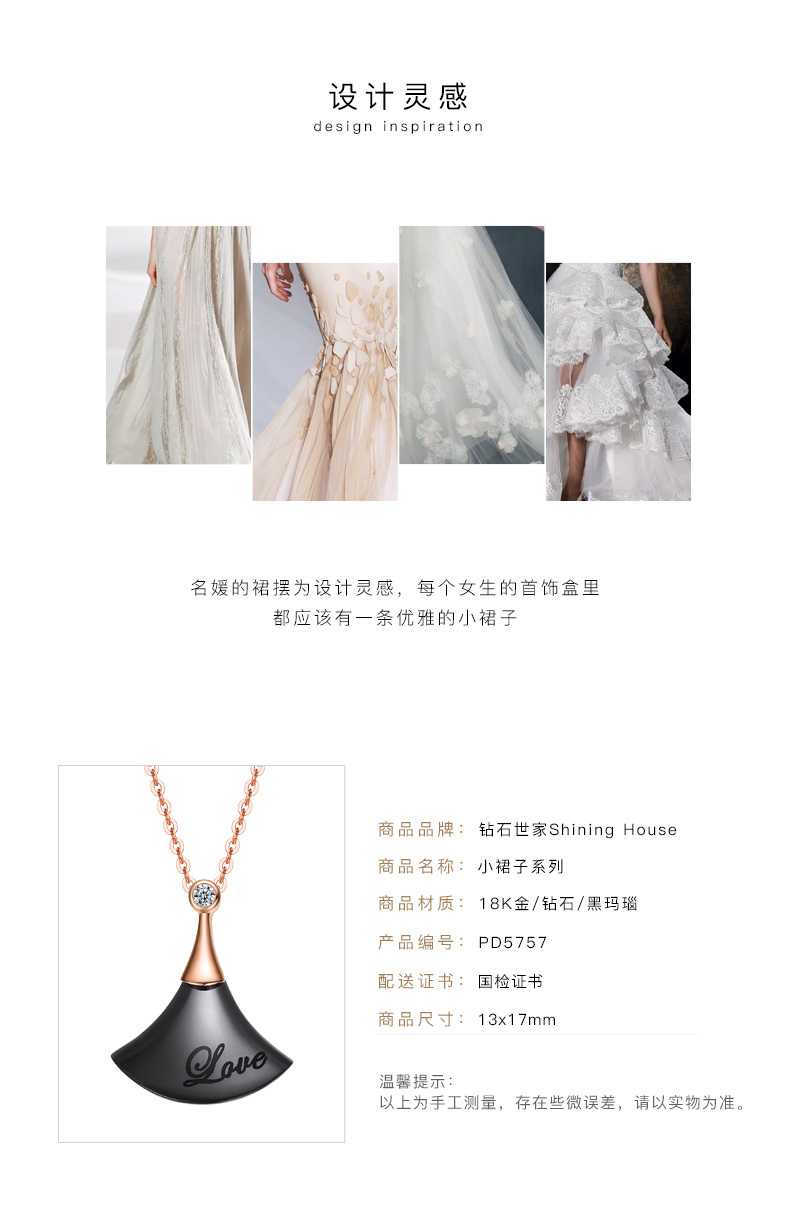 【甄选钻饰】【专享】钻石世家 18K金钻石吊坠 黑玛瑙吊坠 小裙子吊坠 可爱扇形吊坠链坠(主石约1分)(可搭配项链购买)