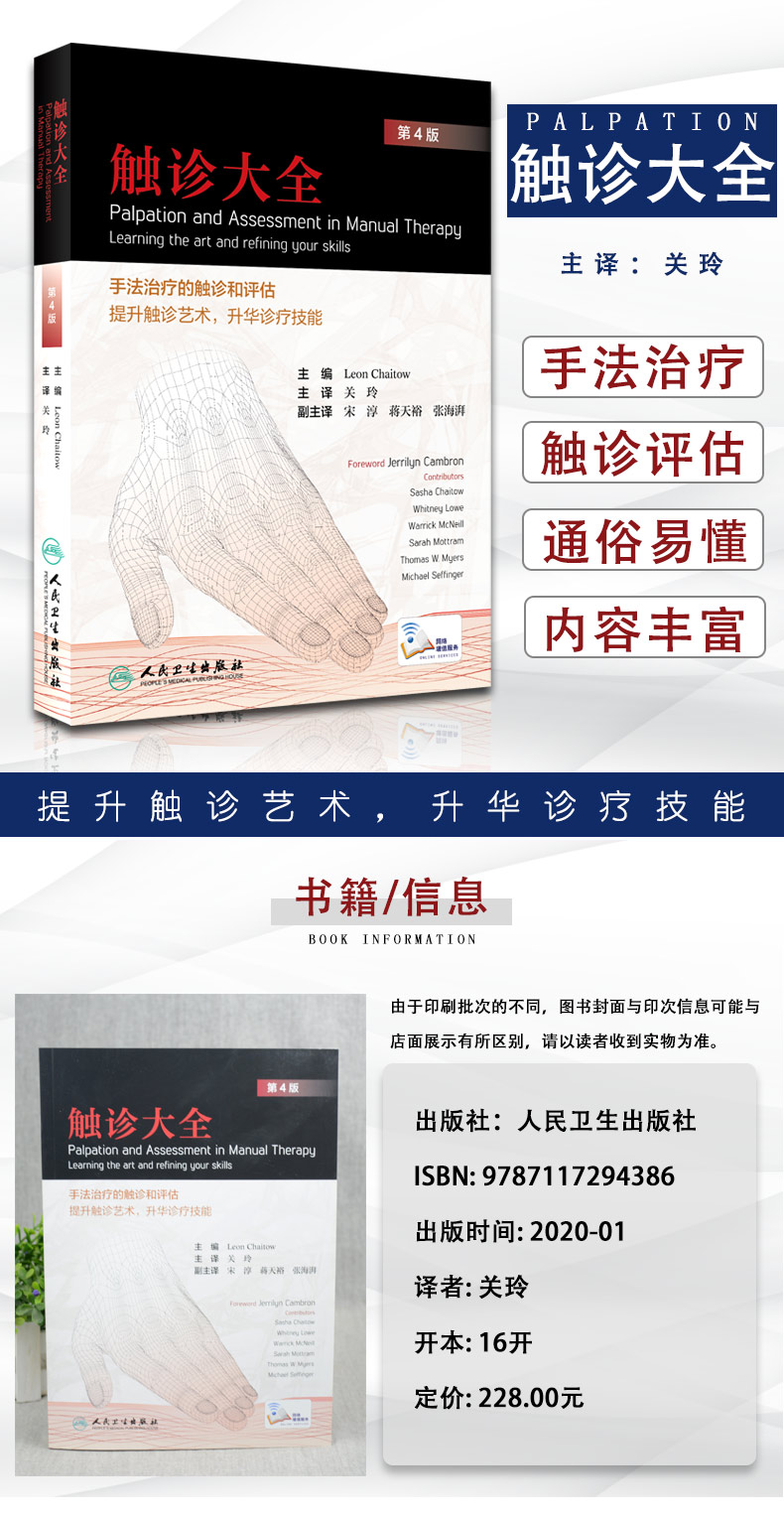 正如本书的题目“手法治疗的触诊和评估——学习触诊艺术,升华触诊技能”所说,此书是用来帮助手法治疗师理解和磨练触诊技术。这些是有效操作的核心。触诊技巧,是所有有效的手法治疗和评估的基石。使用精细触诊来检查、评估患者,对于准确理解筋膜和肌肉的潜在问题十分必要。对触诊发现的问题做精准的解释需要大量的经验,往往并不容易。本书的目的就是增加你对触诊内容的觉知,并帮助你理解所感知的东西。它是当之无愧的《触诊大全》。
