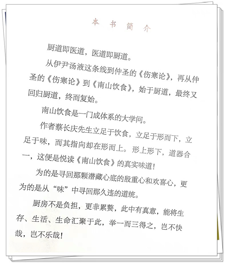 长庆先生的《南山饮食》副标题本来是味道,但顾虑到大家对太平常的字眼转不过弯来,所以于味道间加上了“之”,希望能起到一点接引的作用。味道的初意原本为了表达对道的奥妙的体味(或体察),如《后汉书•申屠蟠列传》中所言“安贫乐潜,味道守真”者是也。所以“味道”一词的本义是指向形而上的,只是走着走着,味道渐渐落到了餐桌,落回了口中,变成滋味了。品读《南山饮食》再三,深深感慨,先生立足于饮食,立足于形而下,立足于味,而其指向却在形而上。形上形下,道器合一,这便是我所读到的《南山饮食》的真实味道!