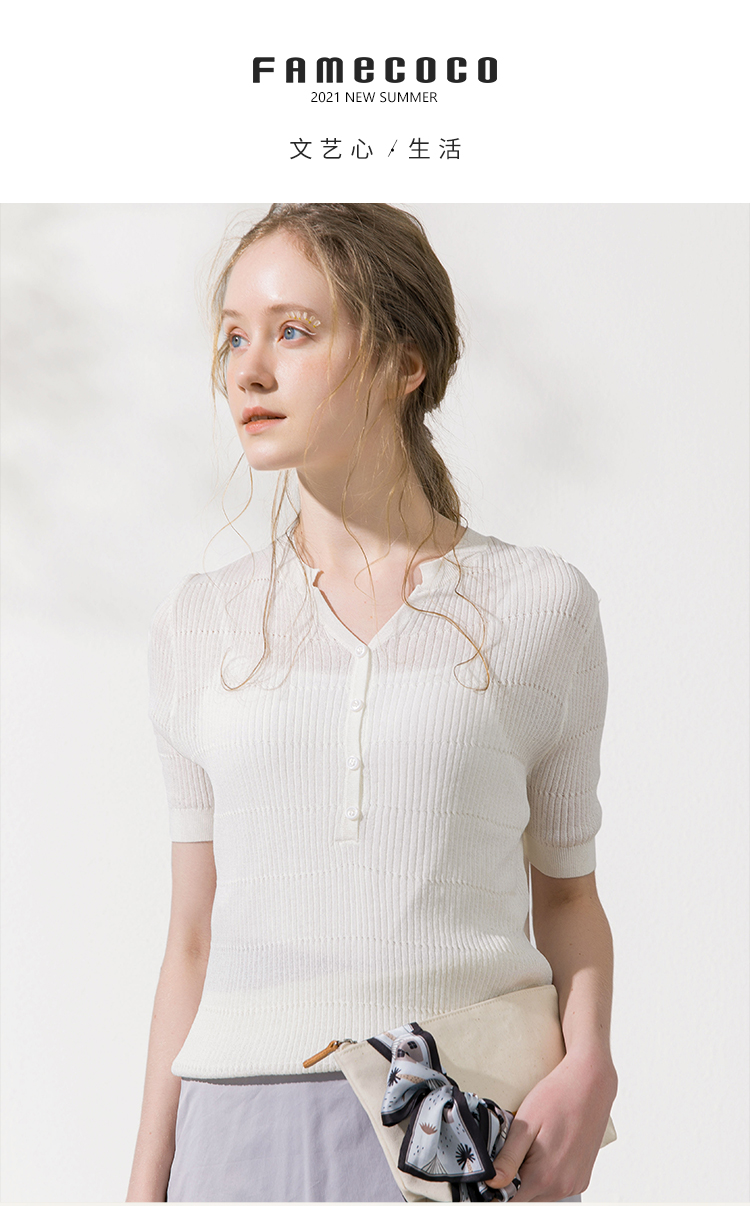 famecoco范可儿短袖女夏v领薄款套头针织衫上衣F213DB007