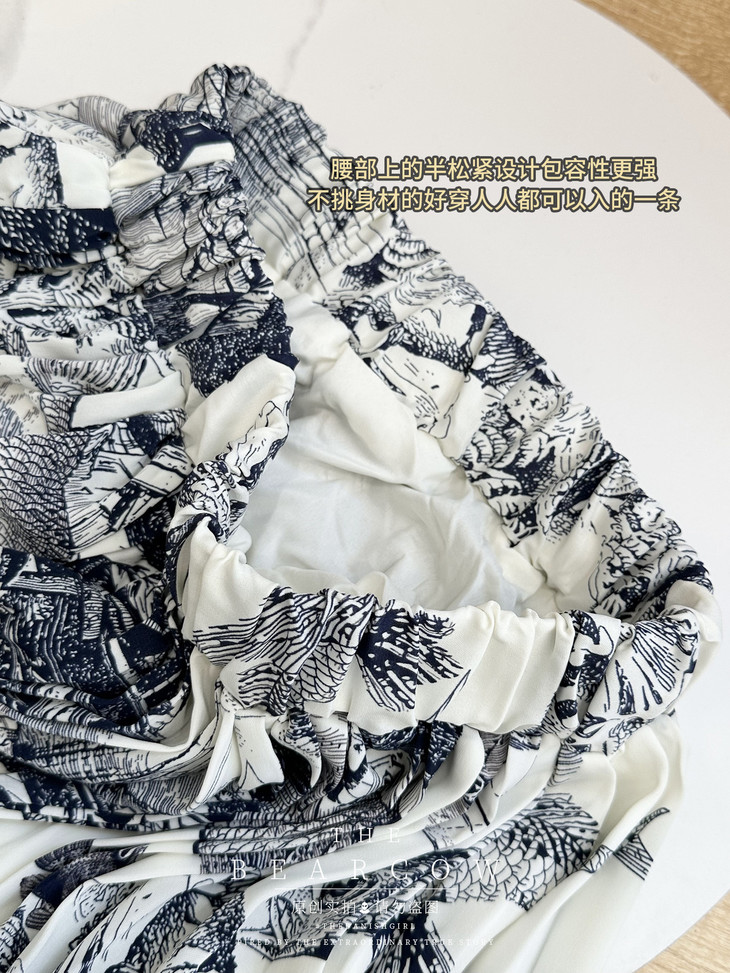 除了制作工艺,水墨风格的印花也非常复杂 光是描稿就要3~5天⚠️还要不停的去完善细节 采用三醋酸材质,挺括、抗皱又好打理❗️ 上身非常显瘦显气质❗️ 适合各种身型⚠️⚠️ 腰围超大弹力又称“魔术裙”❗️ 不限制身材❌胖瘦皆宜❗️ 为了达到好的效果 我们足足染了5版面料 颜色对了我们才开始制作上面的印花 太不容易了☹️一定是要靠抢的