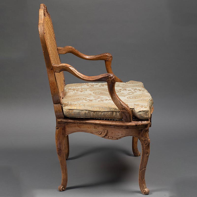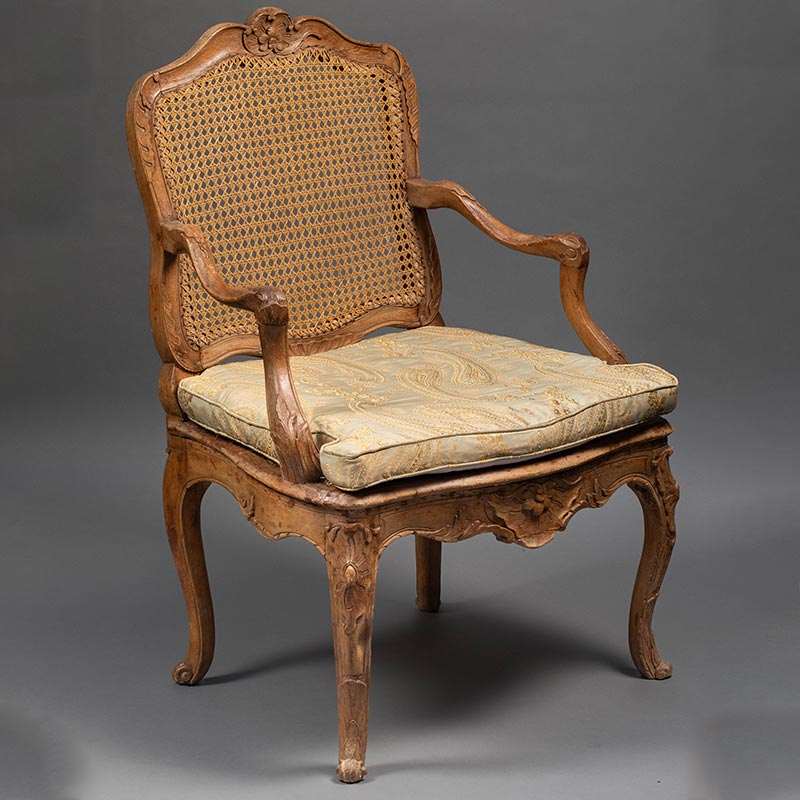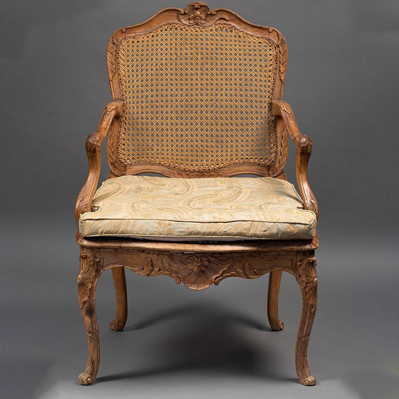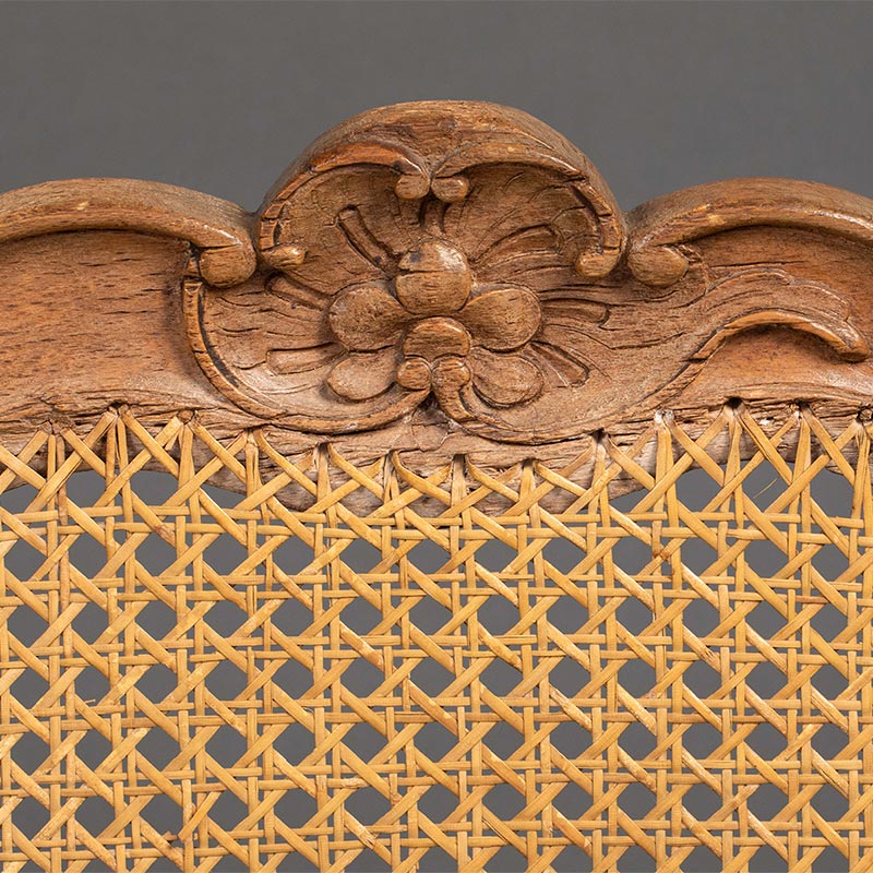 18世纪法国出品路易十五风格卷叶花卉主题榉木精雕装饰藤编椅背扶手椅