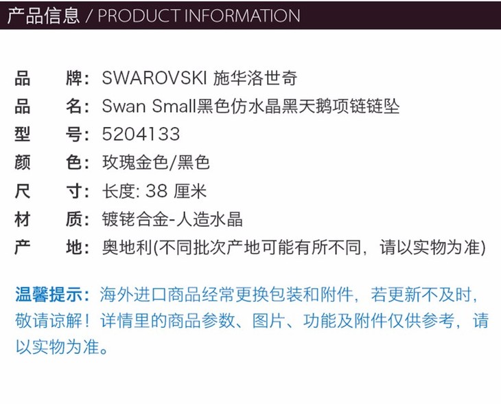 【一般贸易】Swarovski 施华洛世奇 Swan Small黑色仿水晶黑天鹅小号项链链坠 5204133