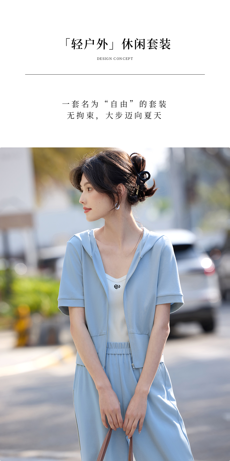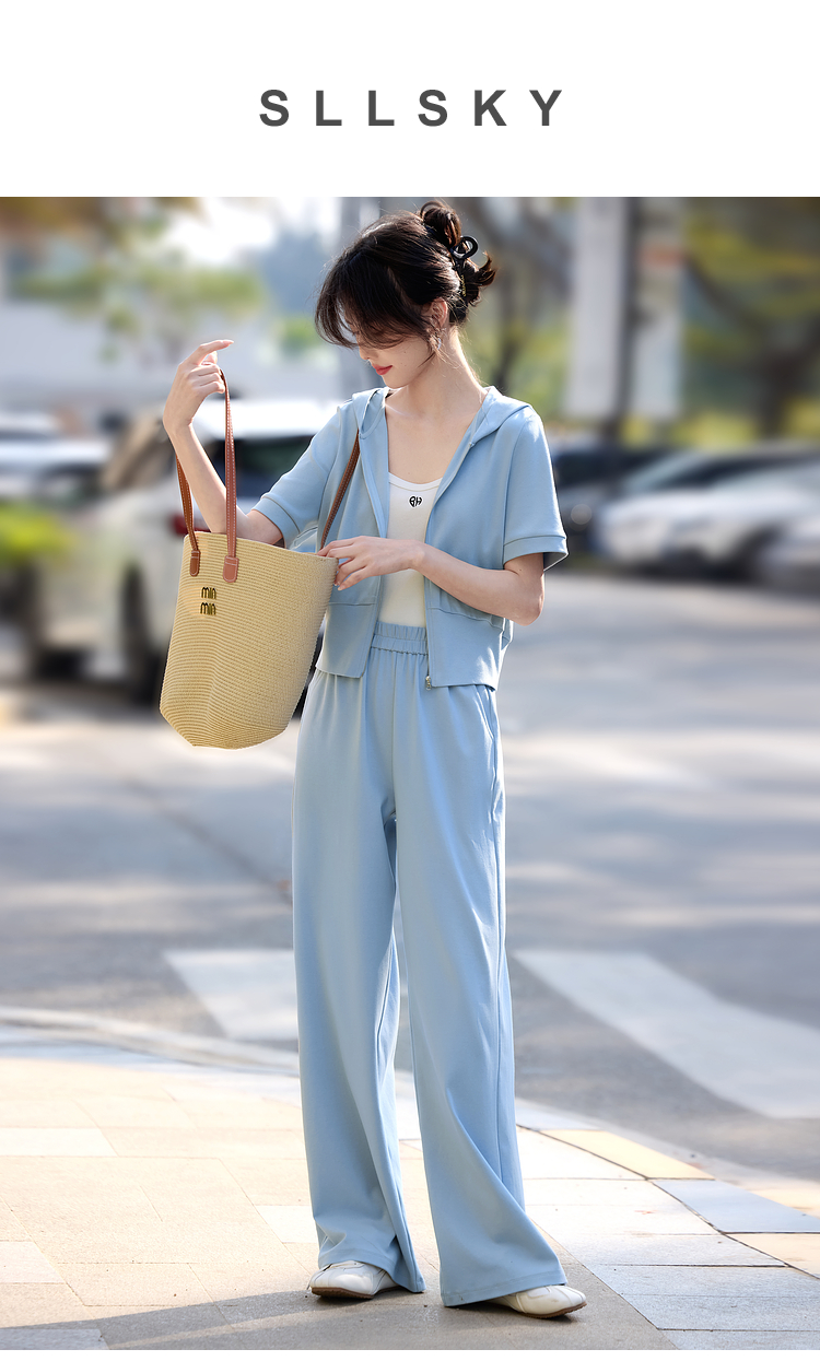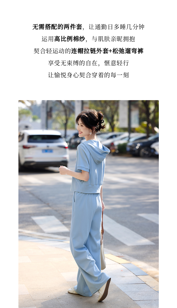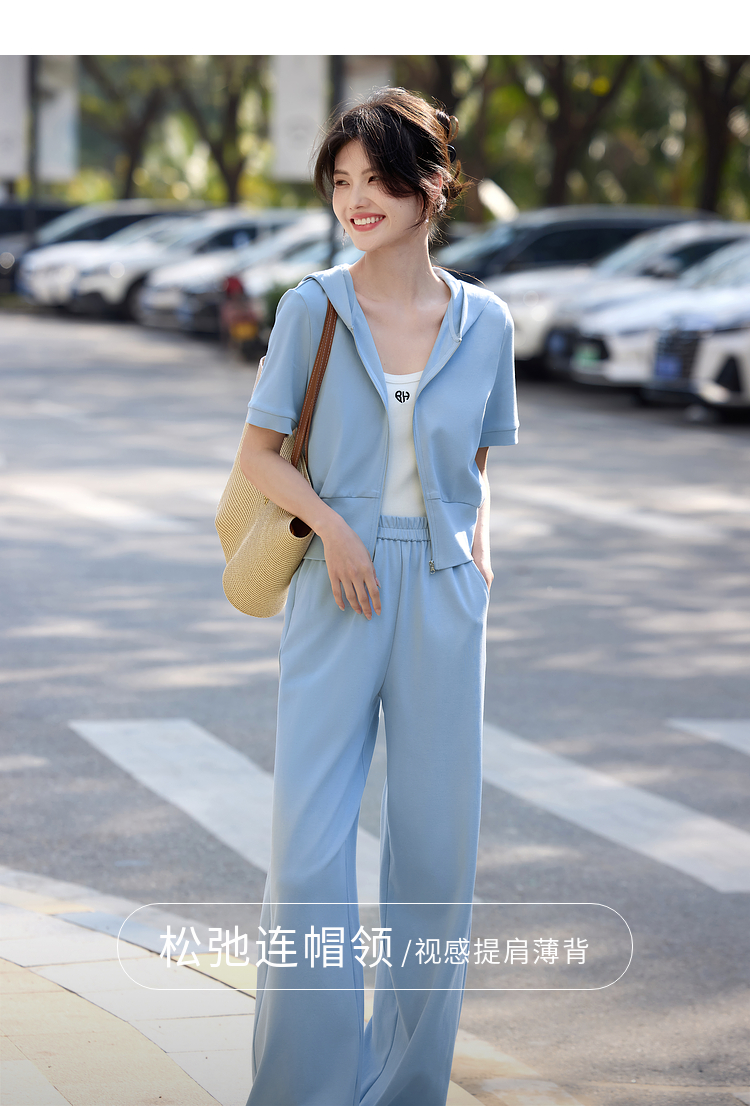 熙世界夏日穿搭套装女休闲运动短袖连帽卫衣开衫外套阔腿裤两件套