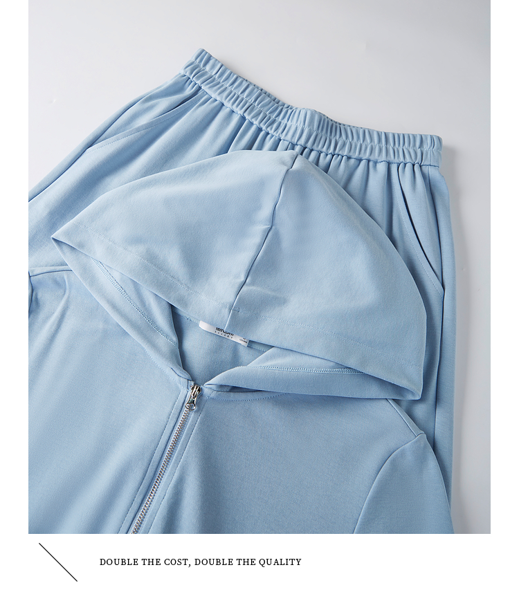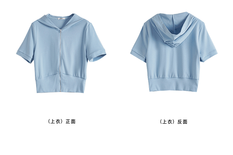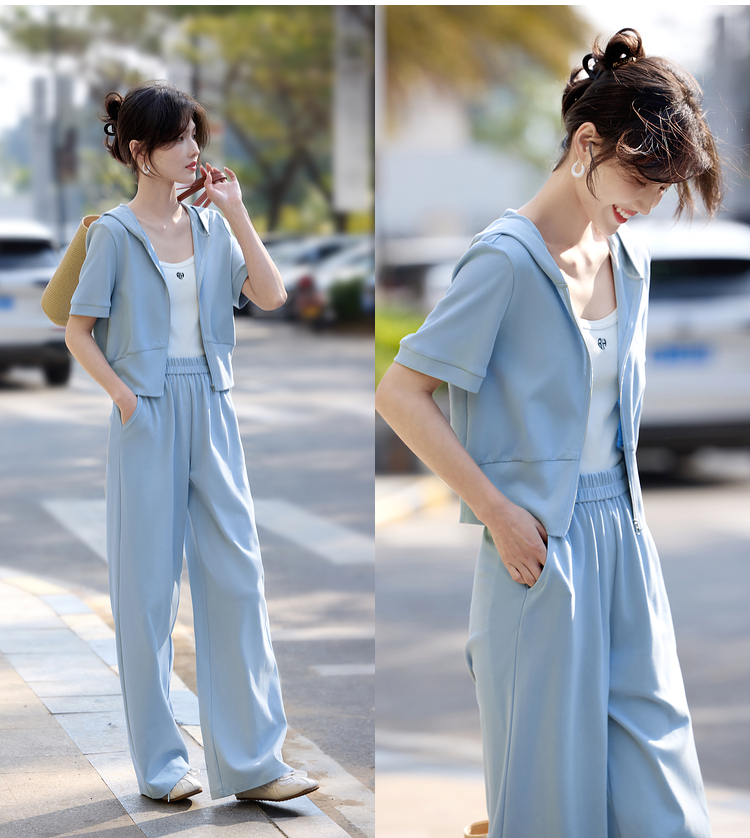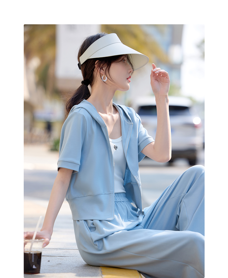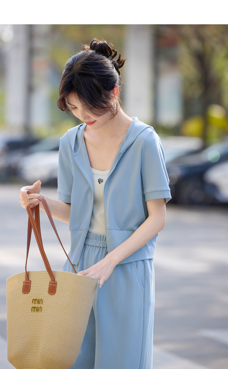 熙世界夏日穿搭套装女休闲运动短袖连帽卫衣开衫外套阔腿裤两件套