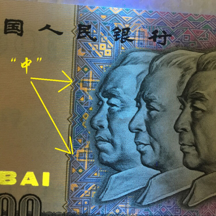 “中国梦”就是央行在90版100元身上试验下的荧光品种,其特点为: