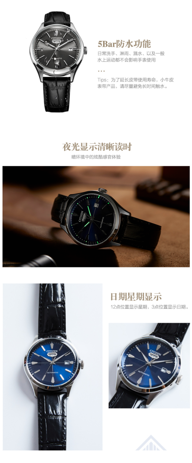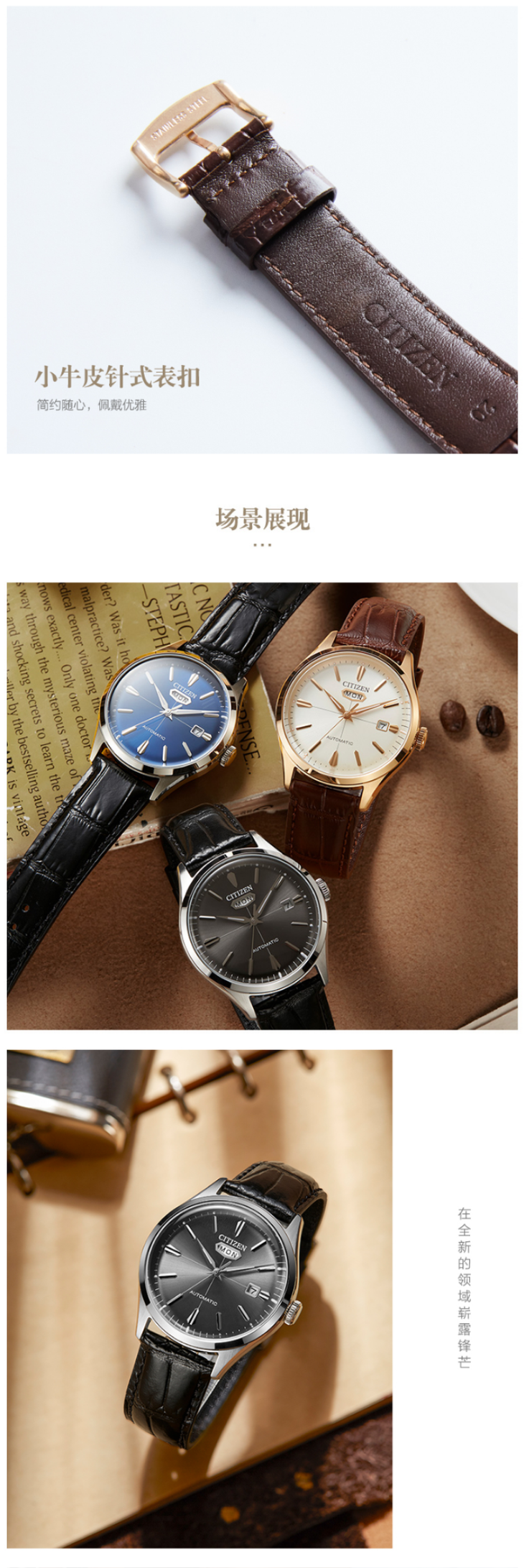 西铁城日本官方正品小牛皮带不锈钢防水机械男表NH8390-20L