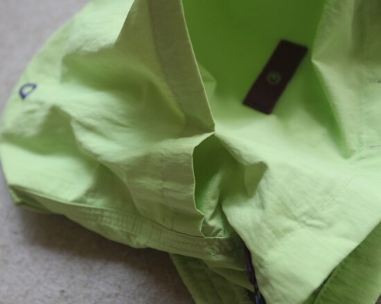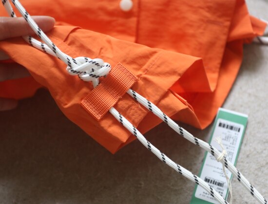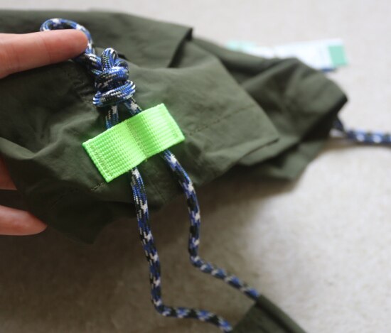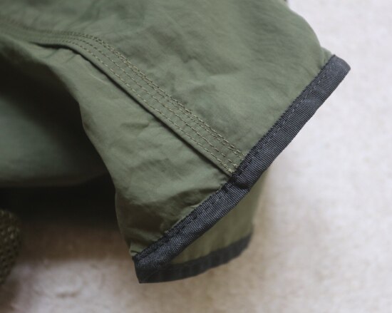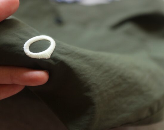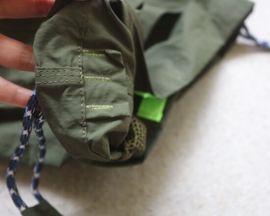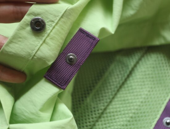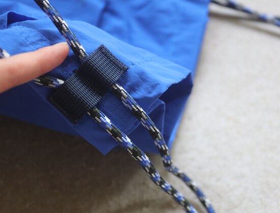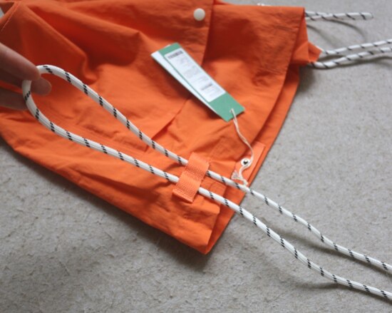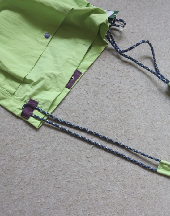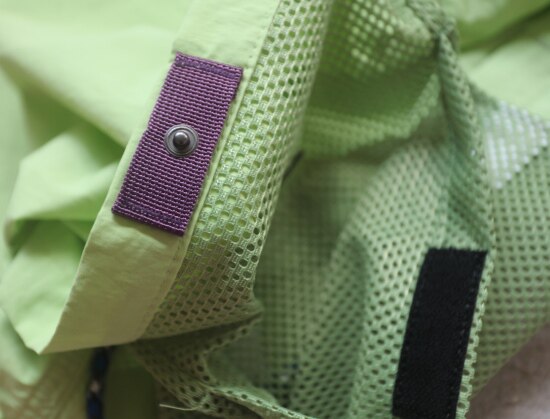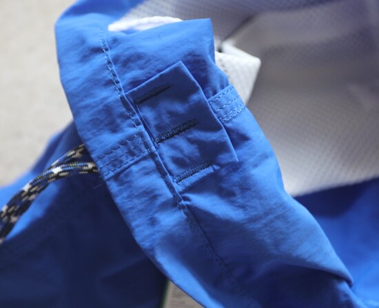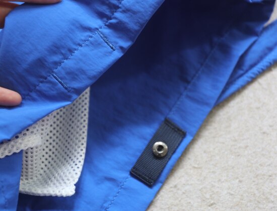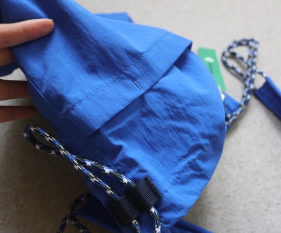 因面料软薄 所以啪啪扣 和两侧抽绳的连接处 都垫了织带 也都有加固缝线