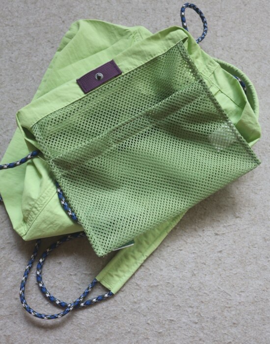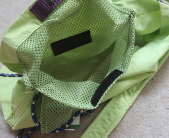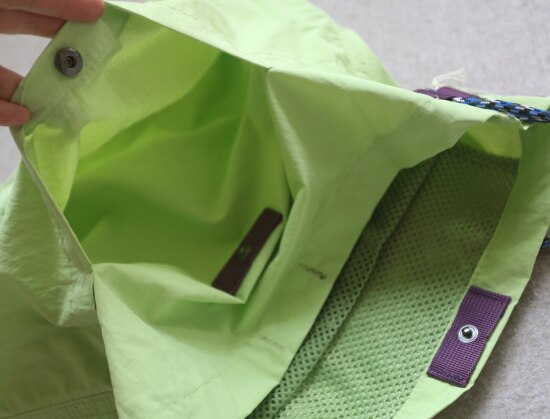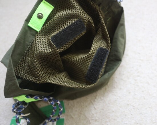 主袋 敞开式包口 中间有颗按扣 内无隔断 有个魔术贴粘扣的 网眼半贴袋