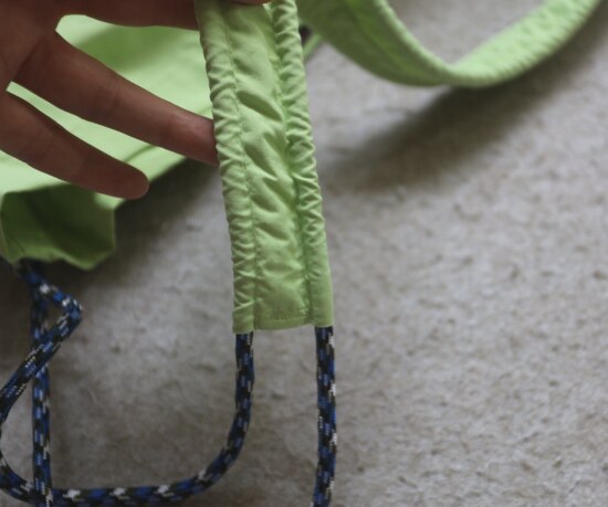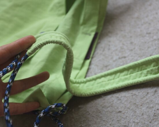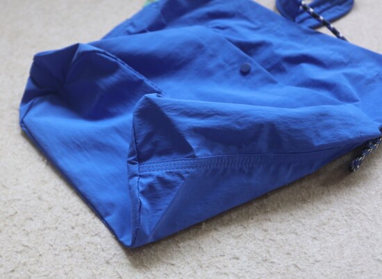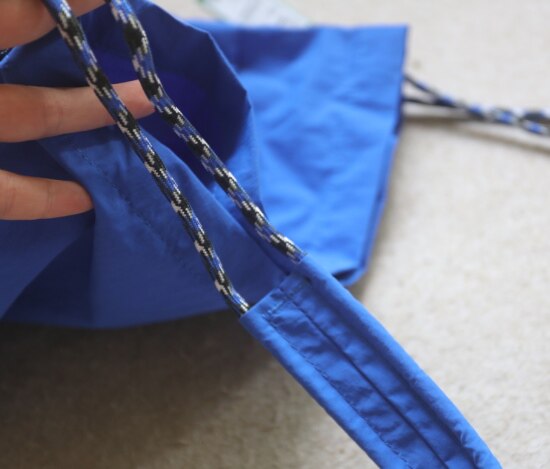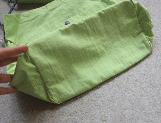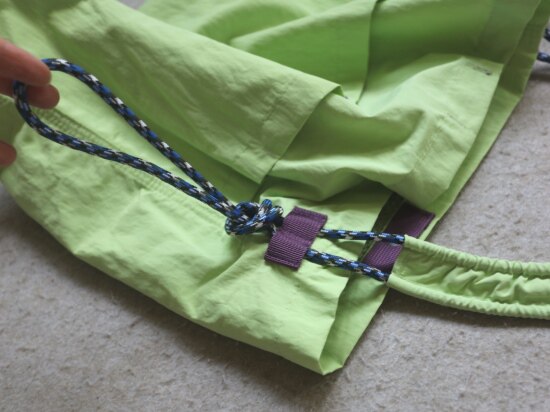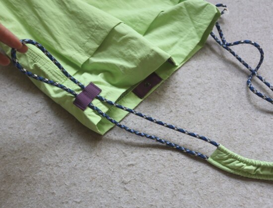 抽绳上的布袢 是可以活动的 自己调整位置便是 包底有厚度 挺能装的 哈~