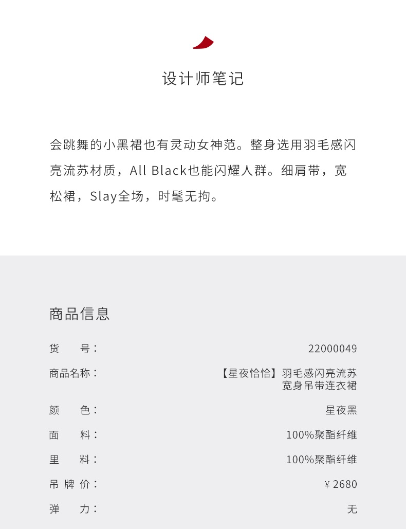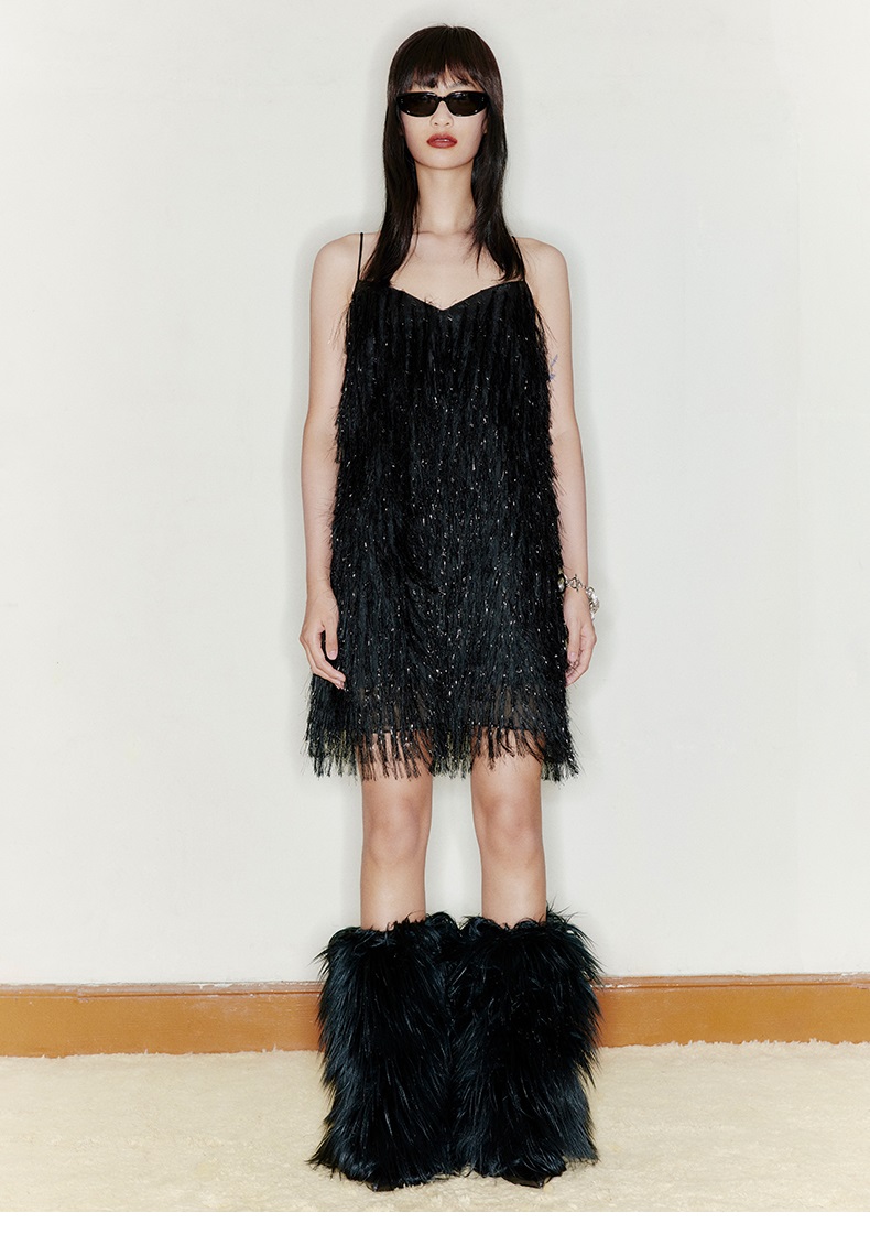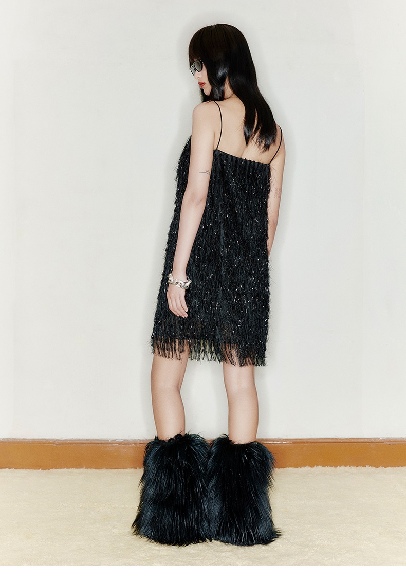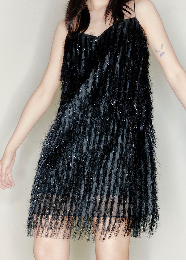 【星夜恰恰】羽毛感闪亮流苏宽身吊带连衣裙/22000049