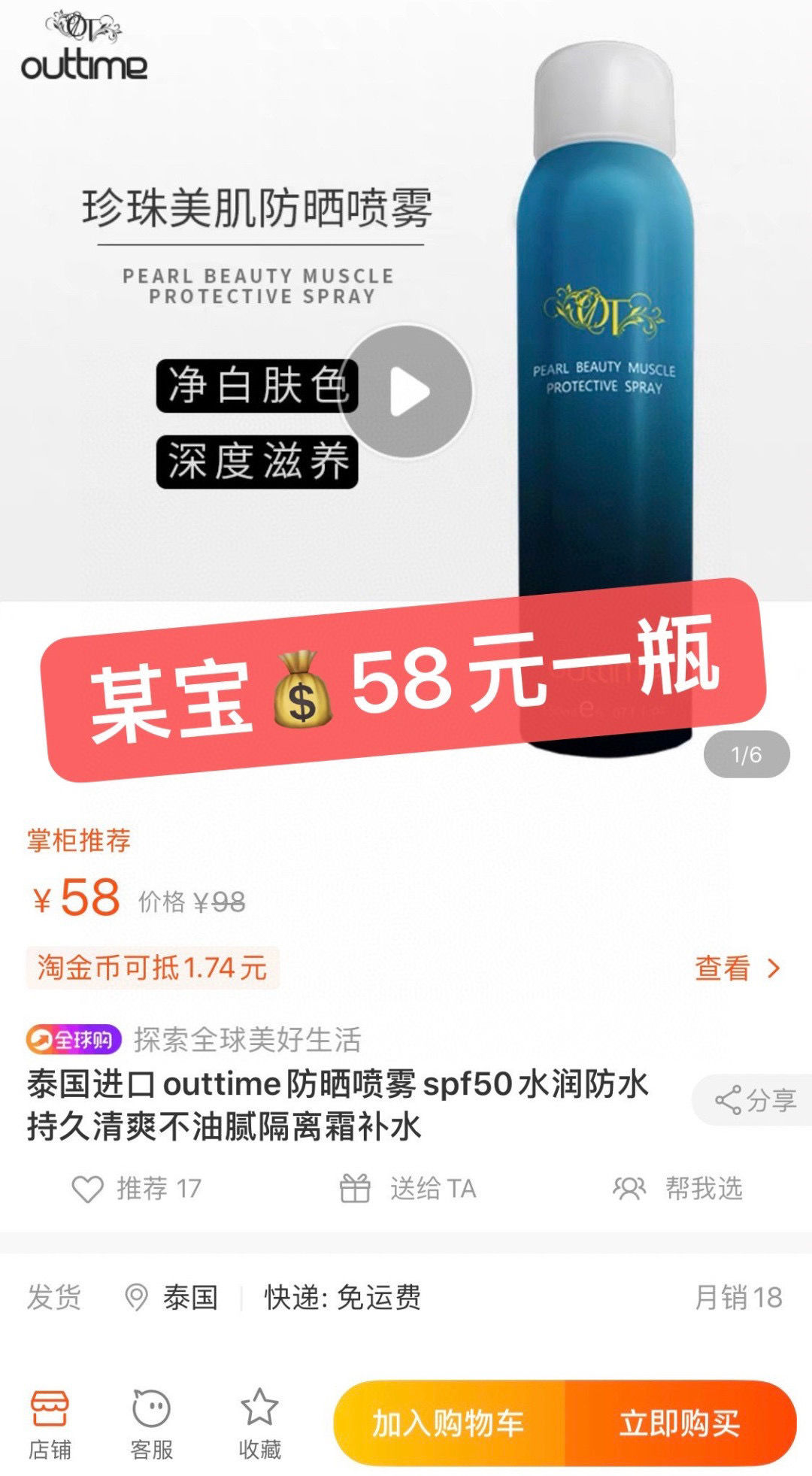 👍泰国本土超好用Outtime珍珠美肌防晒喷雾