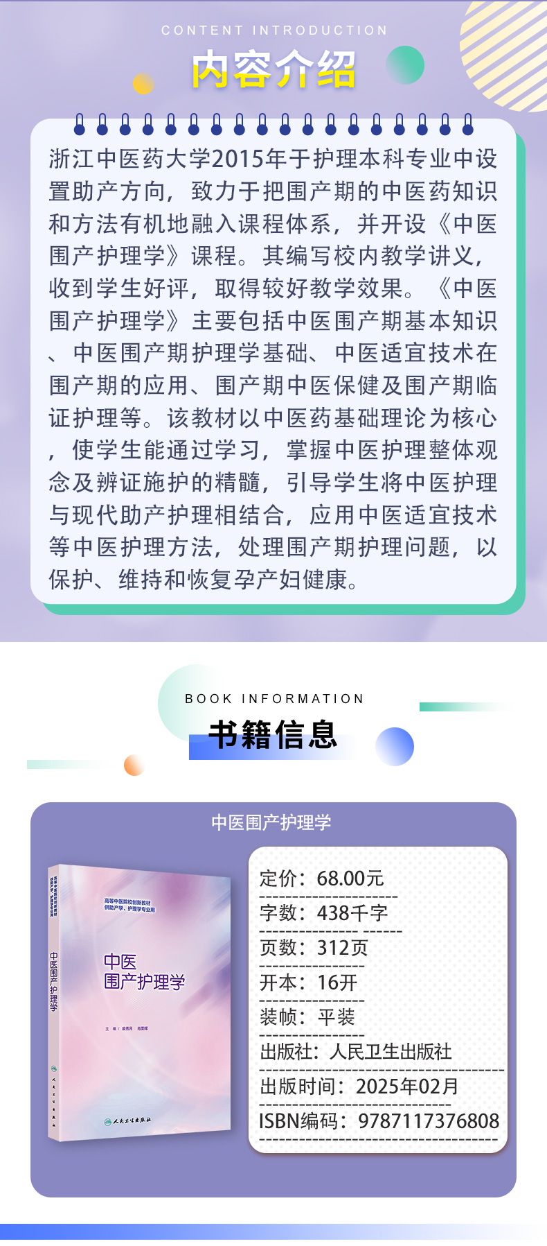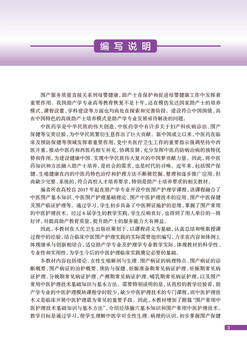 浙江中医药大学2015年于护理本科专业中设置助产方向,致力于把围产期的中医药知识和方法有机地融入课程体系,并开设《中医围产护理学》课程。其编写校内教学讲义,收到学生好评,取得较好教学效果。《中医围产护理学》主要包括中医围产期基本知识、中医围产期护理学基础、中医适宜技术在围产期的应用、围产期中医保健及围产期临证护理等。该教材以中医药基础理论为核心,使学生能通过学习,掌握中医护理整体观念及辨证施护的精髓,引导学生将中医护理与现代助产护理相结合,应用中医适宜技术等中医护理方法,处理围产期护理问题,以保护、维持和恢复孕产妇健康。