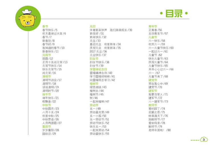目录 春节 春节快乐/5 欢天喜地过大年/6 春节/7 新春到/8 春节好/9 我知道的春节/10 新春快乐/11 元宵节 团圆/12 正月十五闹元宵/13 元宵节快乐/14 快乐元宵节/15 闹元宵/16 清明节 清明节诗会/17 清明节/18 话说清明/19 清明时节/20 端午节 端午快乐/21 粽飘香/22 中秋节 中秋圆月/23 八月十五/24 欢度中秋/25 中秋思语/26 人月两团圆/27 重阳节 岁岁重阳/28 踏秋日/29 元旦 伴着新年钟声 我们渐渐成长/30 新年好 /31 新年快乐/32 元旦/33 喜迎元旦 欢度新年/34 庆祝元旦 欢度新年/35 2017元旦/36 元旦快乐/37 妇女节 妇女节快乐/38 妇女节/39 学雷锋纪念日 雷锋精神永存/40 学习雷锋好榜样/41 向雷锋同志学习/42 植树节 绿色地球/43 植树去/44 植树节/45 树/46 一起来植树/47 劳动节 五一/48 劳动光荣/49 五一小报/50 五一劳动节/51 劳动节快乐/52 快乐五一/53 一起来劳动/54 劳动快乐/55 青年节 正青春/56 五四青年节/57 儿童节 六一快乐/58 欢庆六一/59 六一儿童节快乐/60 一起过六一/61 儿童节 /62 快乐儿童节/63 庆祝儿童节/64 儿童节快乐/65 开开心心过六一/66 六一 /67 儿童节来了/68 建党节 党在我心中/69 建党节/70 建军节 我要当军人/71 建军节/72 八一建军节/73 教师节 爱的园丁/74 启蒙之恩/75 桃李满天下/76 致教师节/77 爱如母亲/78 教师节/79 老师辛苦啦!/80 国庆节 国庆佳节/81 国庆快乐/82 举国同庆/83 十—庆国庆/84 欢度国庆/85 国庆大联欢/86 母亲节 母亲节快乐!/87 妈妈我爱您/88 我爱妈妈/89 母亲/90 亲亲妈妈/91 祝福母亲节/92 妈妈我爱你/93 妈妈/94 感谢妈妈/95 父亲节 欢乐父亲节/96 爸爸我爱你/97 父亲节快乐/98 父爱如山/99 有你真好/100 我爱爸爸/101 父子情深/102 爸爸我爱您/103 祝爸爸永远开心/104 快乐老爸/105 圣诞节 缤纷圣诞/106 圣诞快乐/107 我们的圣诞/108 欢乐圣诞/109 平安夜/110 圣诞节/111 快乐圣诞节/112 圣诞狂欢/113 万圣节 奇幻万圣节/114 疯狂万圣/115 万圣节联欢/116 万圣节由来/117 万圣节南瓜/118 面具时间/119 感恩节 感恩在我心/120 感恩节快乐/121 复活节 复活节/122 复活节快乐/123 欢乐复活节/124 复活彩蛋/125 纪念日 中国少年先锋队/126 一*·九运动/127 纪念日/128 勿忘九一八/129 中国人民抗日战争胜利纪念日/130 宣传日 全国公民道德日/131 中国消防安全日/132 法制我宣传/133 安全在心中/134 中小学生安全教育日/135 爱的奉献/136 爱眼日/137 心灵之窗/138 全国爱耳日/139 保护听力/140 护齿计划/141 养成护齿习惯/142 洗*日/143 家庭日/144 烟的危害/145 拒绝**烟/146 世界日 联合国日/147 世界粮食日/148 国际奥林匹克日/149 世界森林日/150 人权日/151 世界地球日/152 世界卫生日/153 世界水日/154 保护水资源/ 155 世界环境日/156 世界动物日/157 保护动物/158 世界知识产权日/159 世界旅游日/160 |