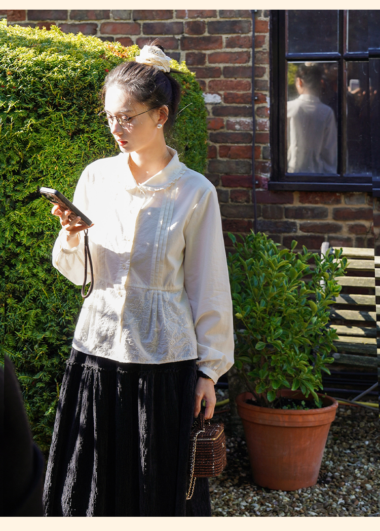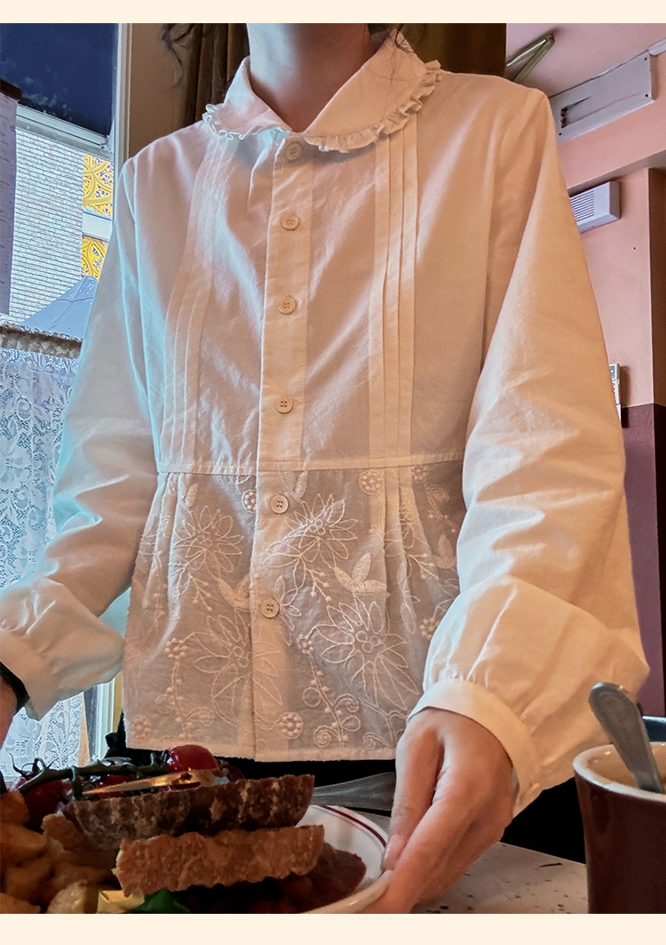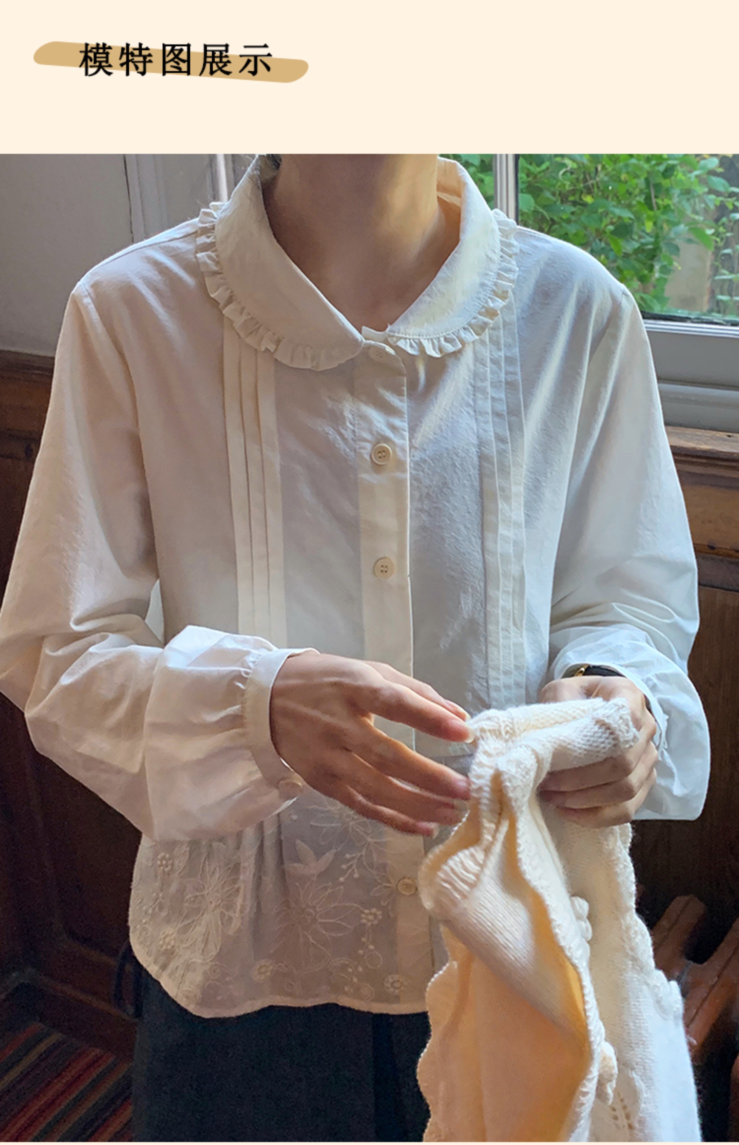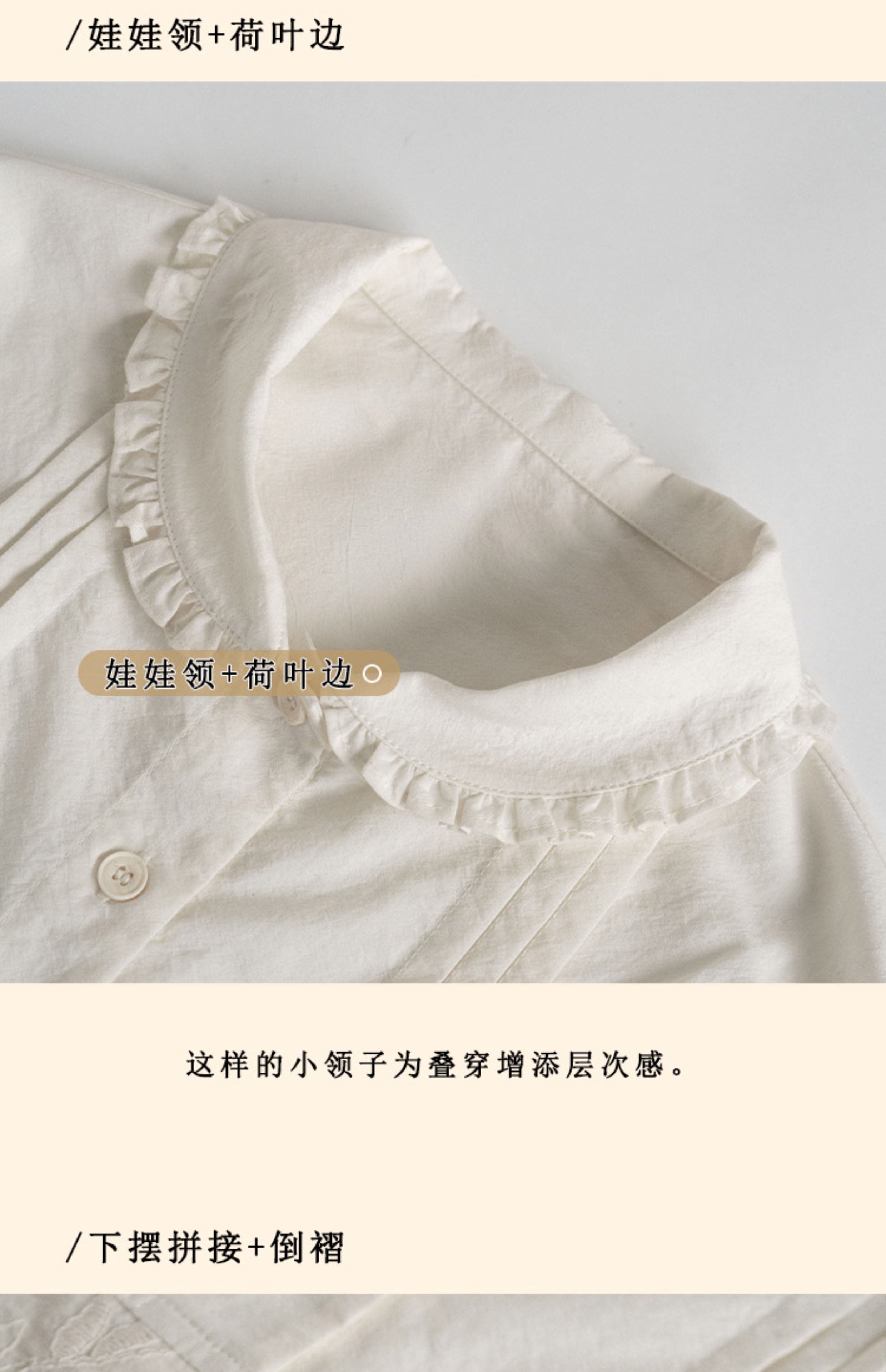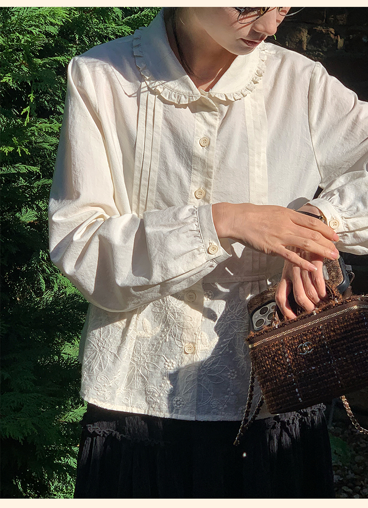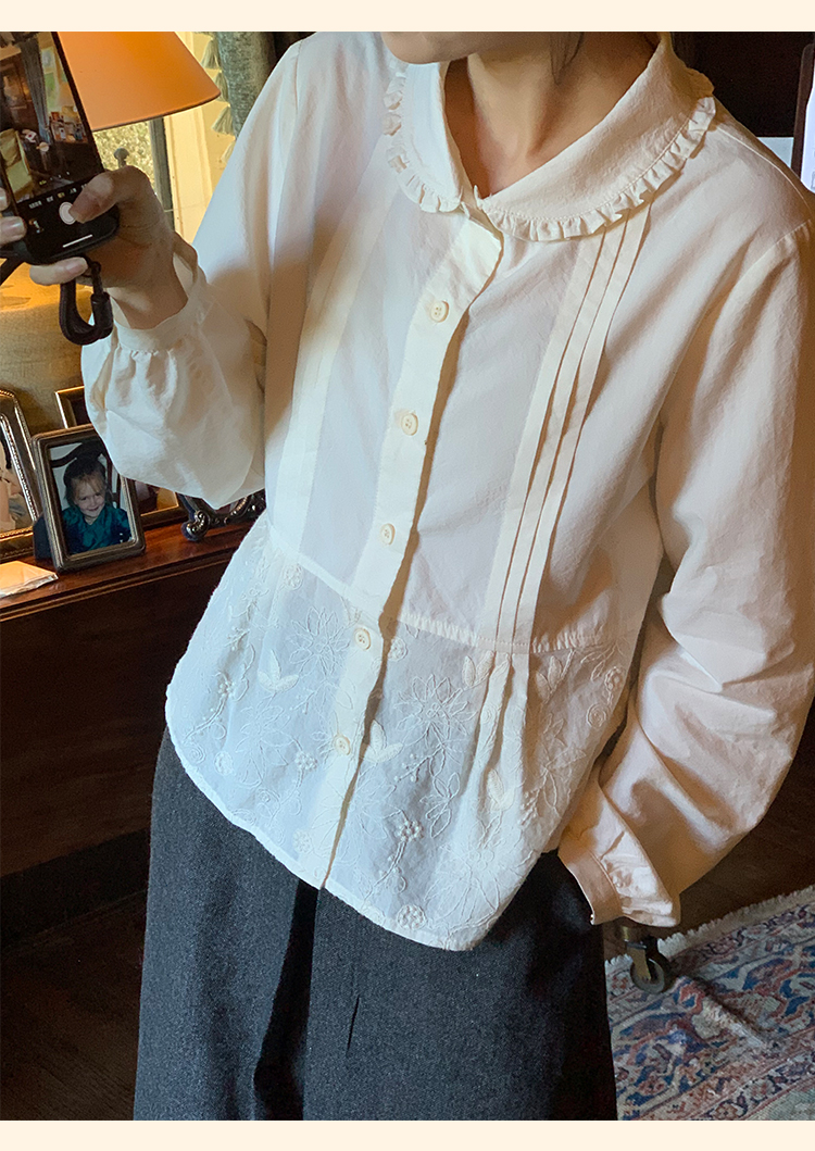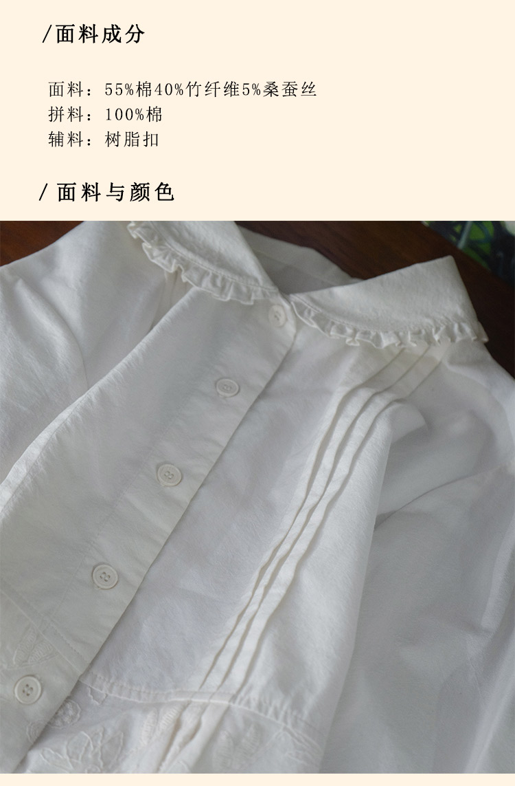浮生八记/24D160/蚕丝棉重工刺绣拼接娃娃领复古法式米色衬衫