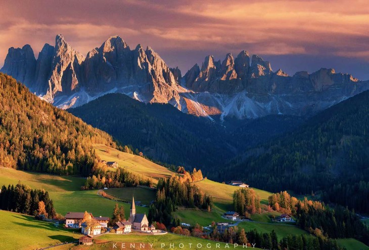 乘车前往多洛米蒂山区,位于意大利境内的东阿尔卑斯山脉,这里风景如画,被联合国列为世界自然遗产,也被称为"阿尔卑斯山天堂"。拍摄 St. Jakob 教堂+秋色山林,傍晚在号称在全球最上镜的富内斯山谷拍摄绝美的日落景色。