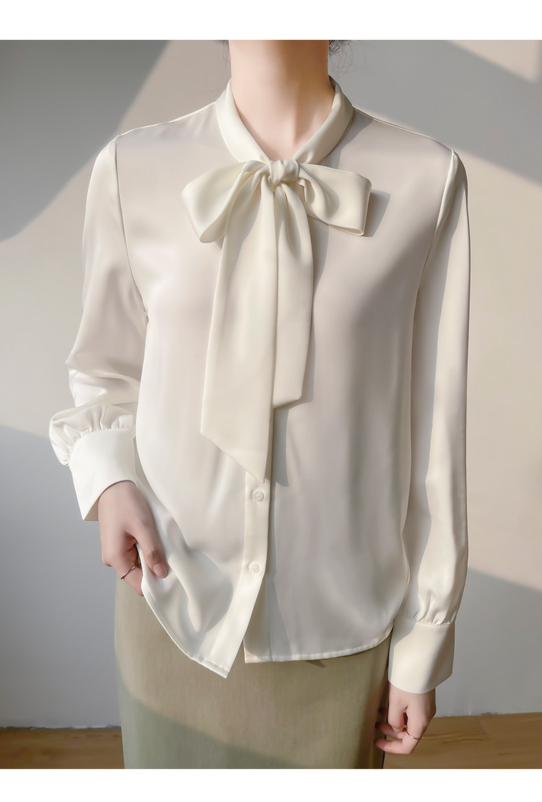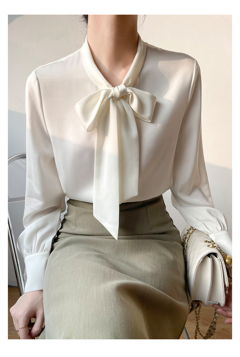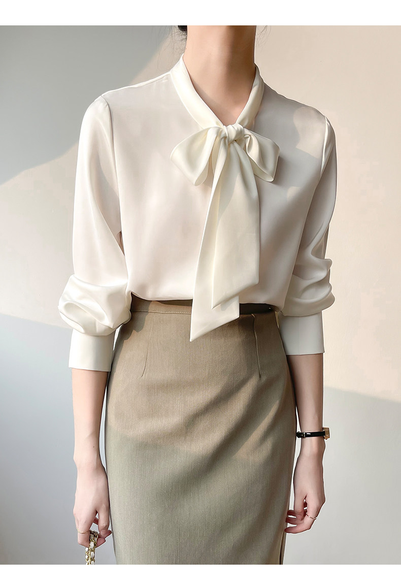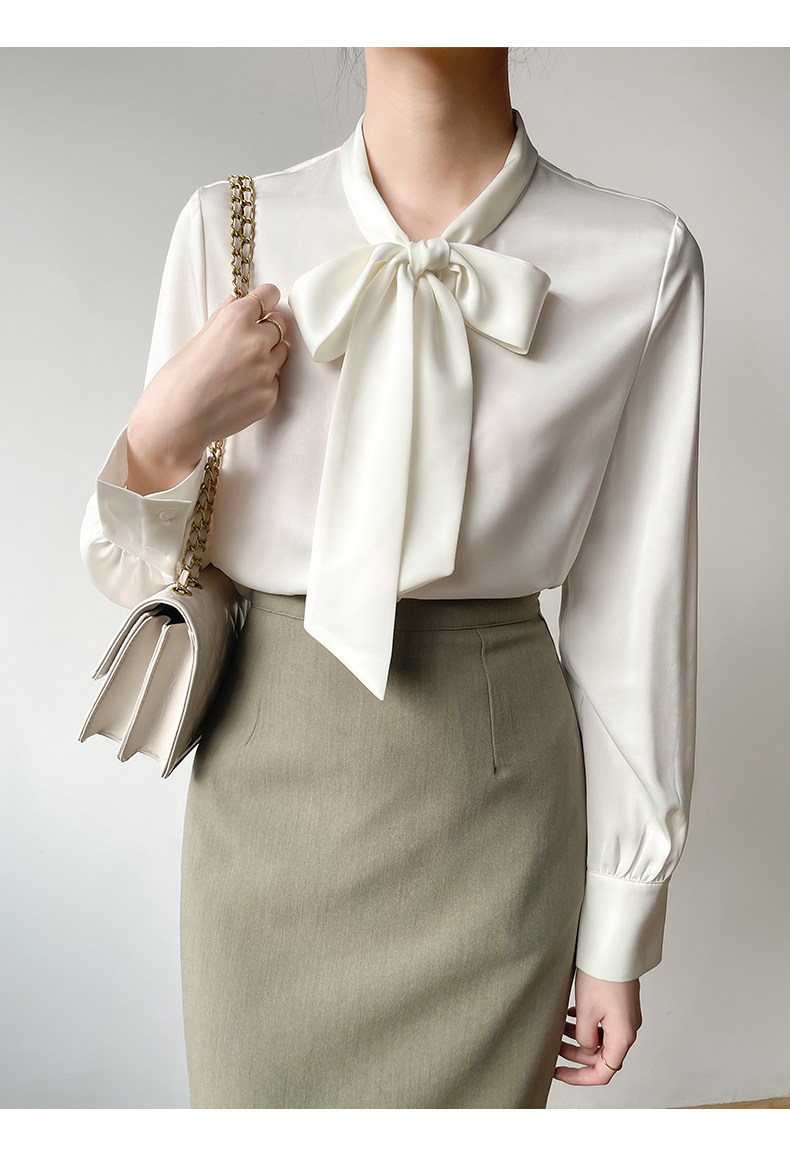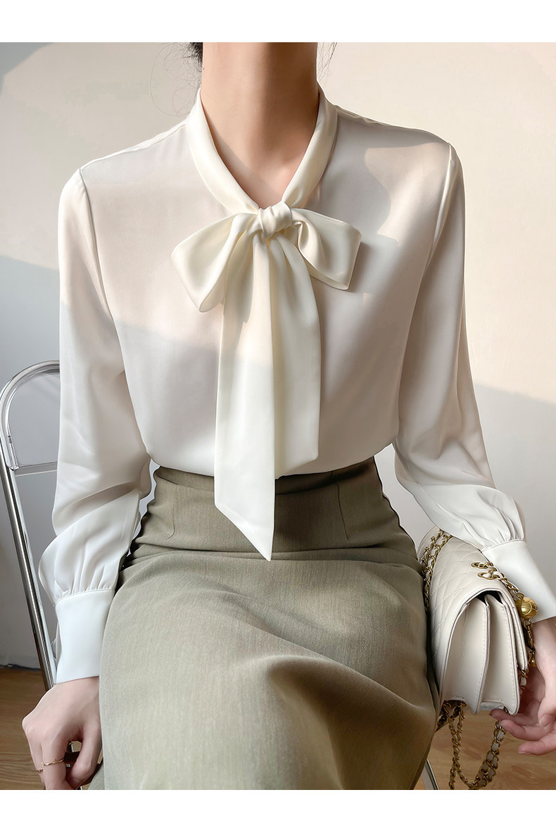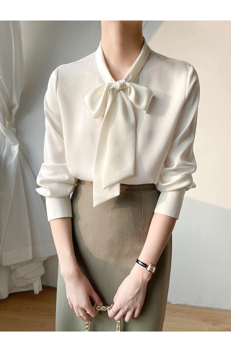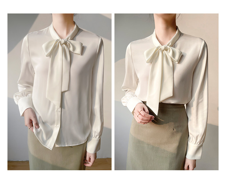 【缎面白色衬衫】春秋长袖通勤职业衬衣 气质蝴蝶结飘带衣柔光缎面
